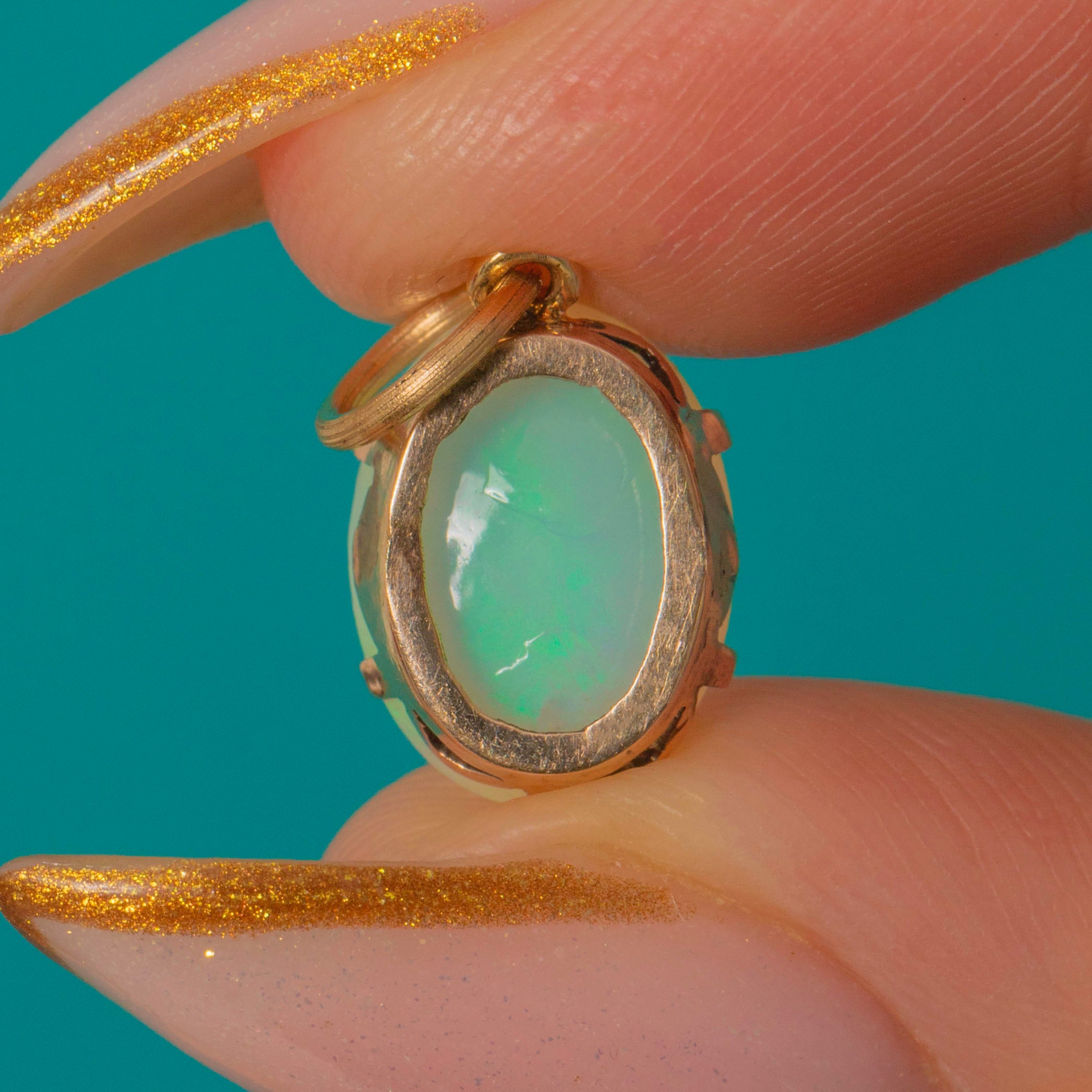 This exquisite Art Deco Opal charm is an iridescent beauty. The solid 1.43ct Opal glows with vivid flashes of green, pink, and orange, shimmering beautifully from every angle.