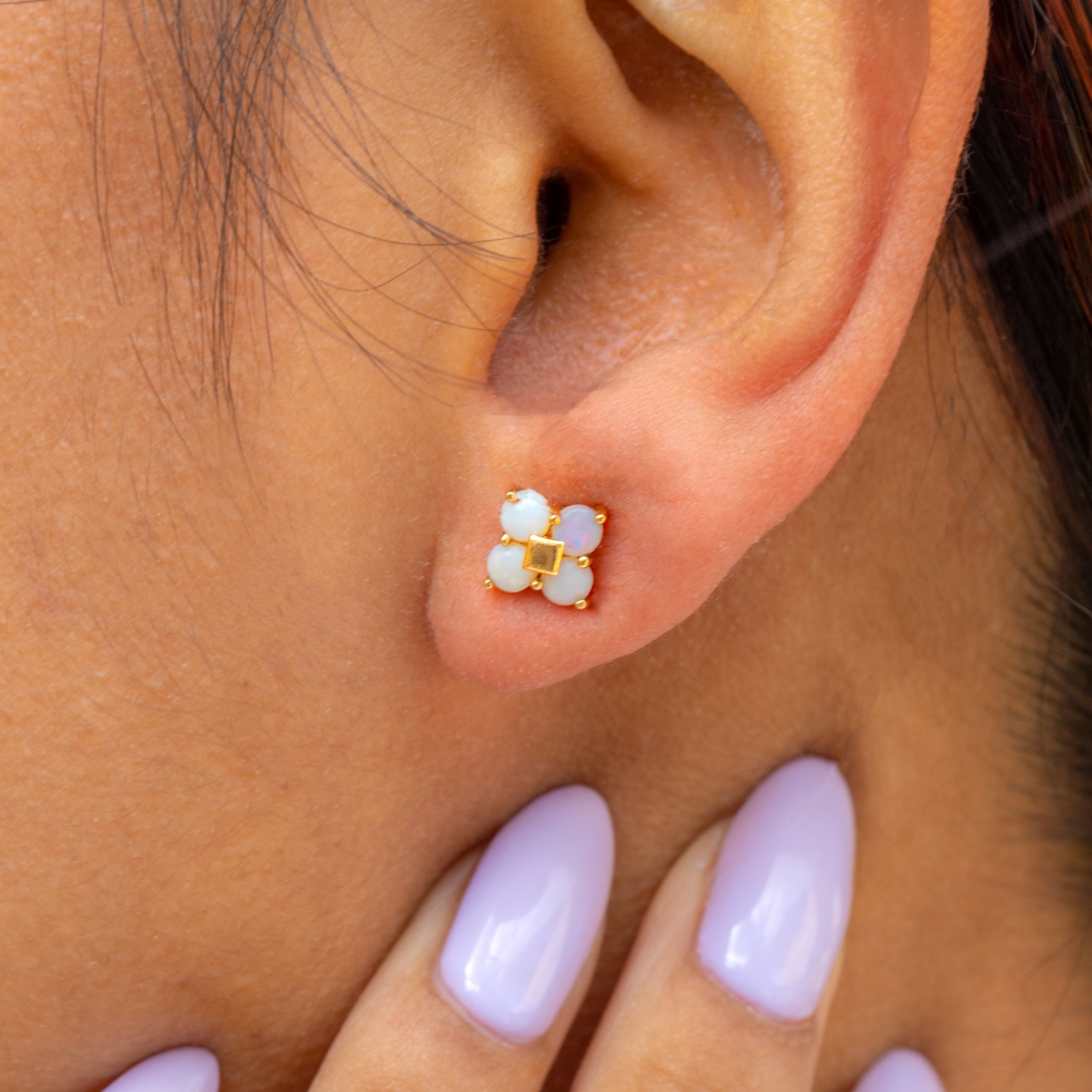 Akin to dainty daisies, these 10ct Gold Opal flower cluster stud earrings are just the sweetest pair! Not just any daisy, each petal is a cabochon-cut Opal that offers subtle galactic hues of neon yellow and vivid peach as they dance beneath the light.
