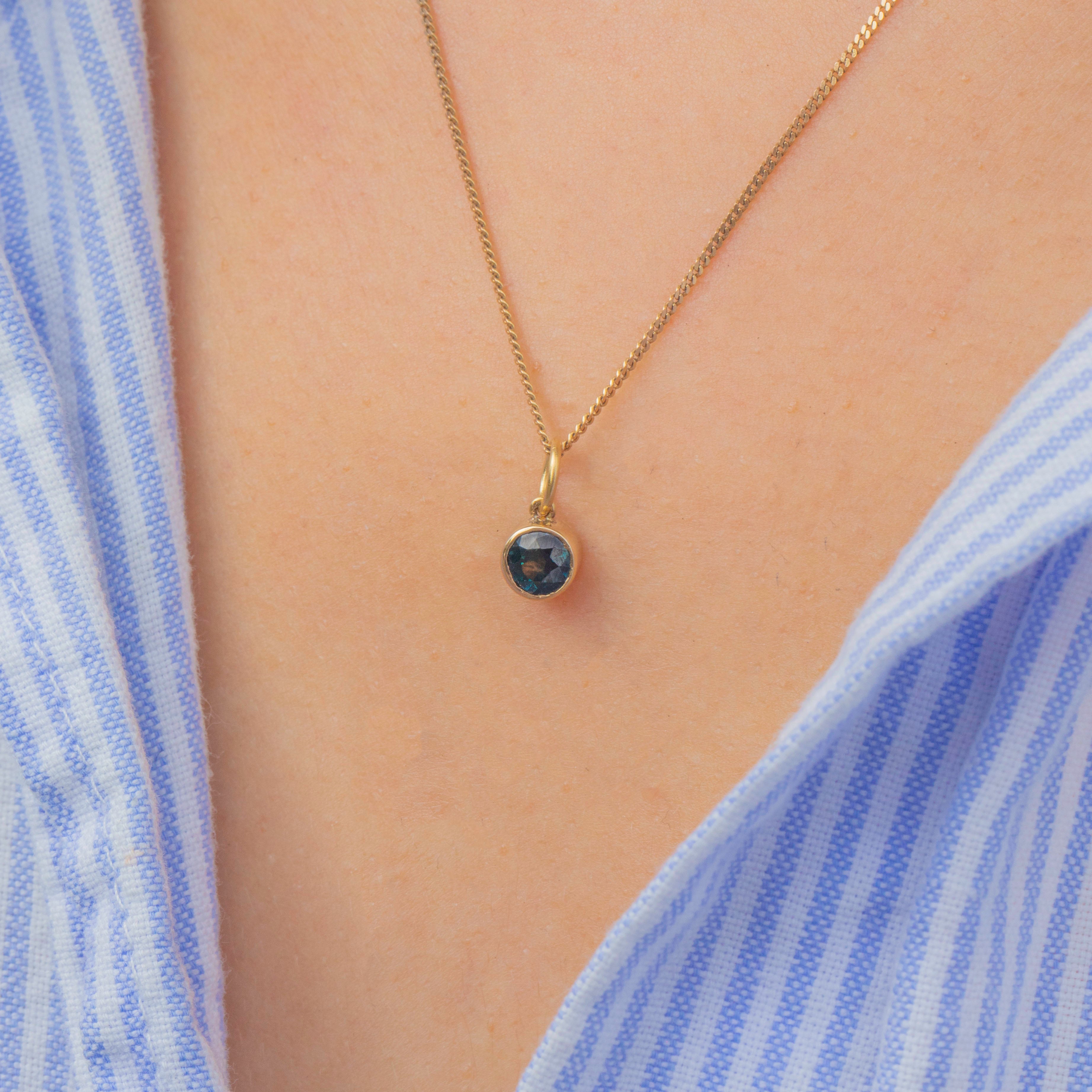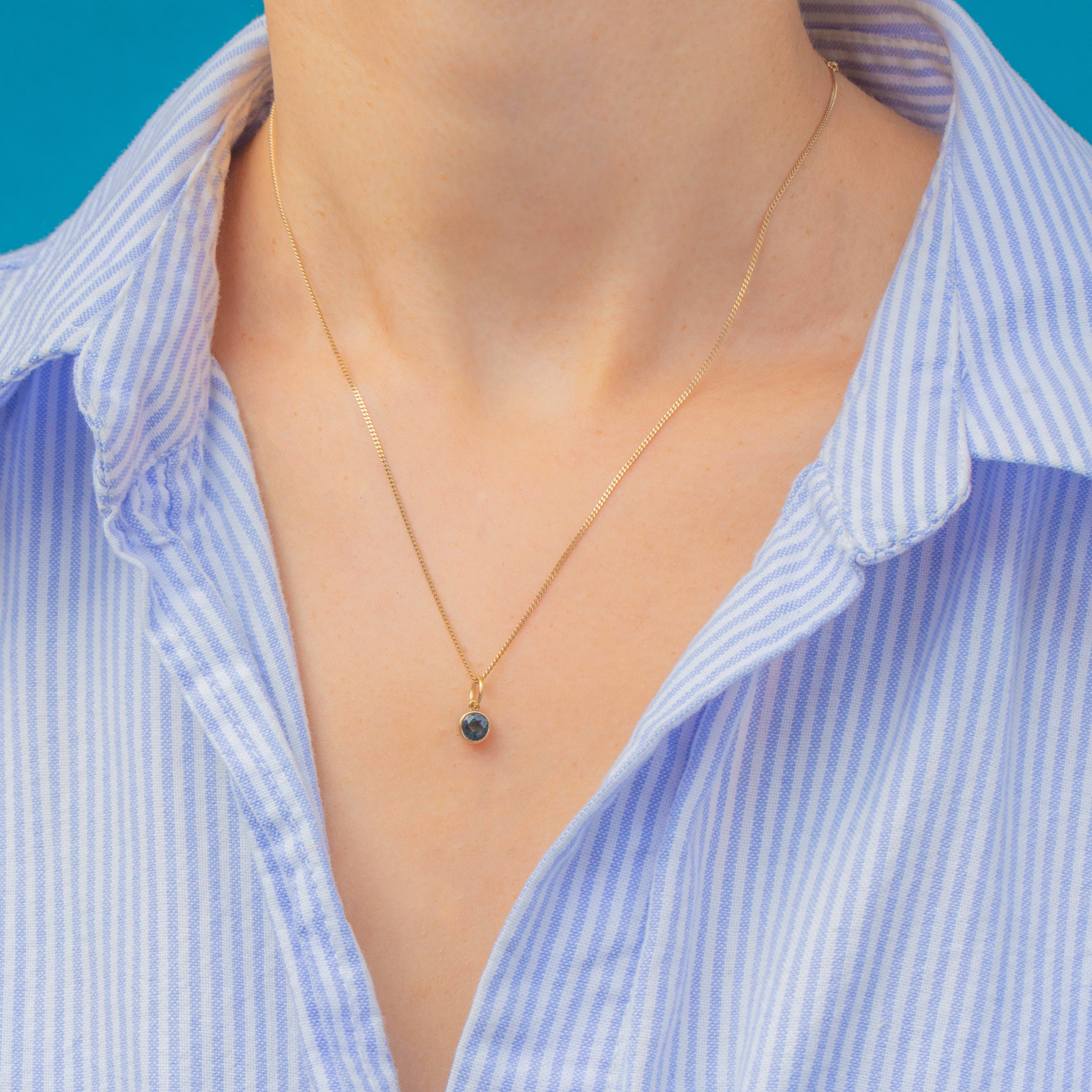 A striking Vintage charm pendant featuring a vivid Blue Sapphire bezel-set in 14ct Gold. The round faceted Sapphire shows a gorgeous deep teal-blue hue, full of life and sparkle when it catches the light.