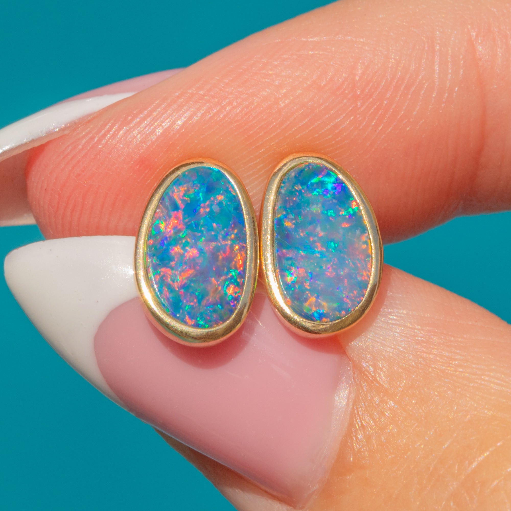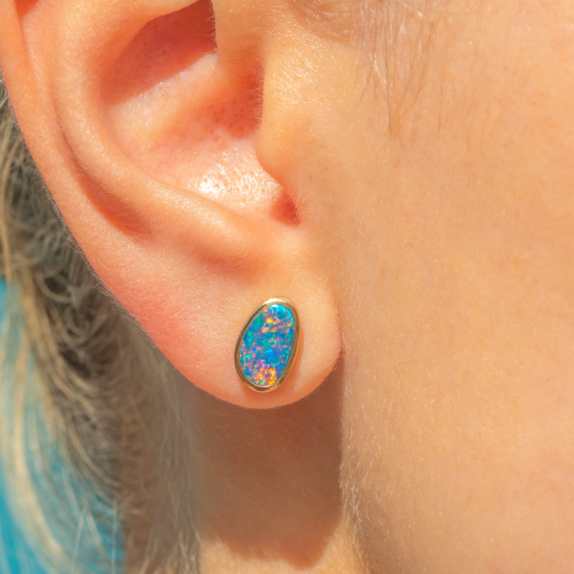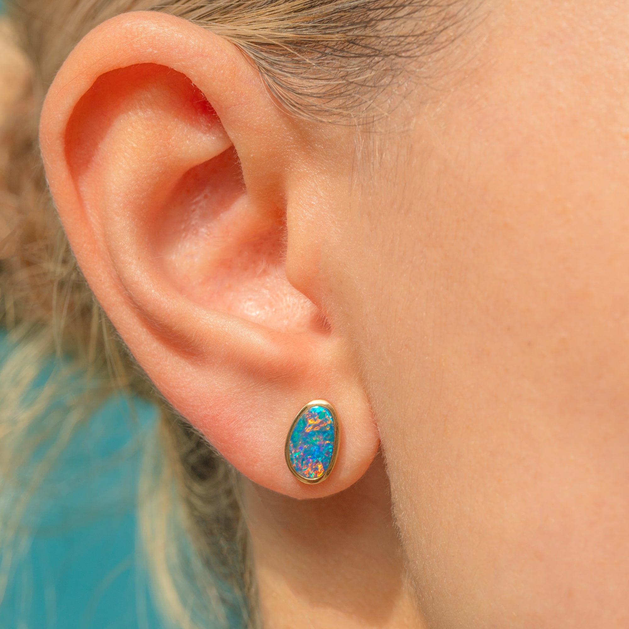 Crafted from bright and glossy 14ct Gold, these earrings each feature a saturated blue Boulder Opal, projecting a kaleidoscope of pink, green and orange flashes as it catches the light.