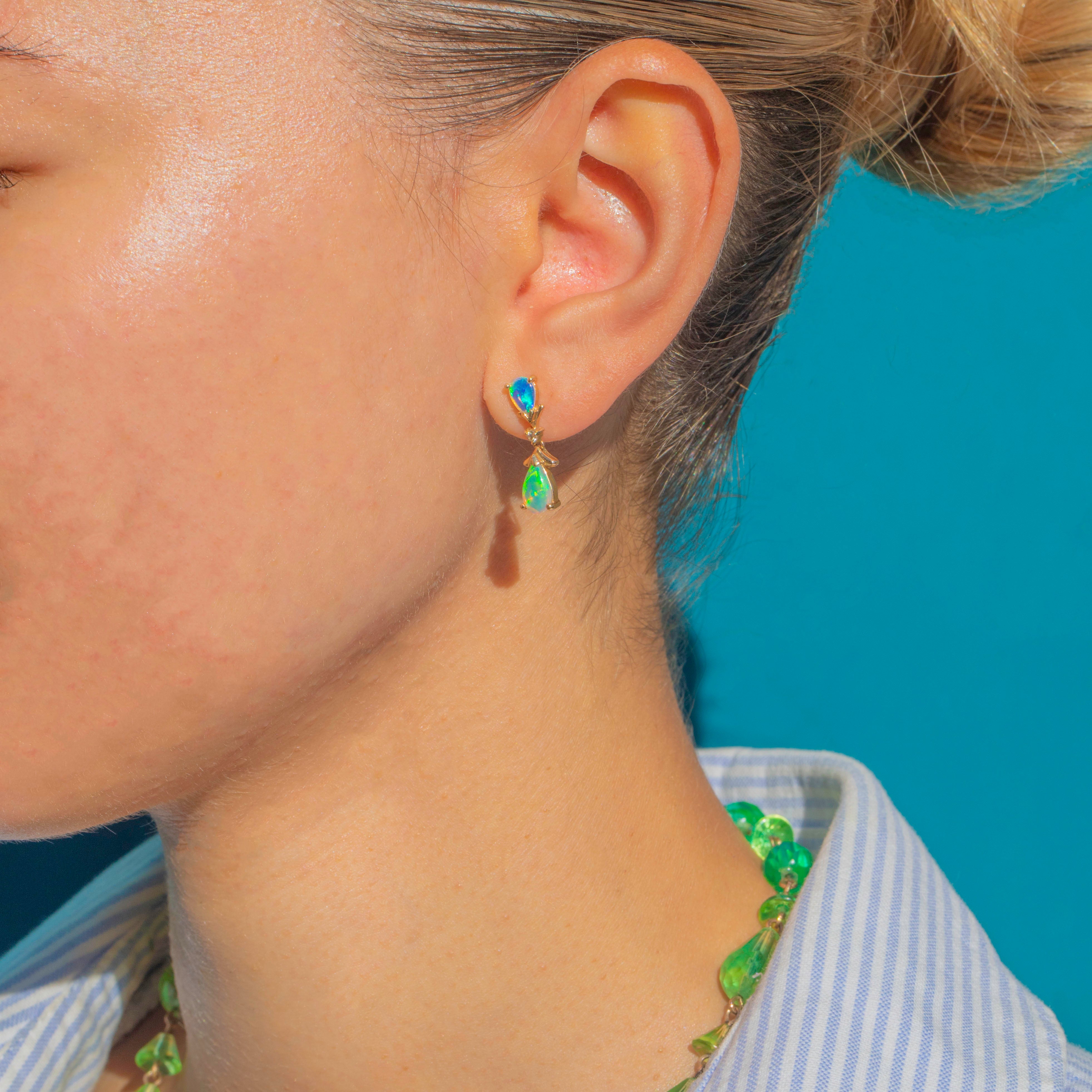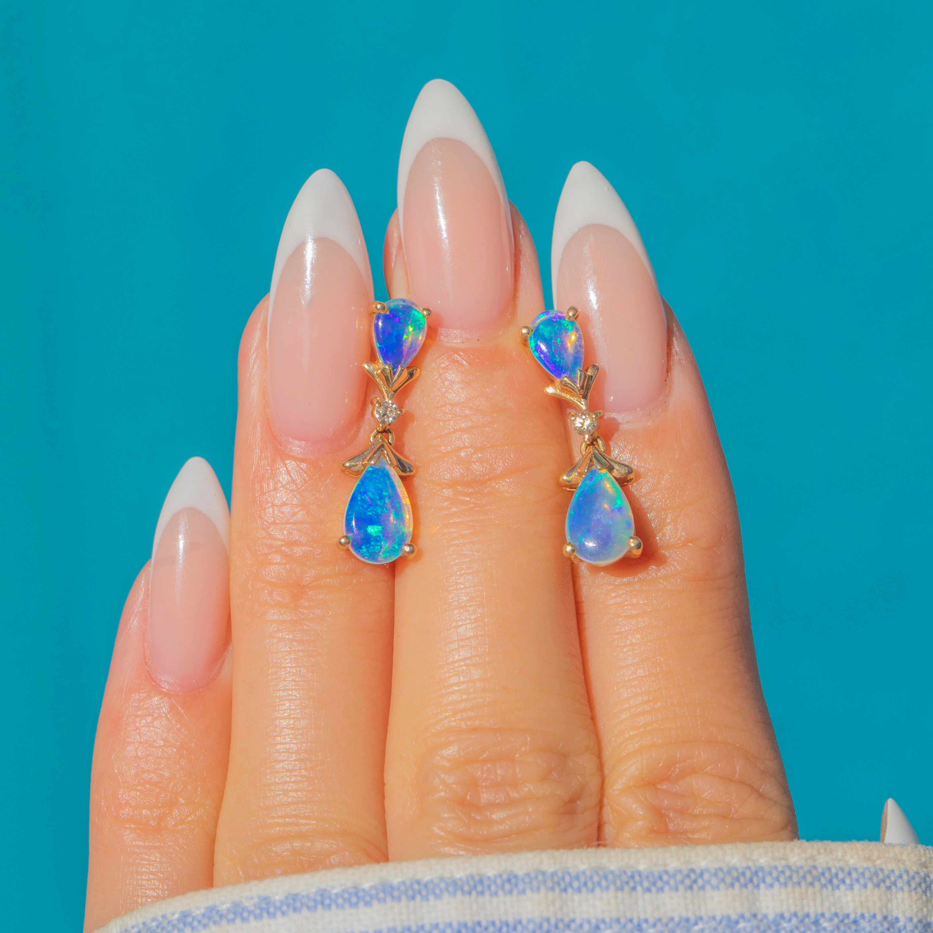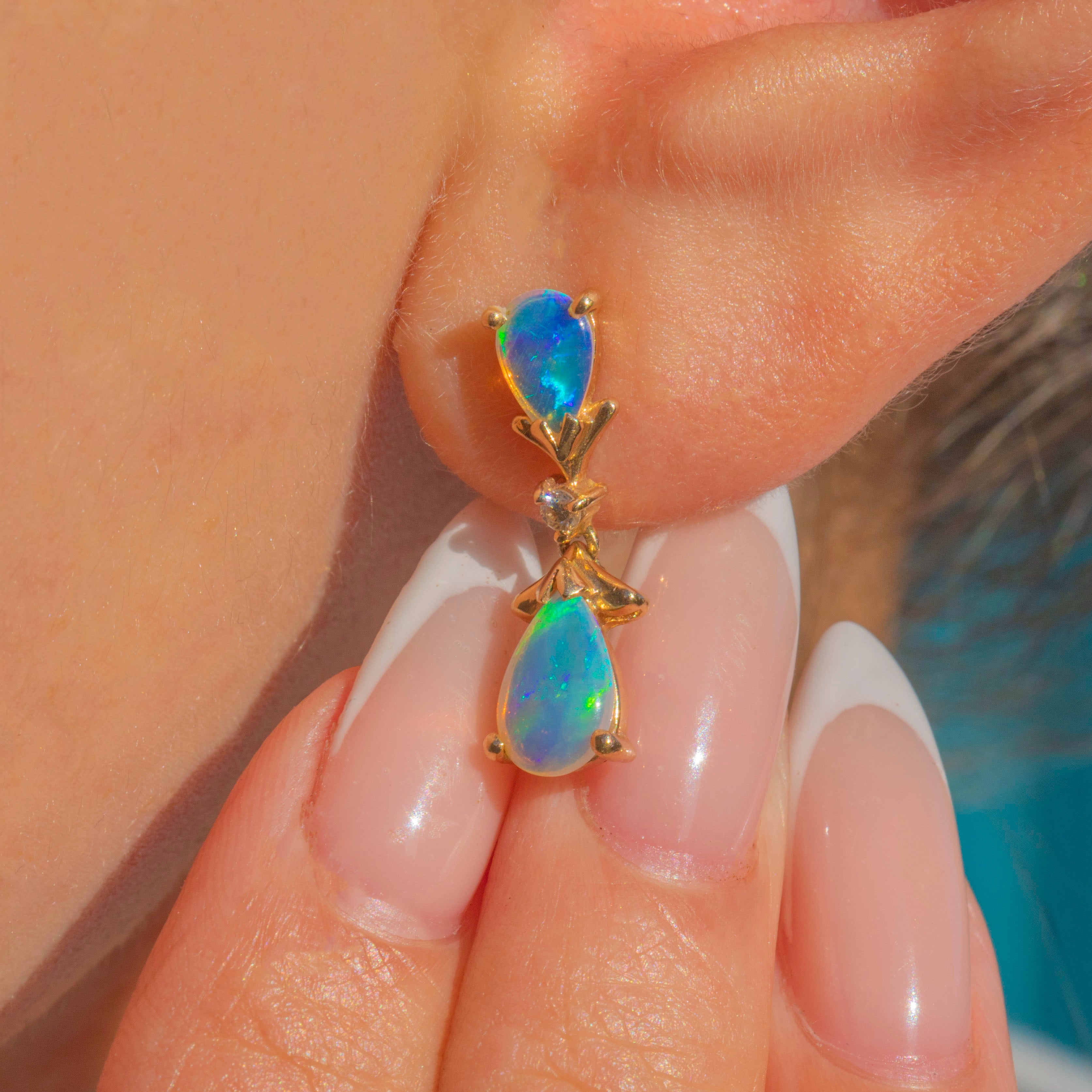 These beautiful Vintage drop earrings are crafted in 14ct Gold and set with vibrant Opals and Diamonds. Each earring features a double-drop design with pear-shaped Opals above and below, linked by a sparkling Diamond accent. The Opals display a kaleidoscope of colour—flashes of blue, green, and orange fire—capturing the magical play-of-colour this gemstone is so loved for.
