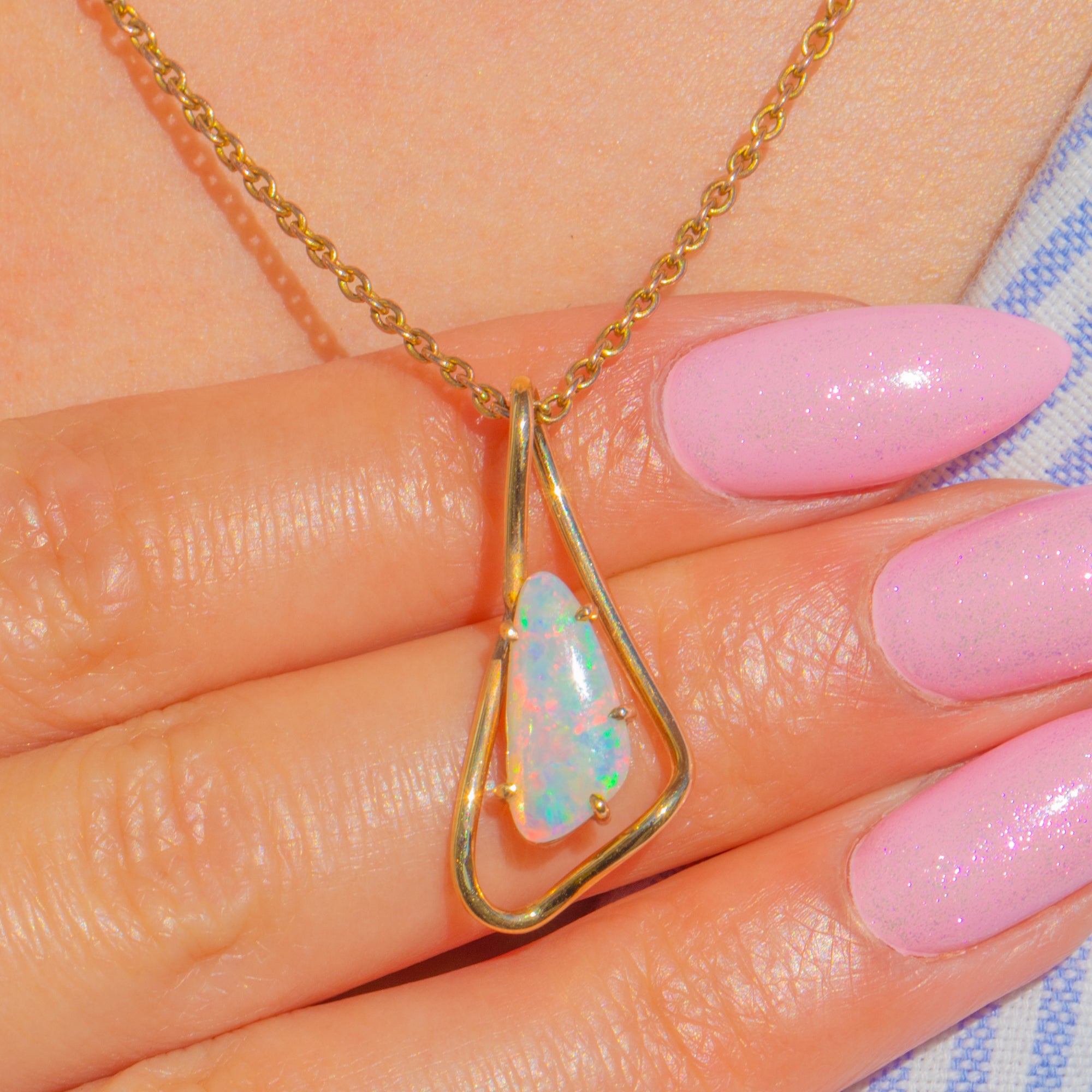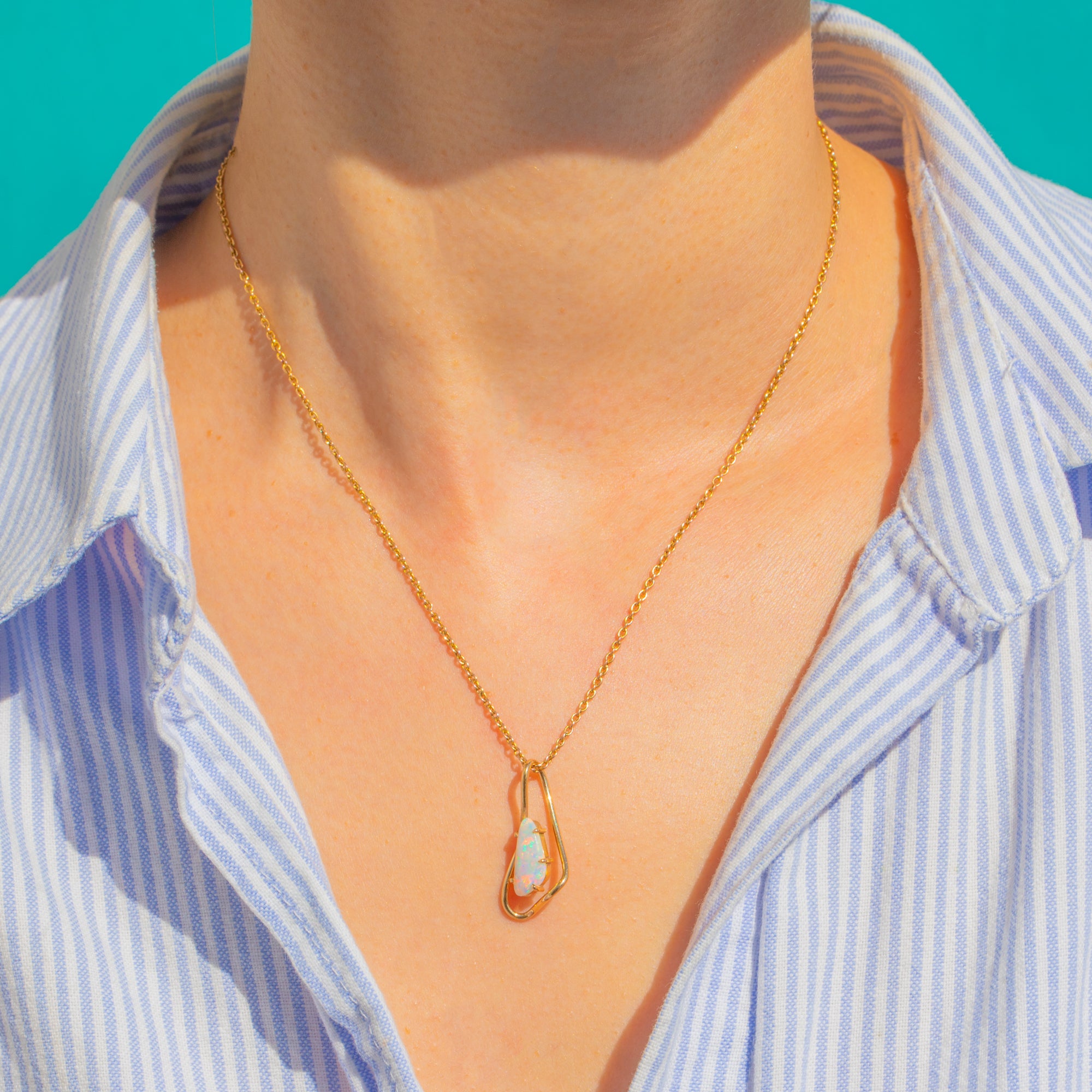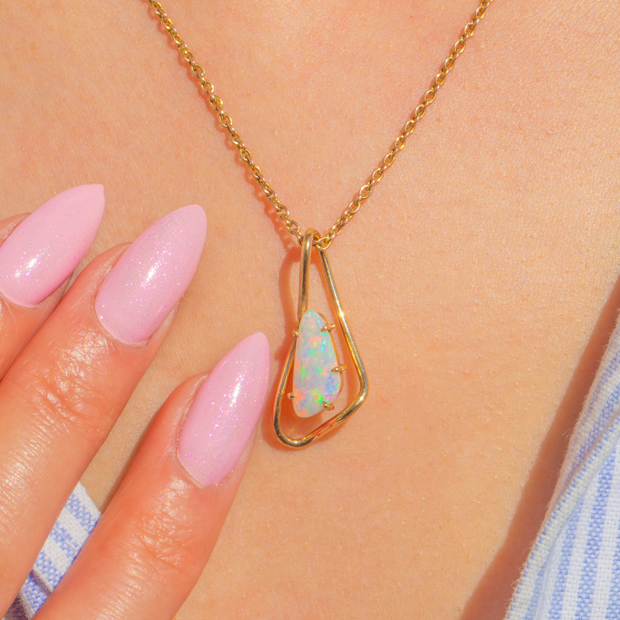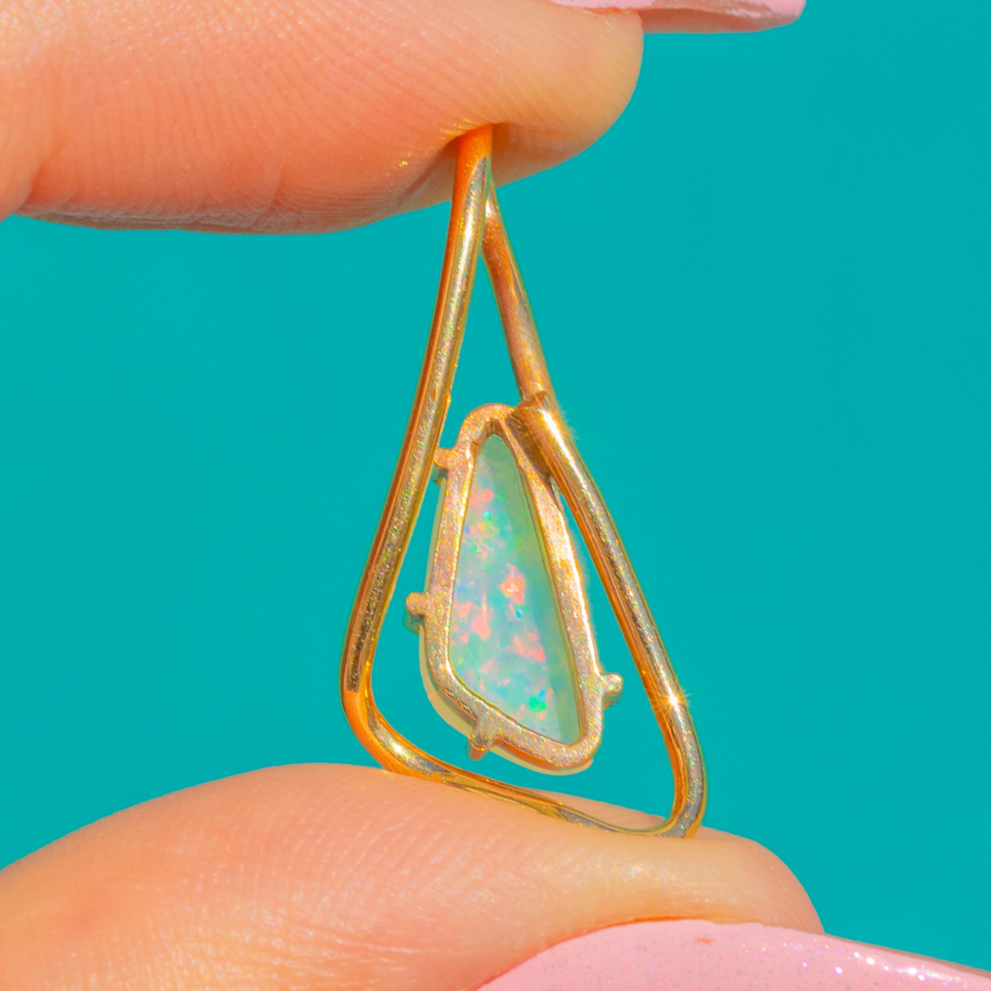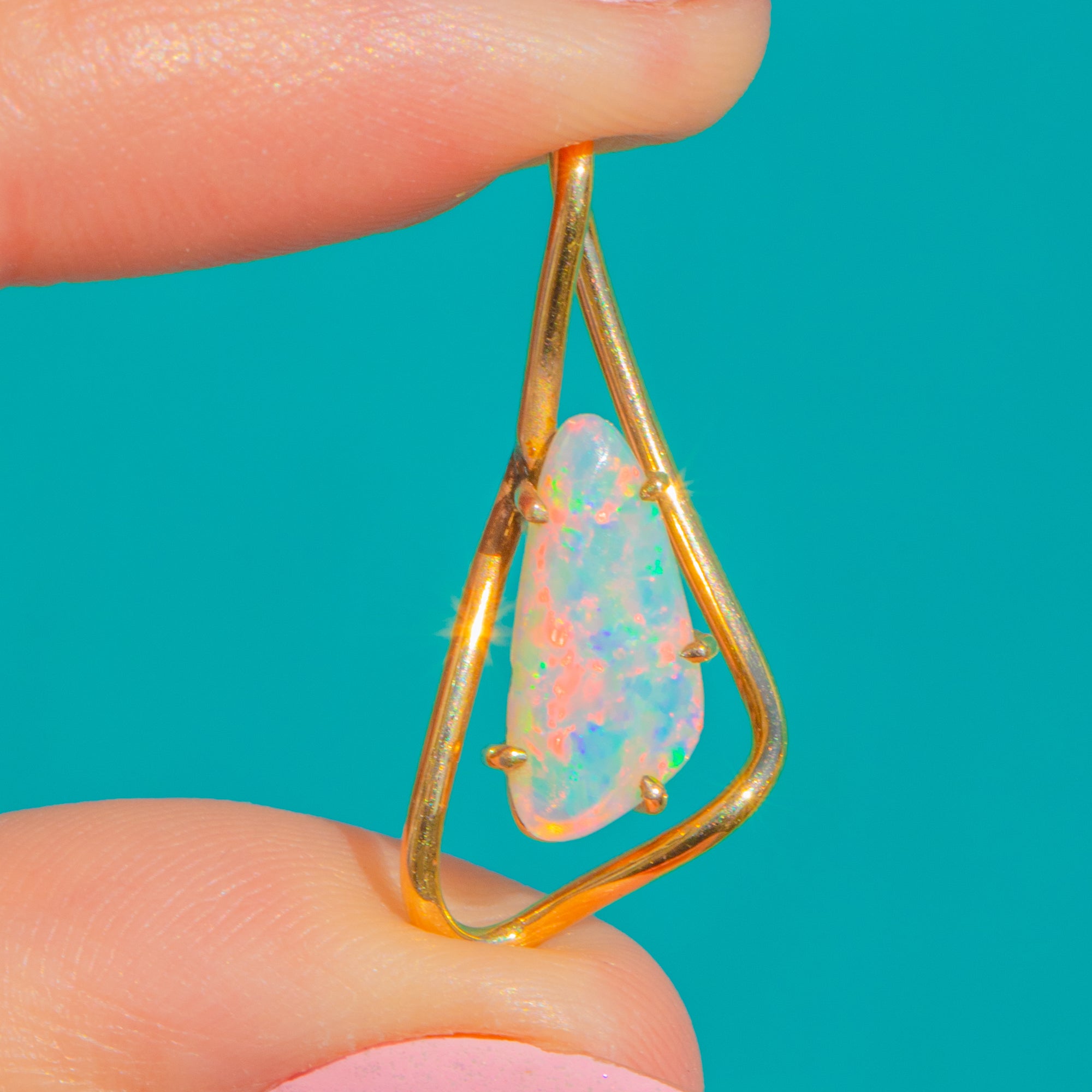 The design is beautifully restrained: an open, asymmetrical teardrop frame with an integrated bail cradles the Opal in a neat prong-held inner setting. Polished to a high shine, it captures that modernist, sculptural elegance that feels effortlessly wearable today.