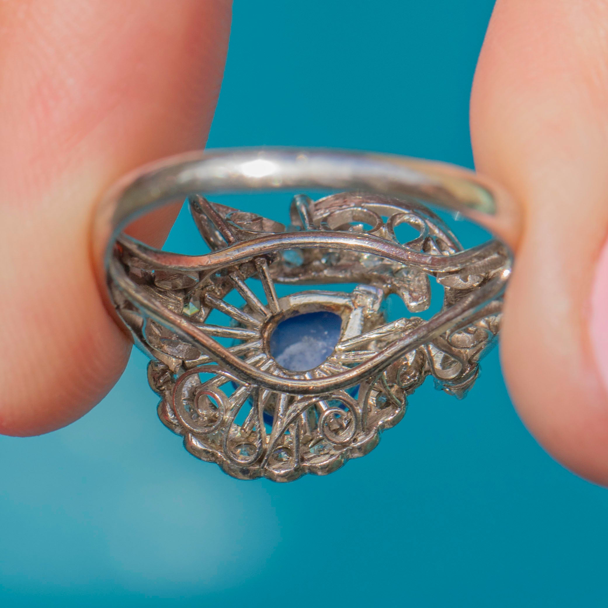 VERY GOOD TO EXCELLENT: We are pleased to present this 14ct Gold Star Sapphire heart Diamond cluster ring in excellent condition. Her Star Sapphire is completely natural, with a glossy finish and only very minor wear commensurate with her age. The star Sapphire is a radiant mid-toned Royal blue, with a bright asterism at her centre.  Her Diamonds are bright and well matched - each securely set within their glossy white Gold settings. With little else to note, she is a beauty and ready to be shown off to the world!