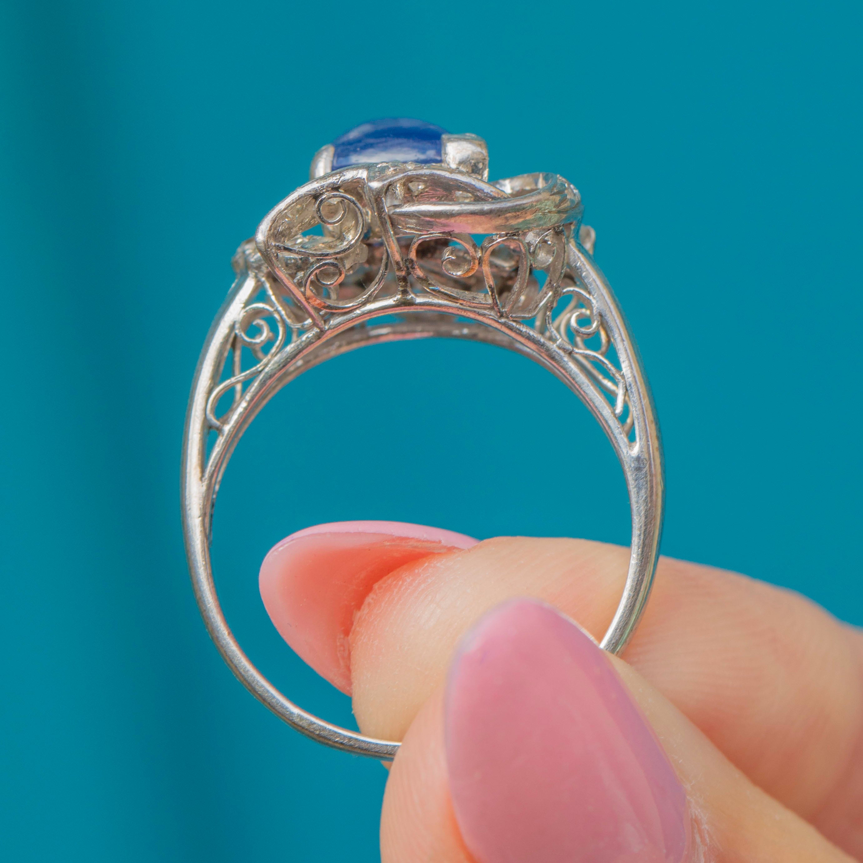 In the centre of this vintage ring lies a magnificent heart-shaped 0.55ct Star Sapphire, boasting a desirable cerulean blue hue and revealing a bright white asterism under the light, for which the Star Sapphire is so revered.