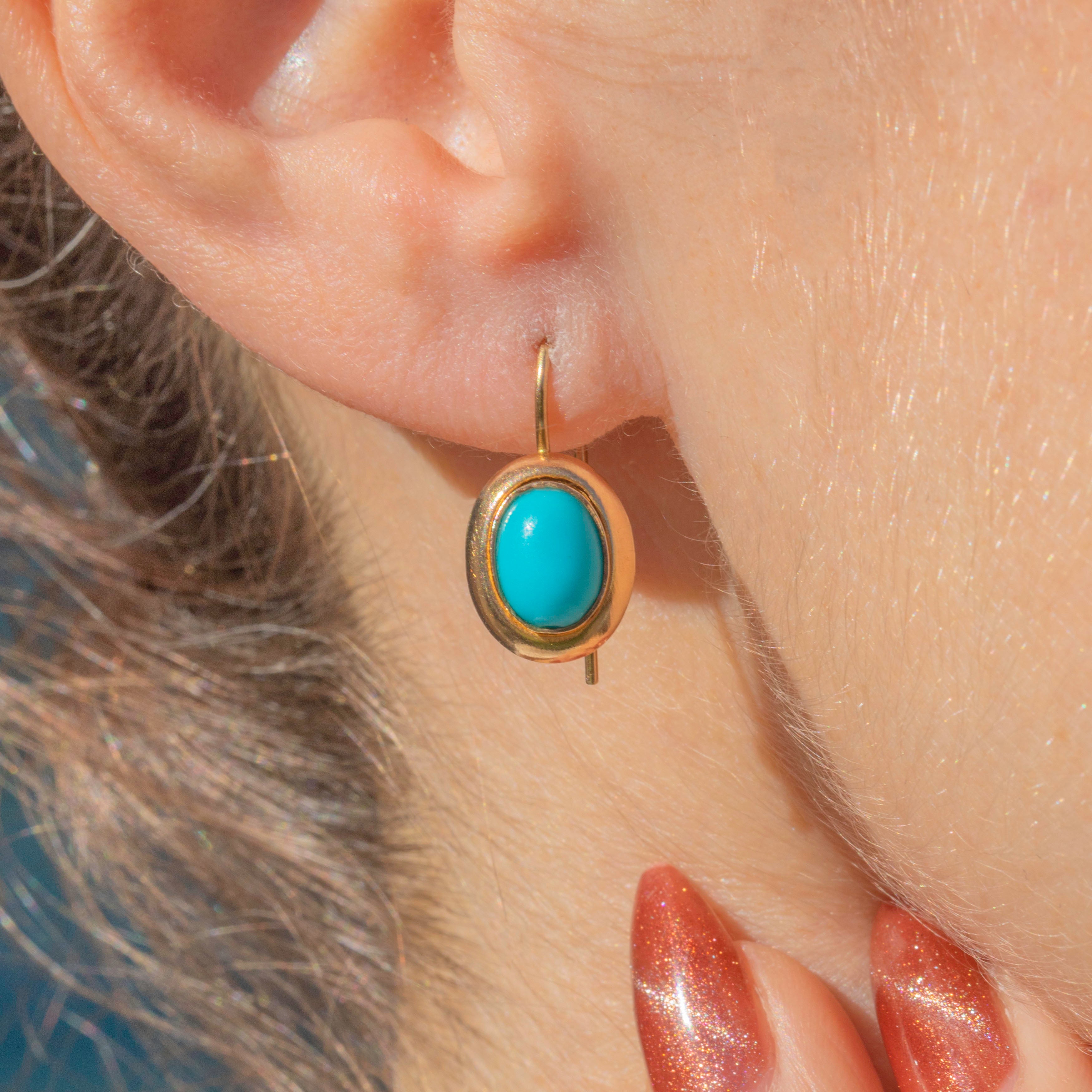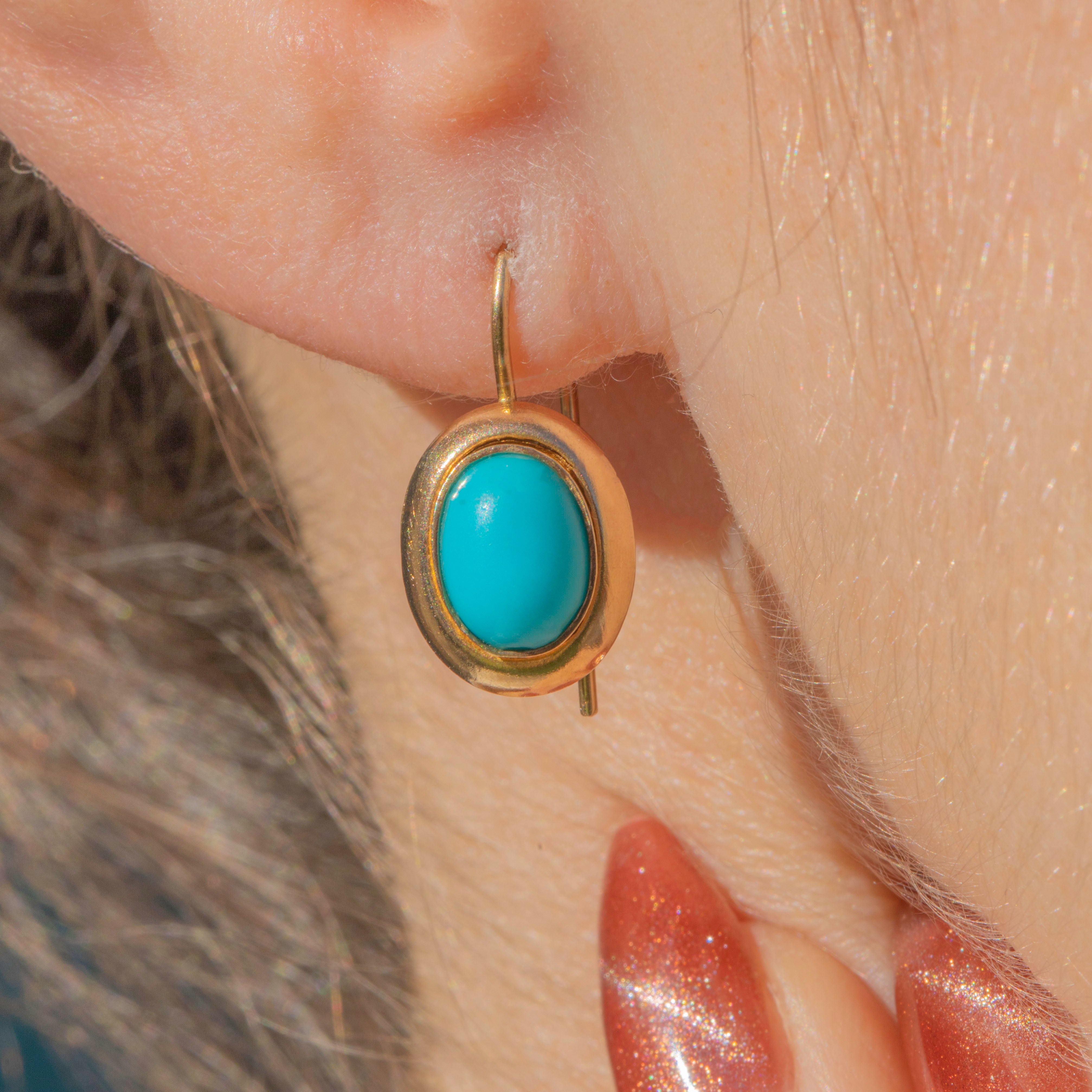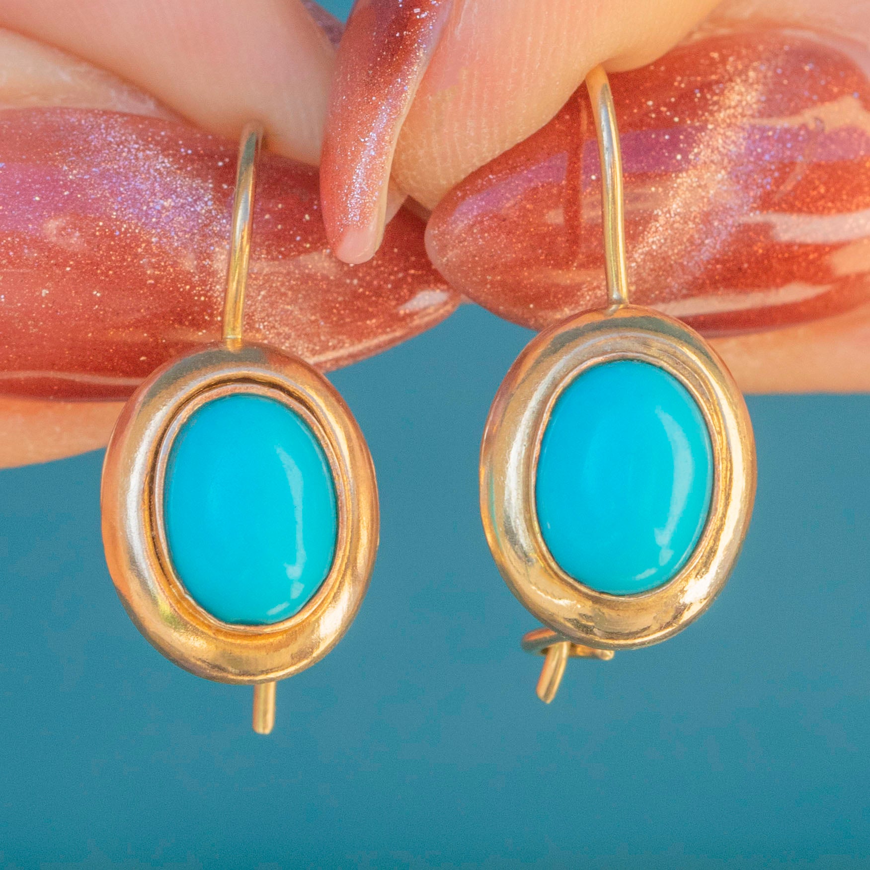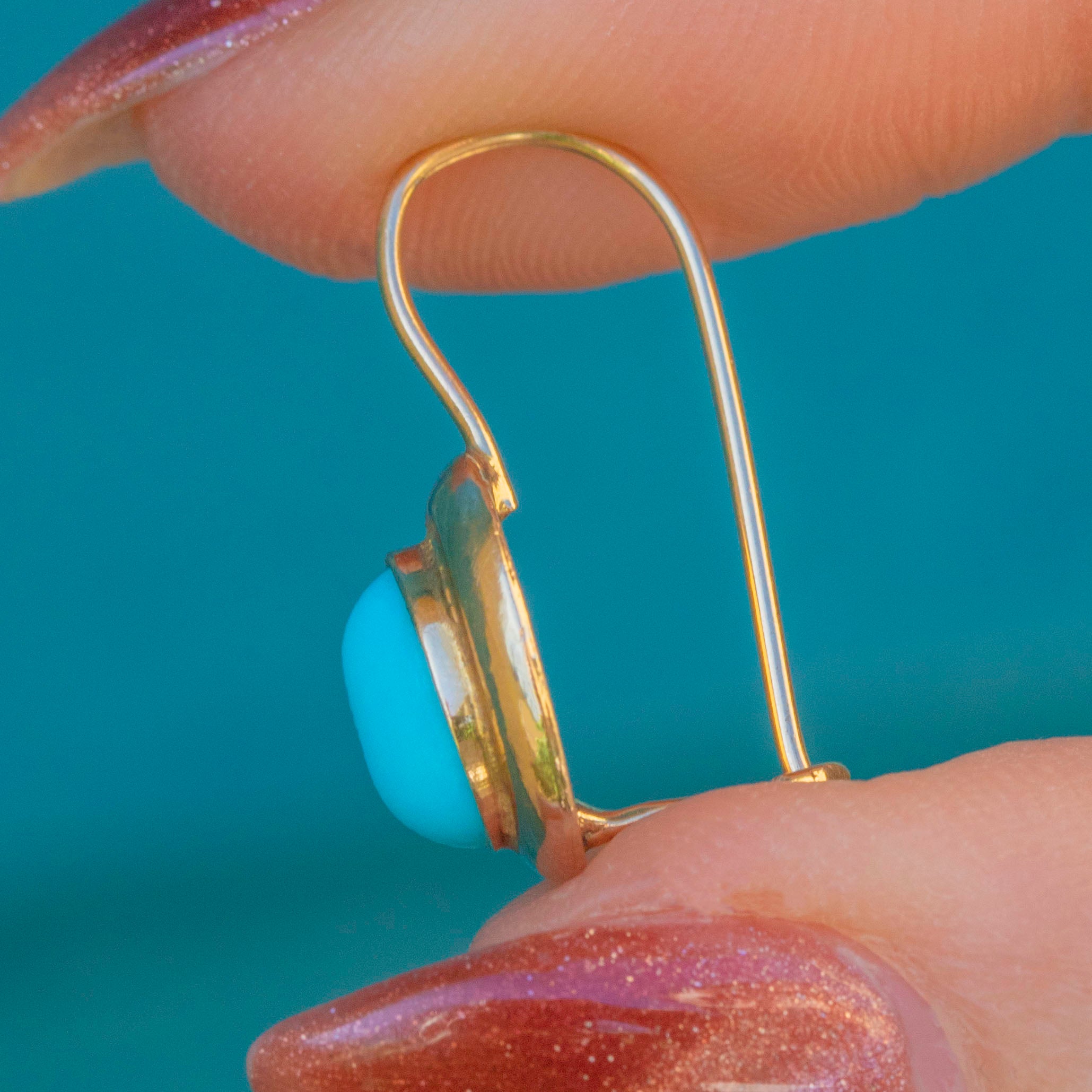 EXCELLENT: These 14ct Gold Turquoise cabochon earrings are in excellent condition throughout. The Turquoise cabochons are smooth to the touch and free form chips or scuffs. The Gold is buttery and the slender hooks are securely affixed, allowing you to wear these delightful vintage Turquoise earrings confidently!