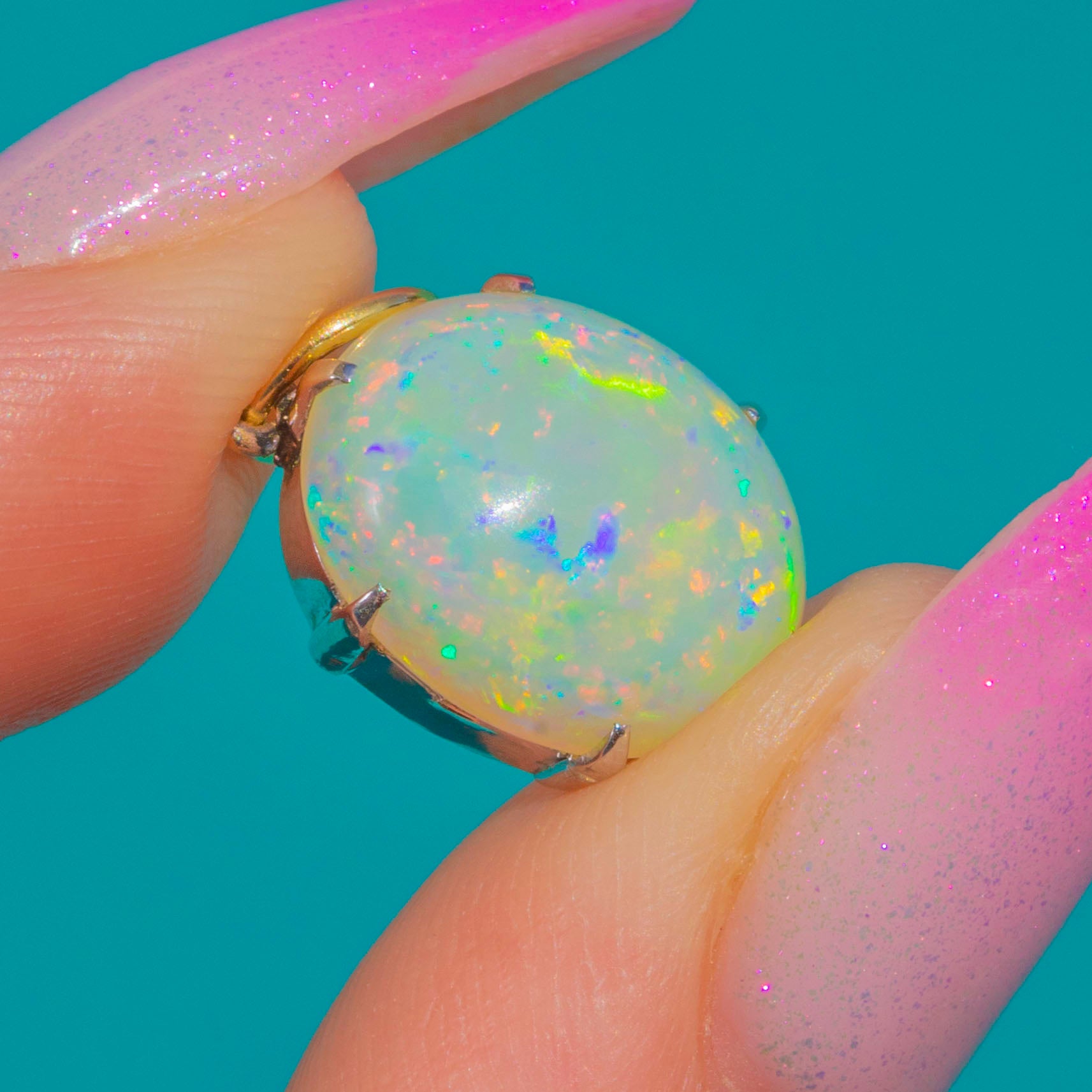 Opal measures 11.5mm long x 9.5mm wide, weighing approx. 3.10ct.