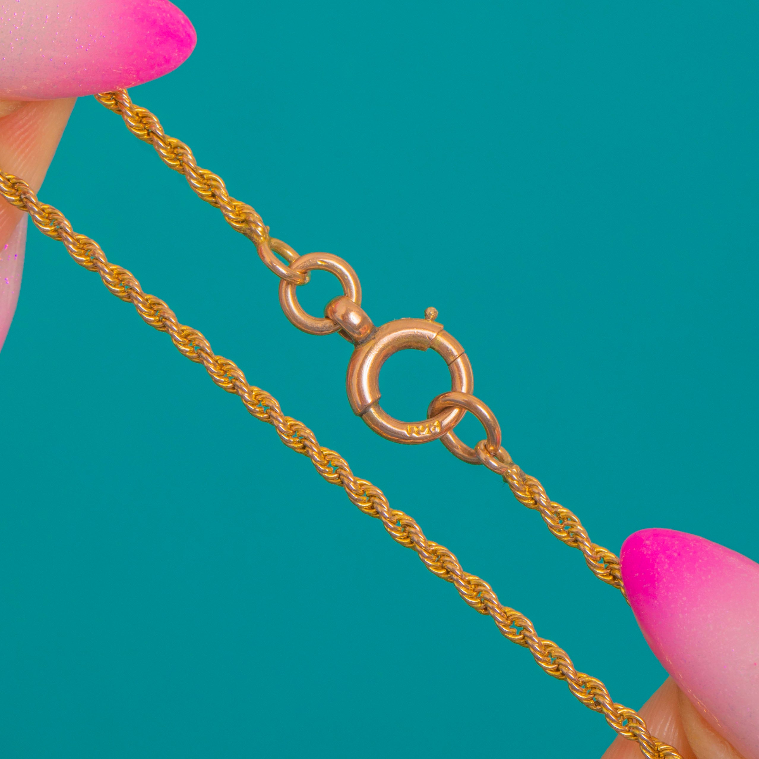 EXCELLENT: Bright Gold with minimal surface wear commensurate with age; the rope links and decorative orbs are crisp with lovely definition and a gentle, even patina in the recesses. The chain is secure with no visible repairs or alterations, and the bolt ring clasp is in fine working order.