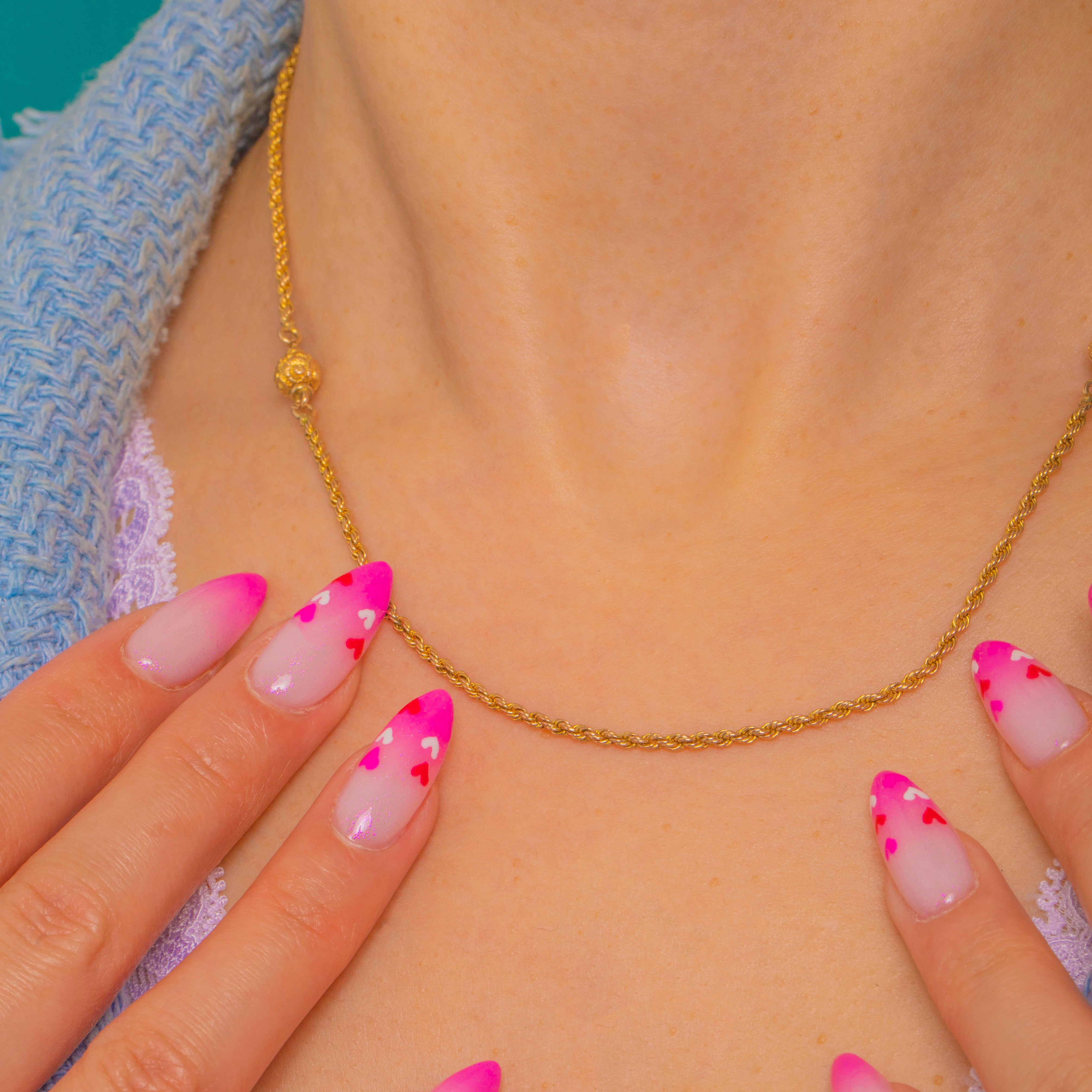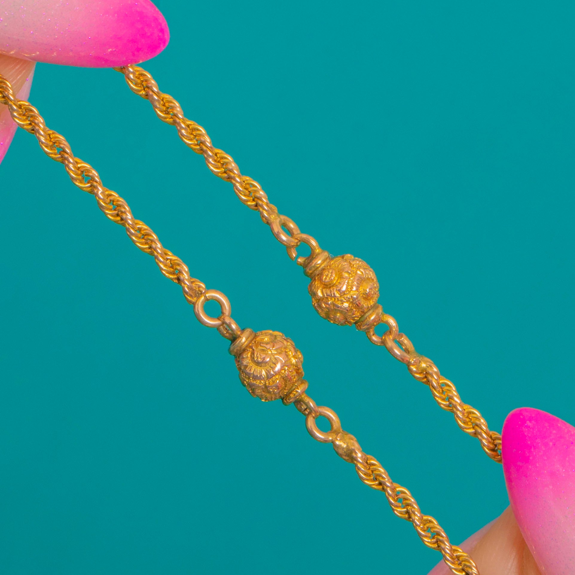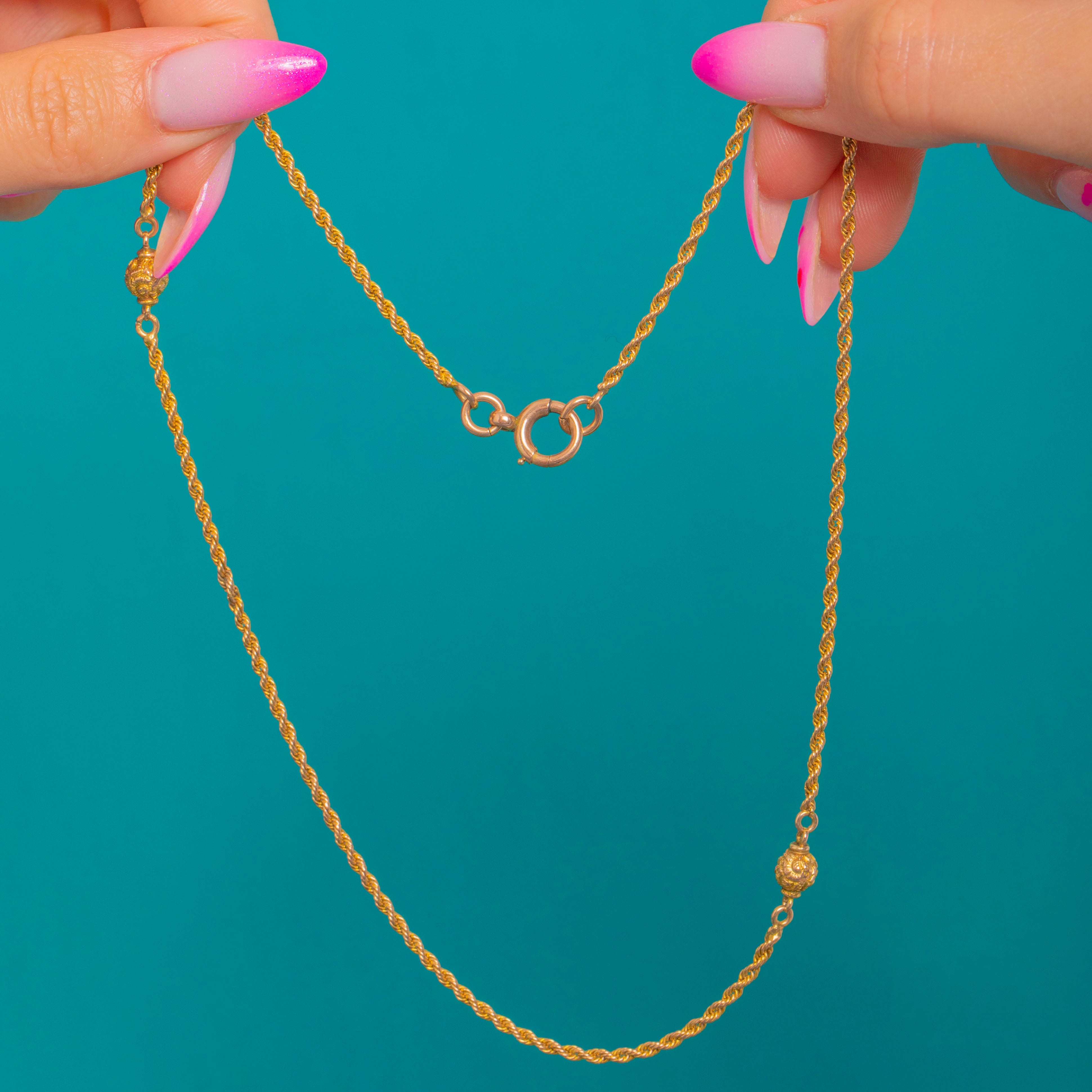 Delicate yet distinctive, this Victorian 9ct Gold rope chain is punctuated with petite ornate orb links, bringing a whisper of antique romance to a classic silhouette. The regular rope twist catches the light beautifully, while the orbs are enriched with fine granulated and foliate detailing for an elegant, tactile finish.