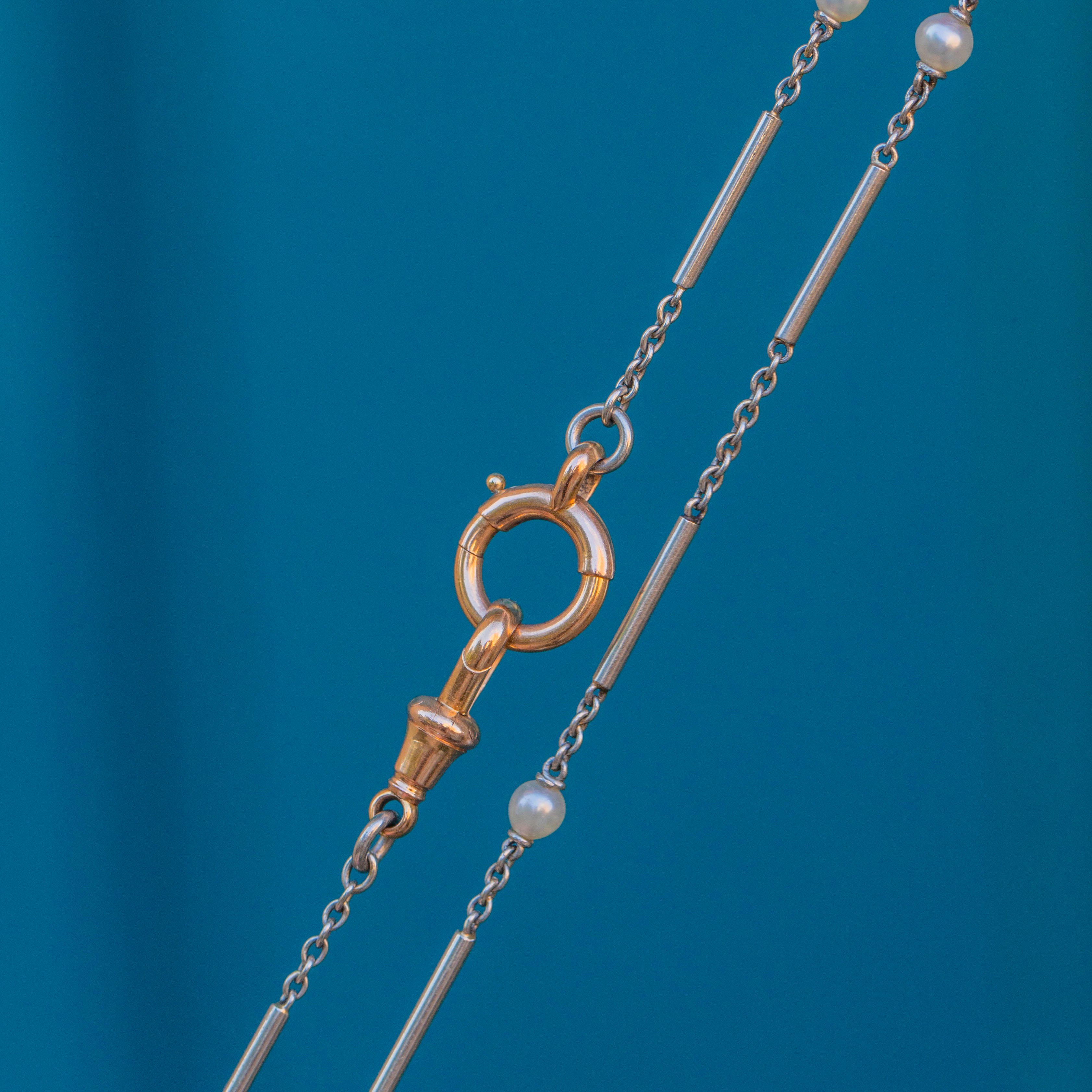 EXCELLENT. This 15" Edwardian Platinum Pearl necklace is in excellent condition. This chain has a lovely selection of Pearls present, smooth links and lovely antique Gold findings. The bolt-ring and dog-clip are in perfect working order and the necklace has lasted impeccably since the Edwardian era, making her a highly coveted piece!
