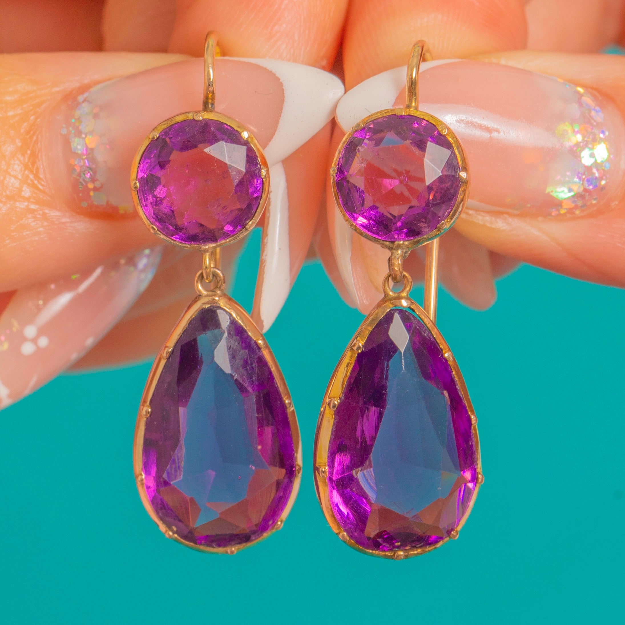 A timeless Victorian pairing of saturated purple Amethyst and buttery 15ct Gold, these articulated double drops are all about colour, clarity and graceful movement. Each earring showcases a lively round Amethyst surmount flowing to a larger pear-cut drop below, the two linked to dance with every step.