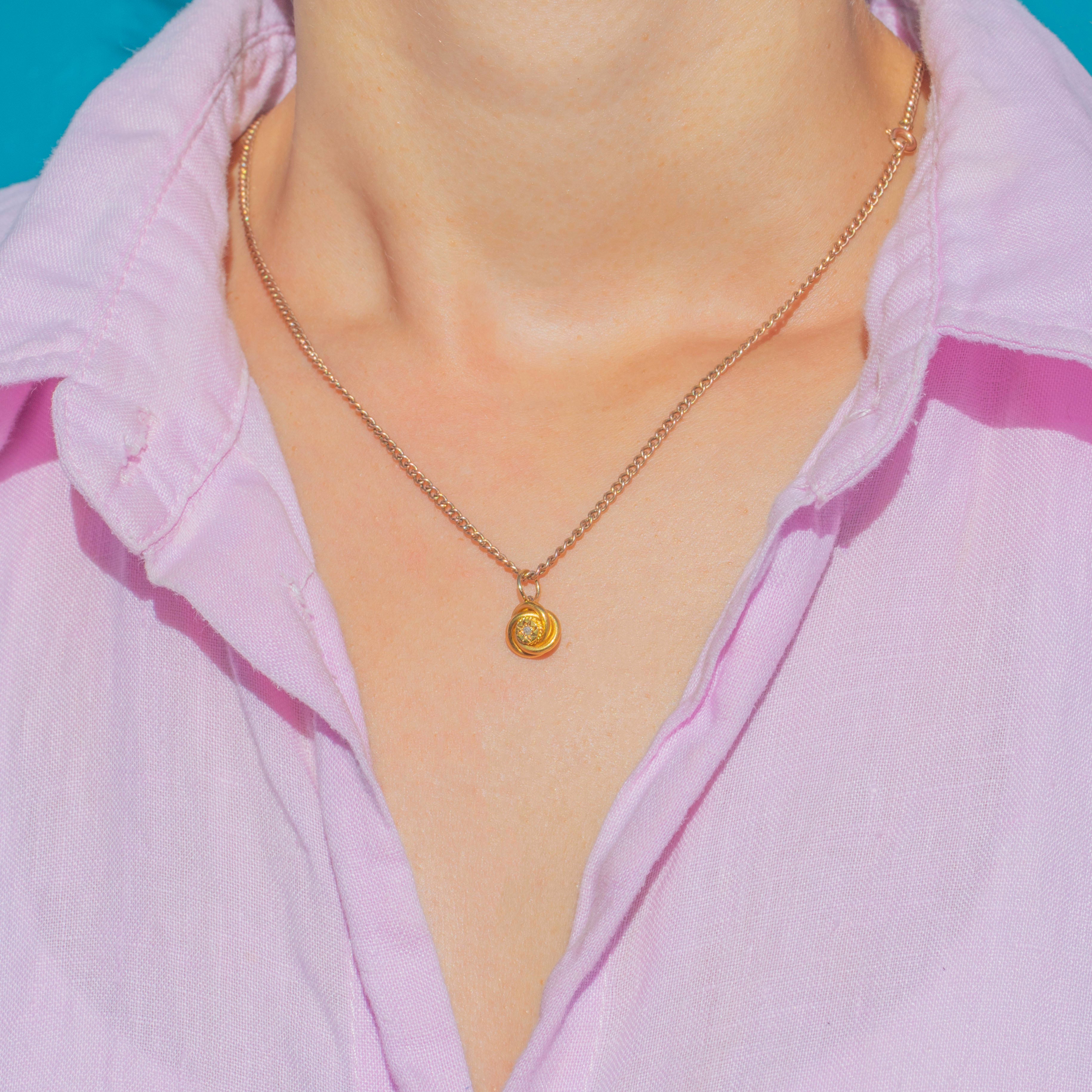 This dainty Edwardian pendant is crafted in rich 15ct Gold and set with a single sparkling Diamond. The bright Diamond adds a touch of fire and light to the smooth Gold setting, creating a timeless and elegant look.