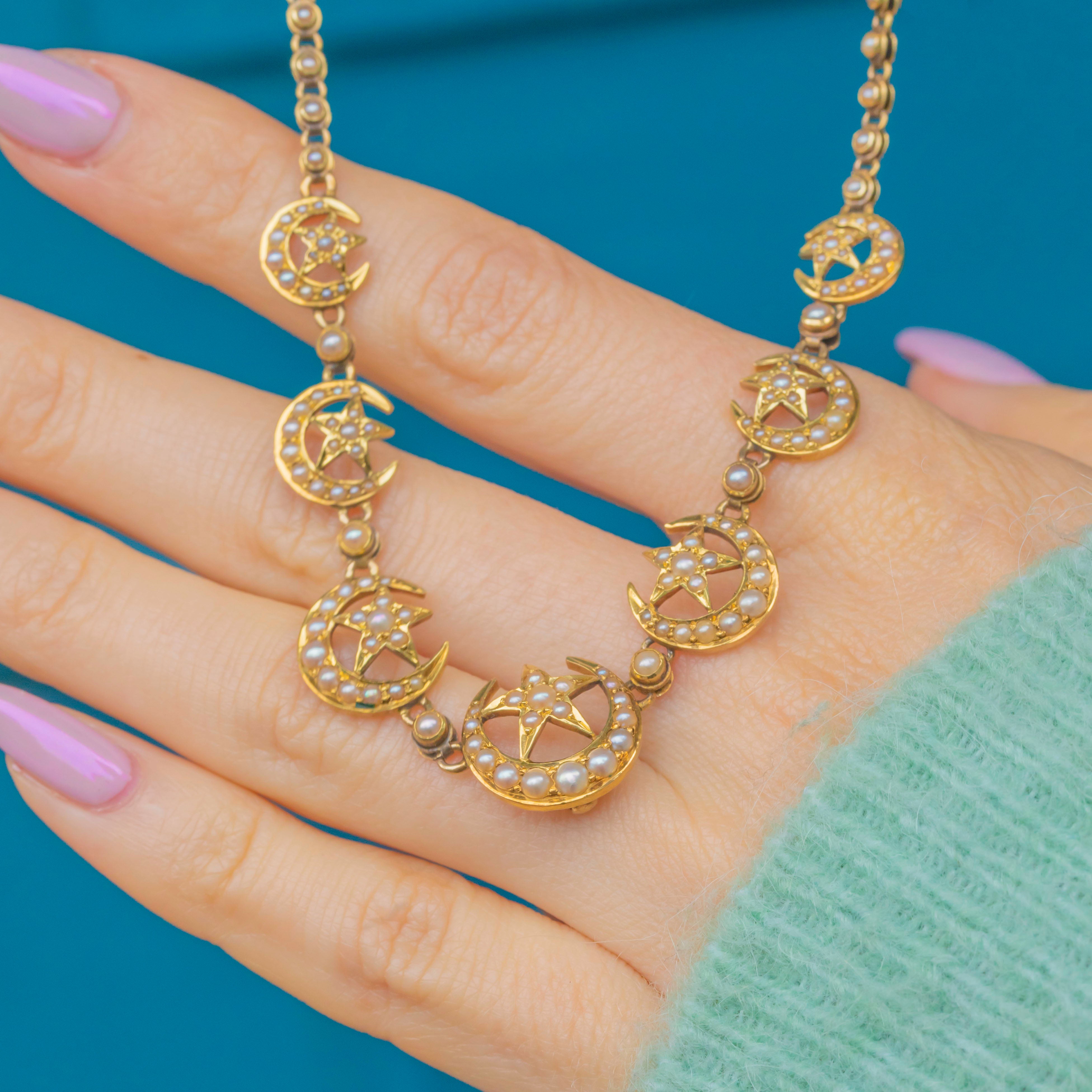 15ct Gold Edwardian Pearl Crescent Moon & Stars Necklace