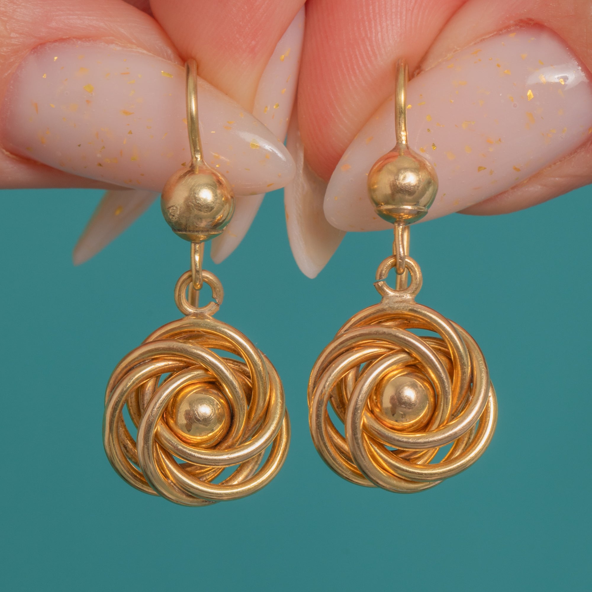 Finely wrought in glowing 15ct Gold, these Victorian love‑knot earrings are a timeless whisper of romance. Each articulated rosette is formed from interlaced rounded wires encircling a polished central bead, suspended beneath a neat ball surmount on simple shepherd hooks for graceful movement and elegant sway.