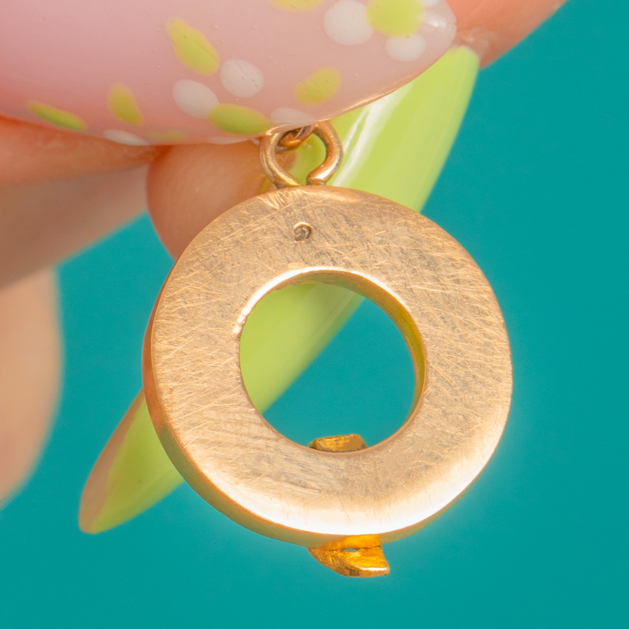 Petite and beautifully refined, this Victorian 15ct Gold charm forms a delicate open wreath of creamy Seed Pearls, finished with a tiny tab set with a trio of twinkling Rose-Cut Diamonds. The warm glow of antique Gold pairs perfectly with the soft lustre of the Pearls, while the Diamonds add a subtle, romantic sparkle.