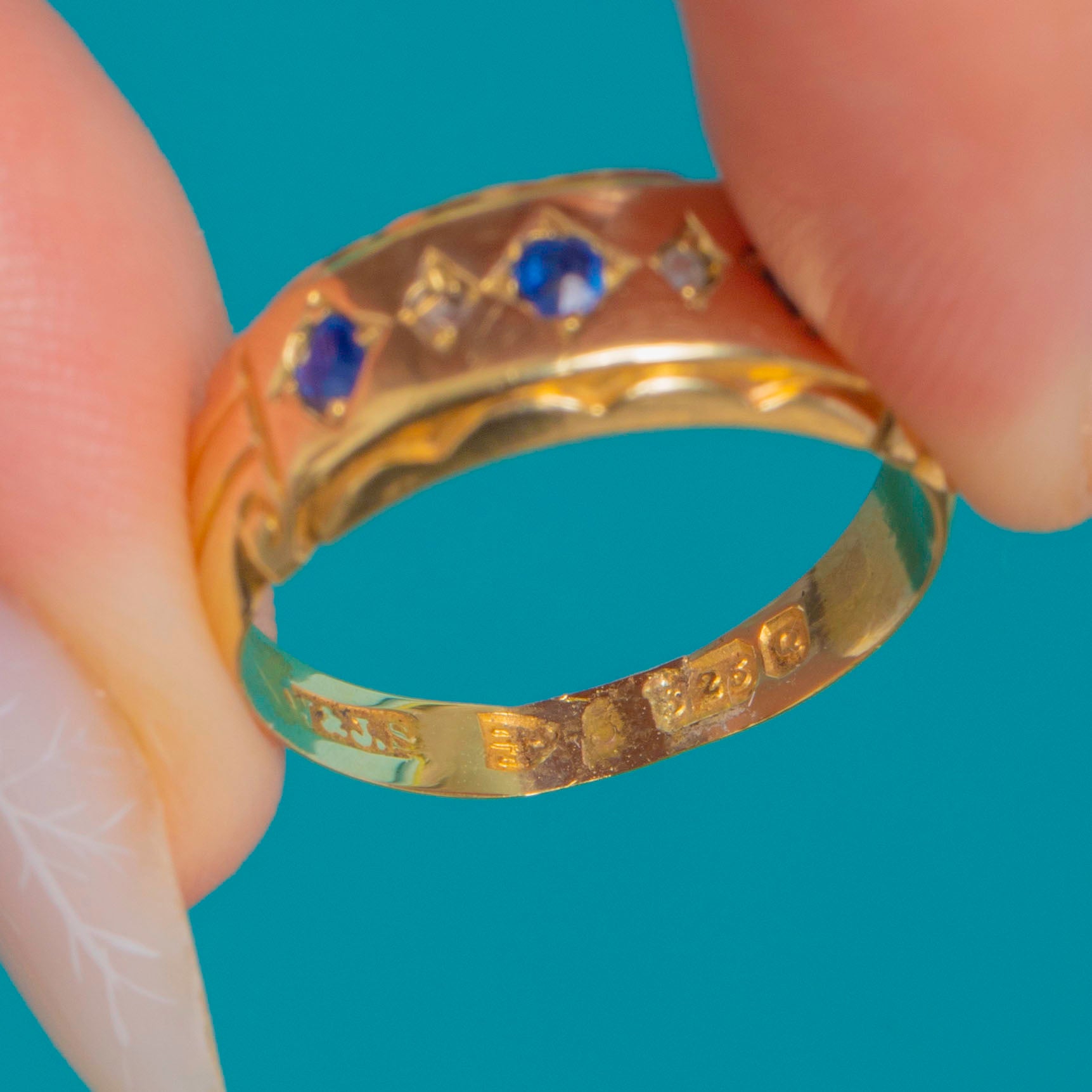 EXCELLENT: Gemstones show light facet wear and minor abrasions visible under magnification, with settings secure. The band has light surface scratches and softened engraving from wear, and the hallmarks are partly worn. A possible old resize seam is visible inside the shank; overall well cared for and ready to wear.