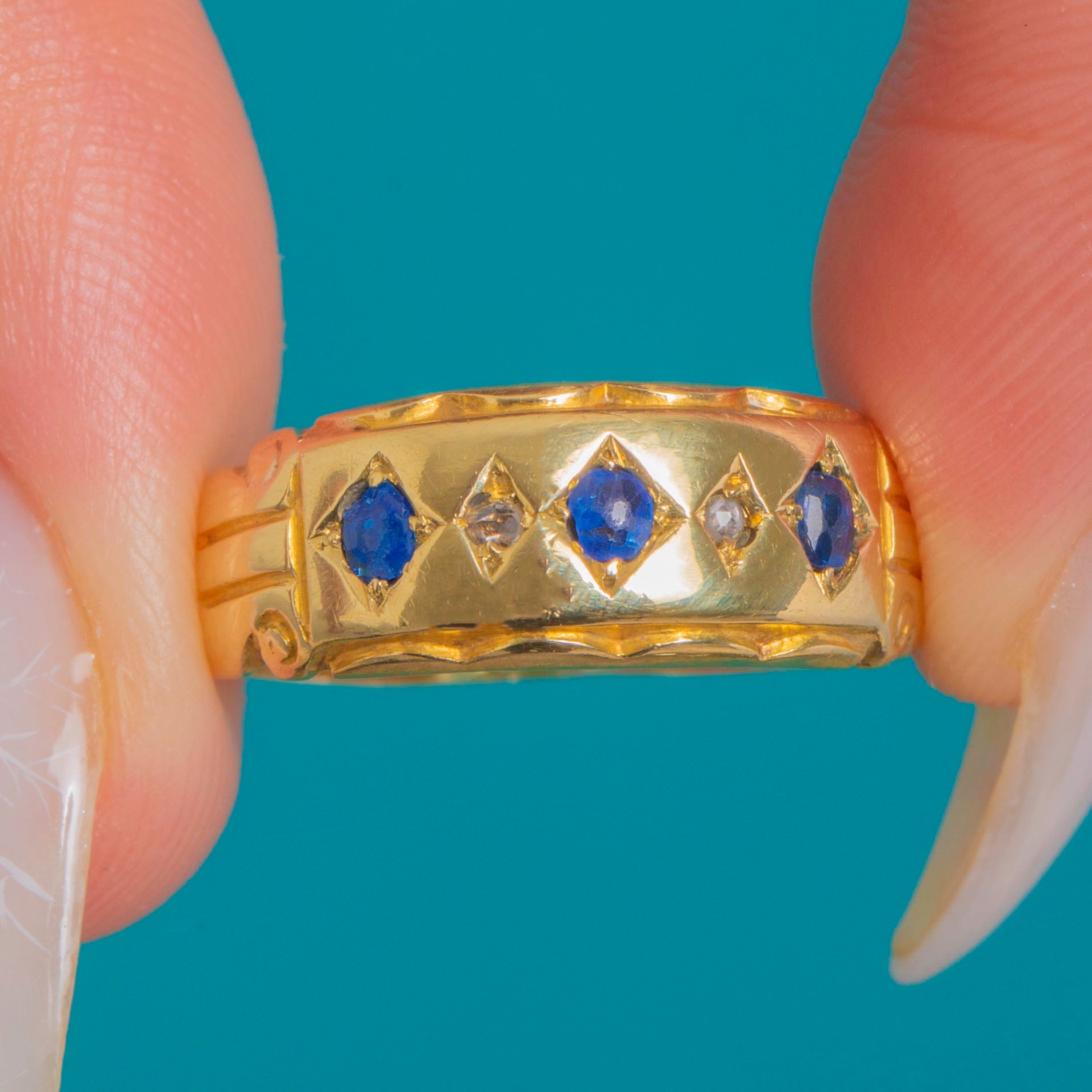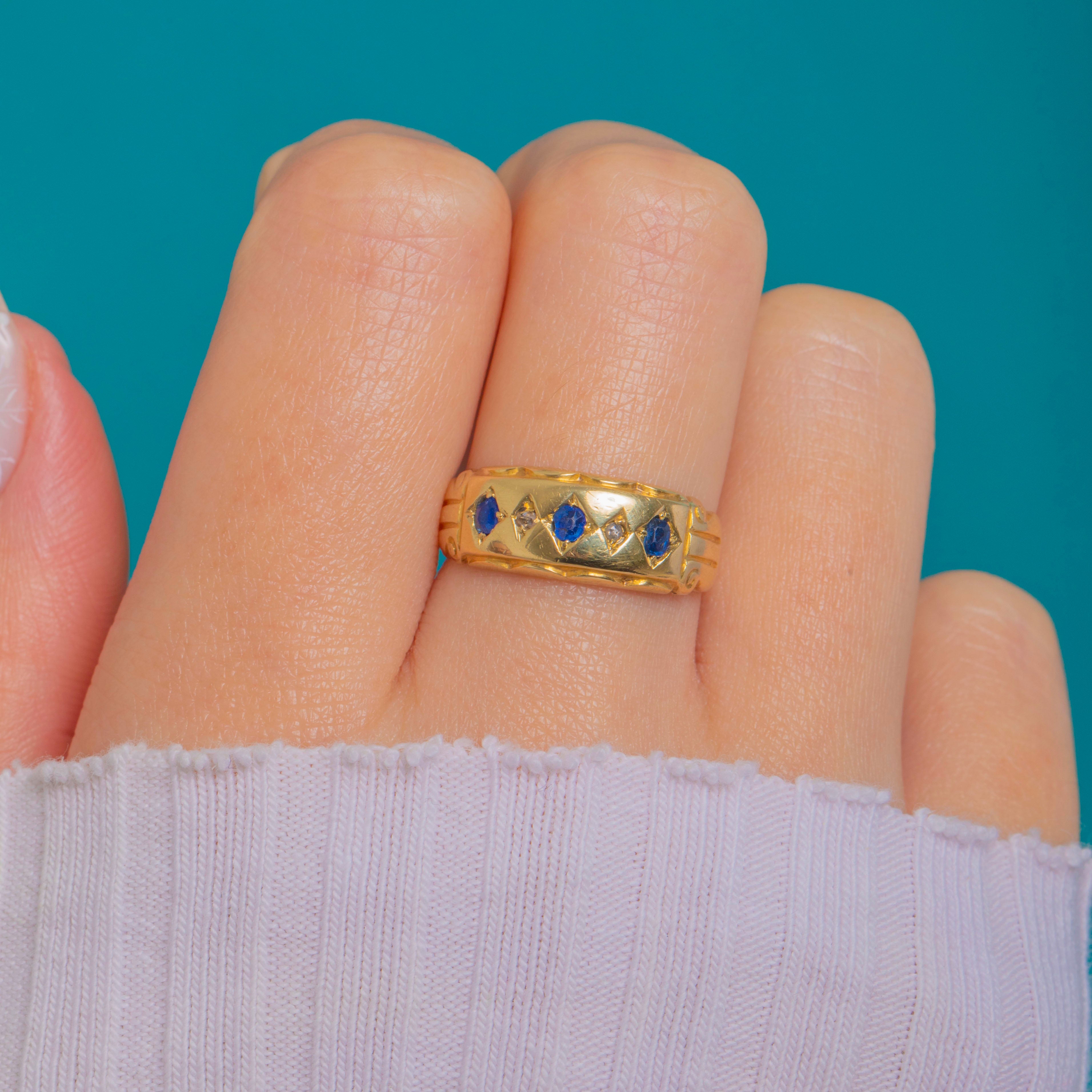 A richly hued 15ct Gold gypsy ring set with Sapphires and Diamonds, bearing the Chester assay and dating to 1899. The gemstones are nestled in bright-cut star and lozenge-shaped panels across a domed band, framed by hand-engraved borders and subtly detailed shoulders.