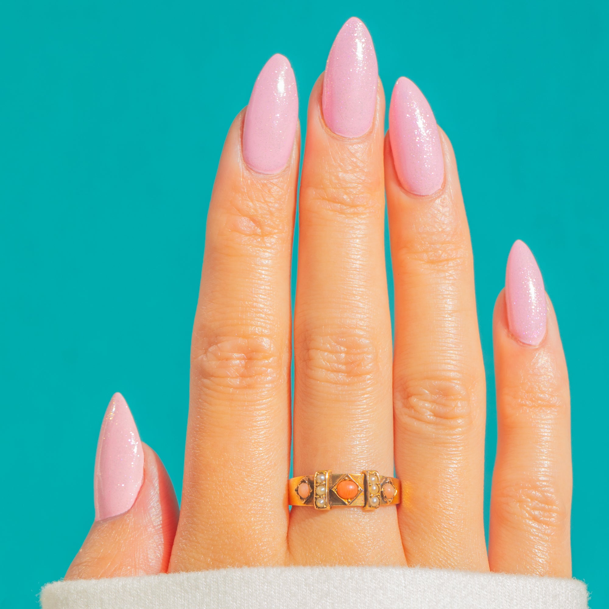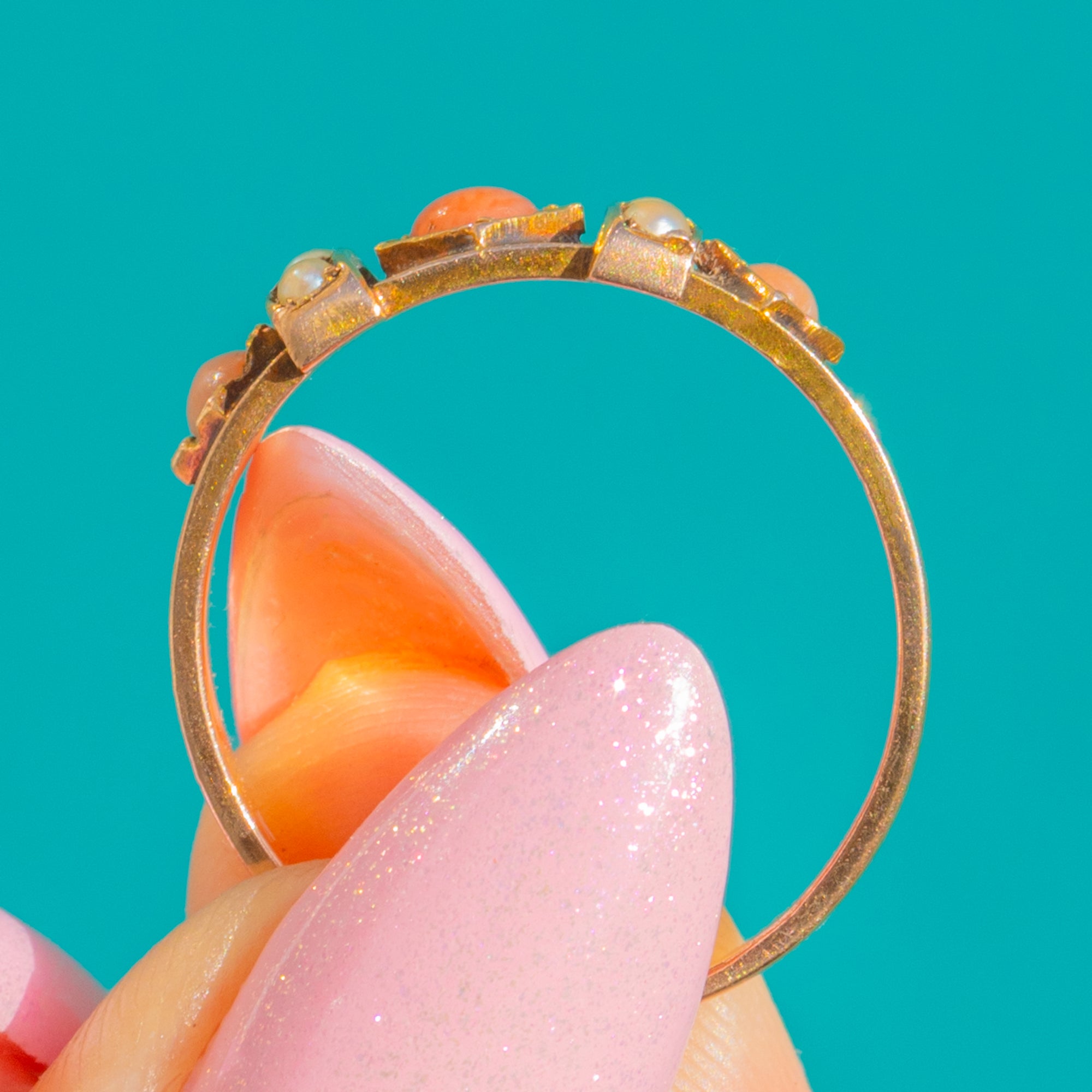 A delicate Victorian treasure, this slim 15ct Gold ring is set with glowing Coral cabochons and tiny lustrous Seed Pearls arranged in a refined lozenge-panel head. The alternating rows create a charming rhythm of warm orange-pink and soft cream, elevated by a hand-finished, multi-part construction that makes this ring completely unique.