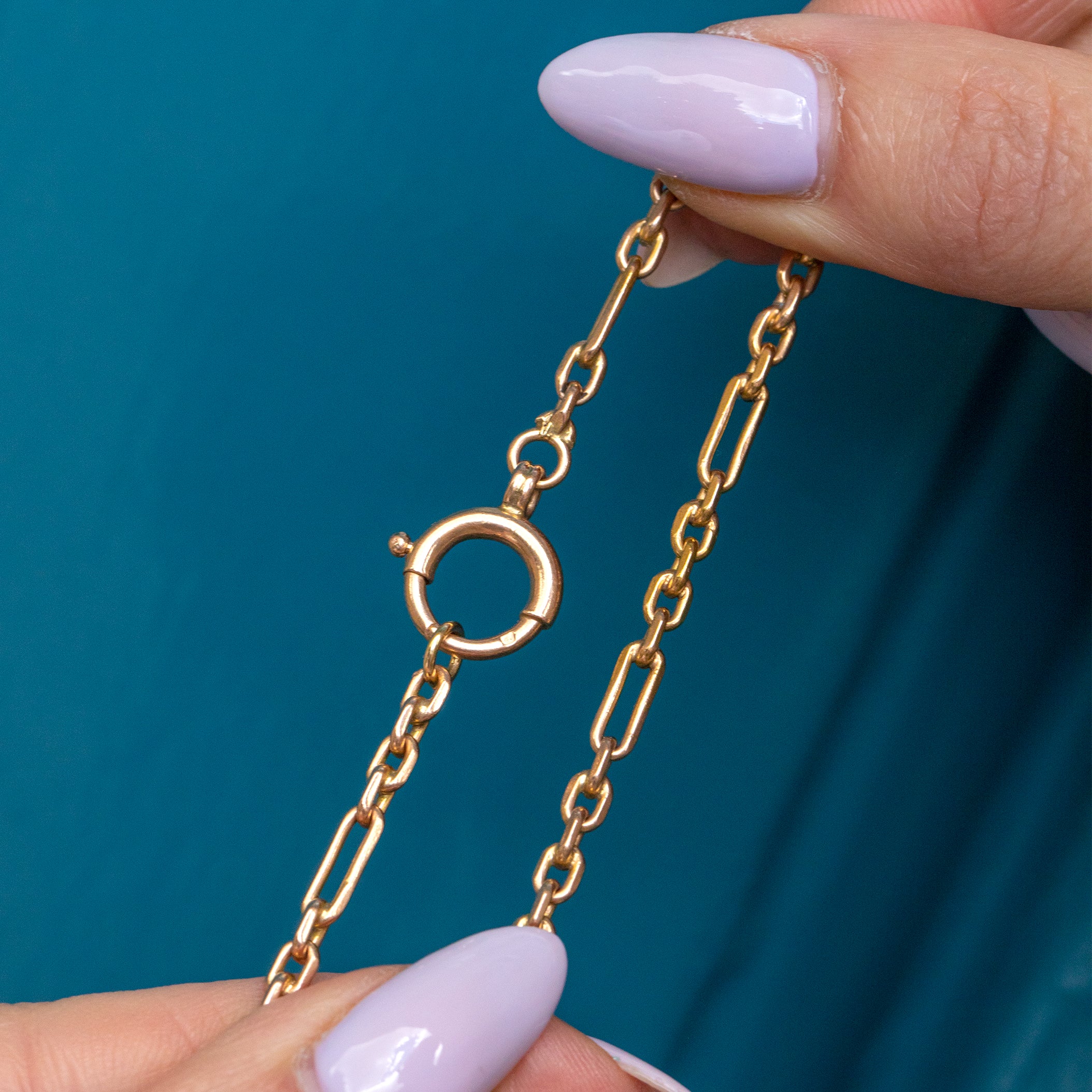 EXCELLENT. This 16" antique 15ct Gold fancy chain is in excellent condition. Her buttery links are well-preserved and uniform. Her bolt ring is secure and has a good spring back, so you can wear this gorgeous chain day-to-day with no hesitation.