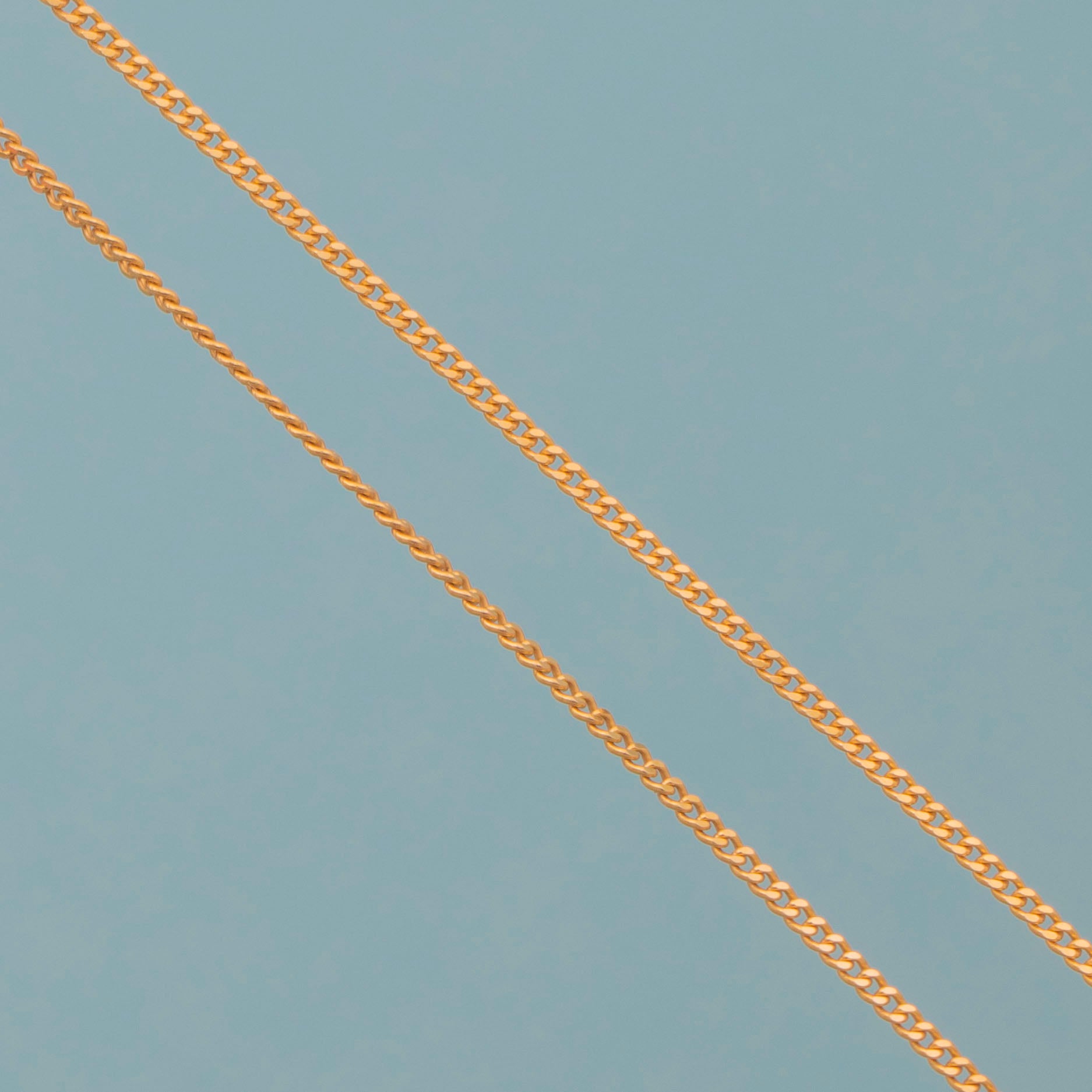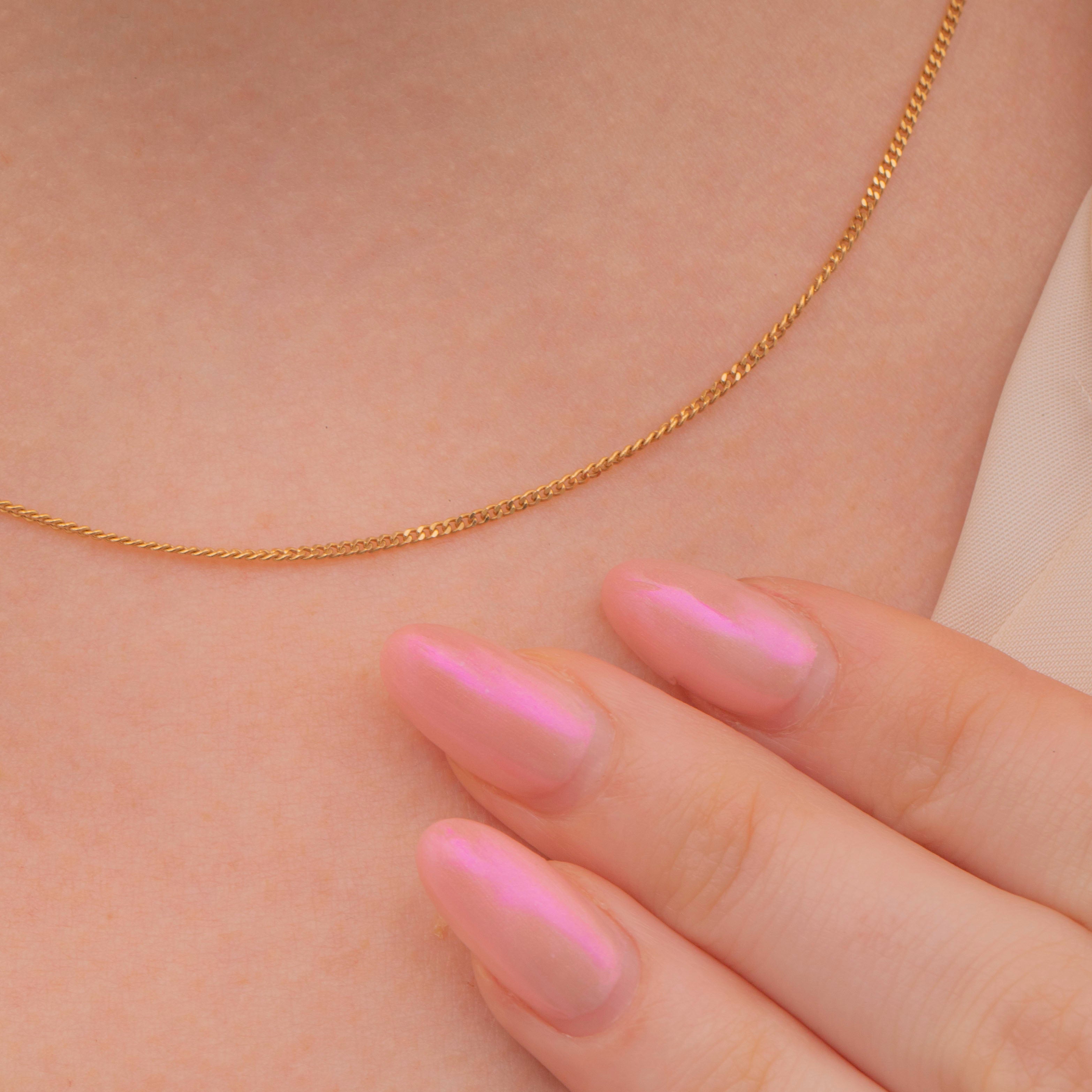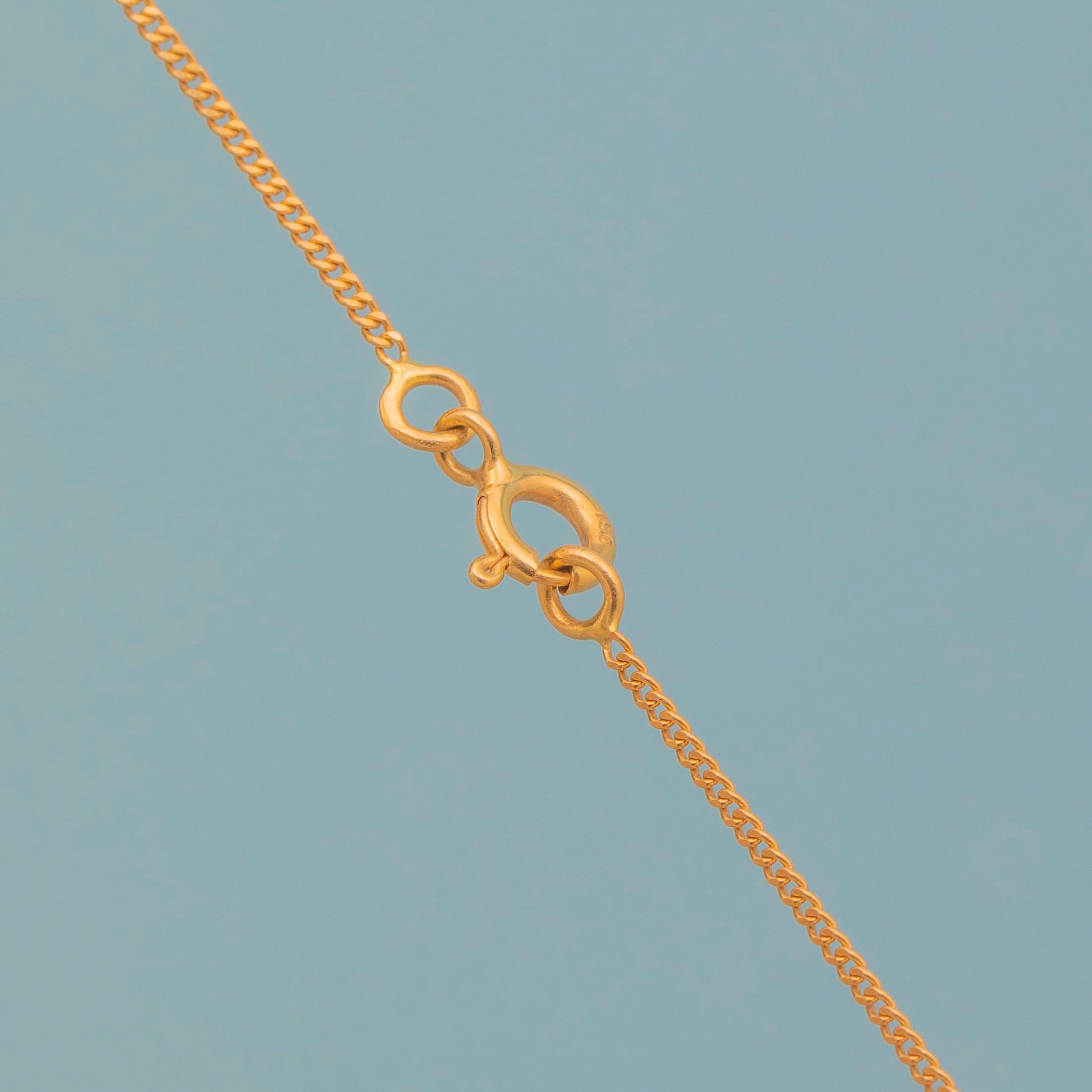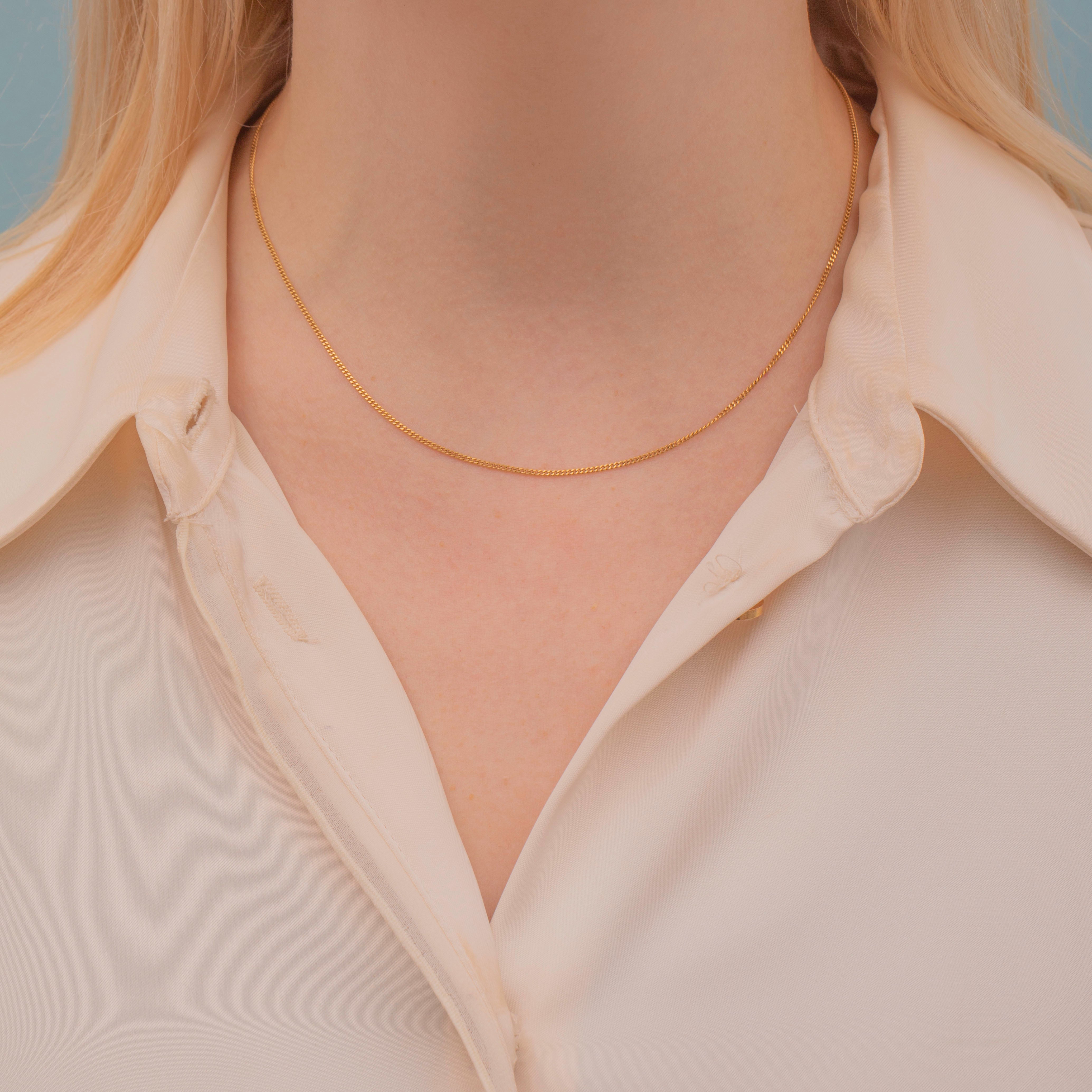 This 18ct Gold French skinny pendant chain is an absolute delight! Each of the sumptuous 18ct curb links glisten in the light, giving her an expensive feel as she adorns your décolletage.