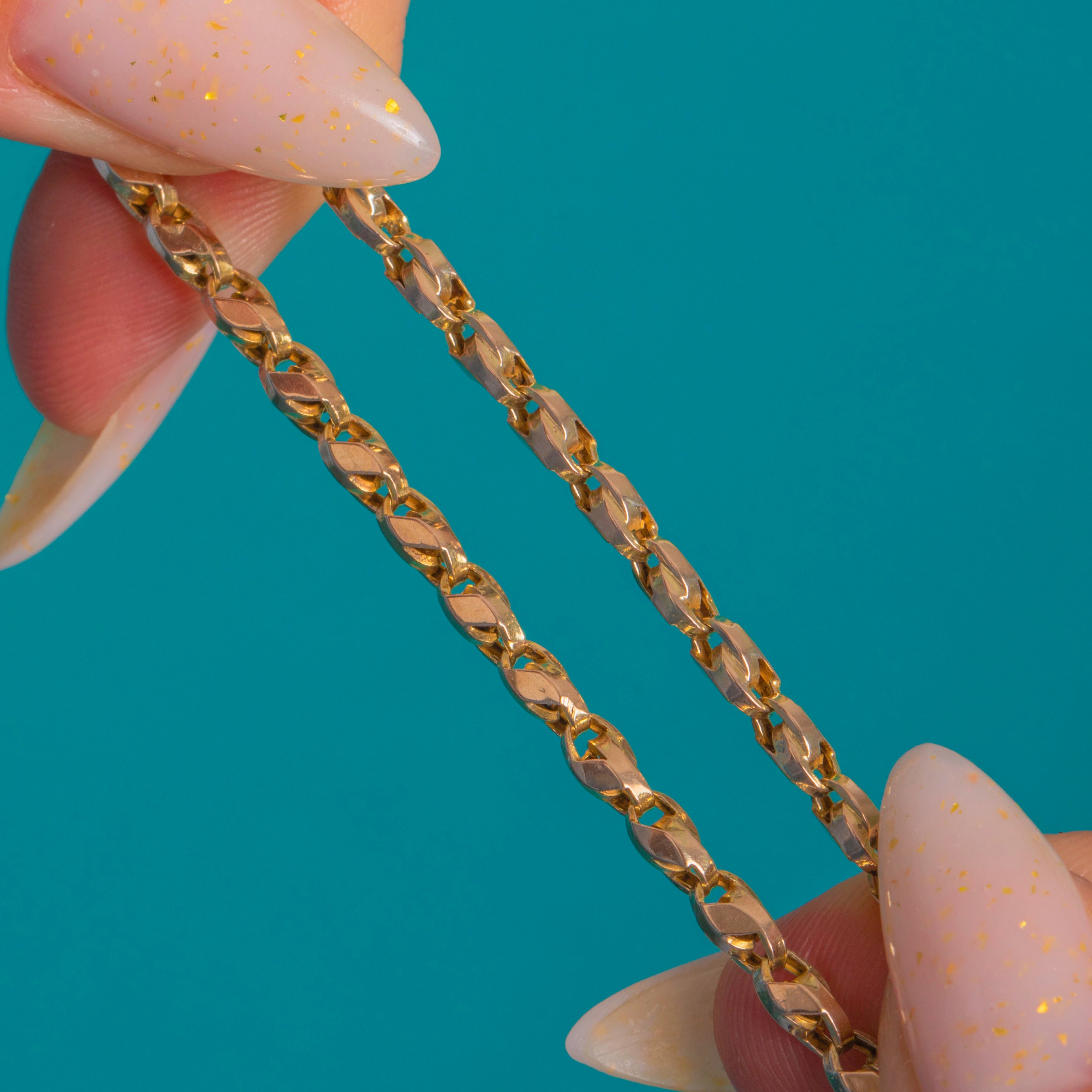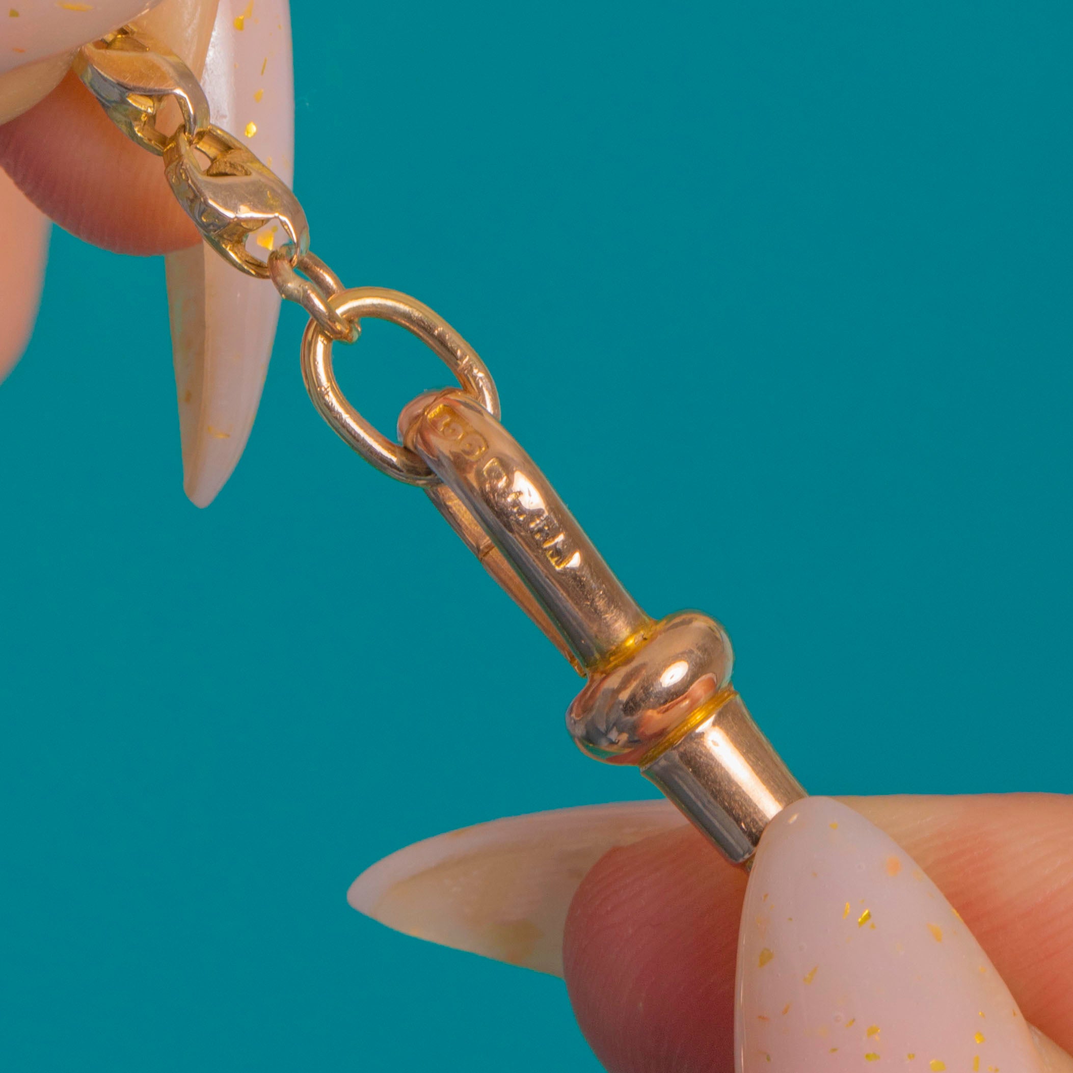A luminous Victorian 9ct Gold Tulip chain, finished with a classic dog clip for that timeless watch-chain allure. The refined tulip links offer subtle faceting that catches the light beautifully, delivering a sleek, minimalist sparkle in a warm Yellow Gold hue.