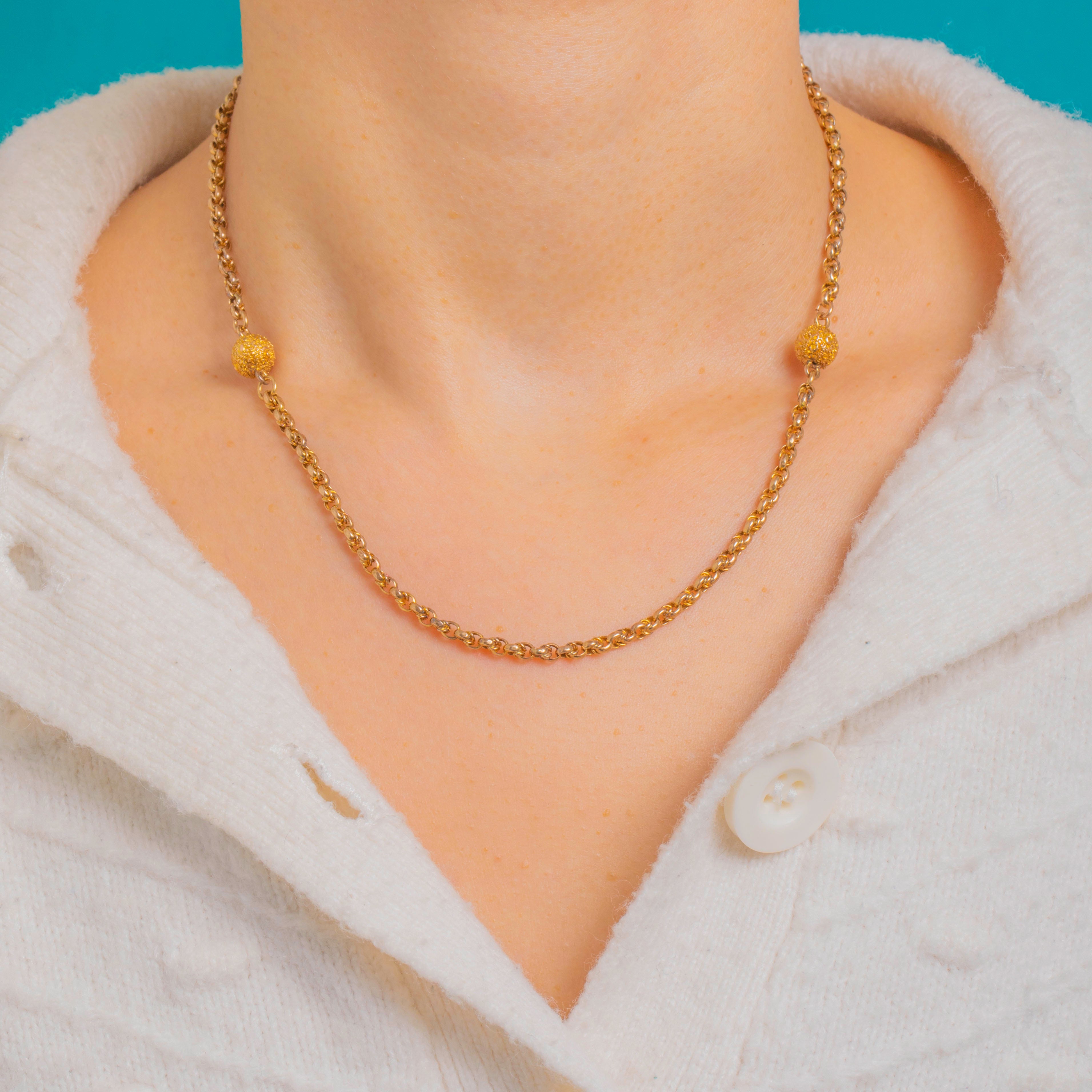 An elegant 9ct Gold fancy chain with a tactile ball-link accent, this necklace sits beautifully at the collarbone for effortless everyday luxury. The spherical bead is finely textured, lending a subtle sparkle and soft, granulated sheen against the warm Yellow Gold.