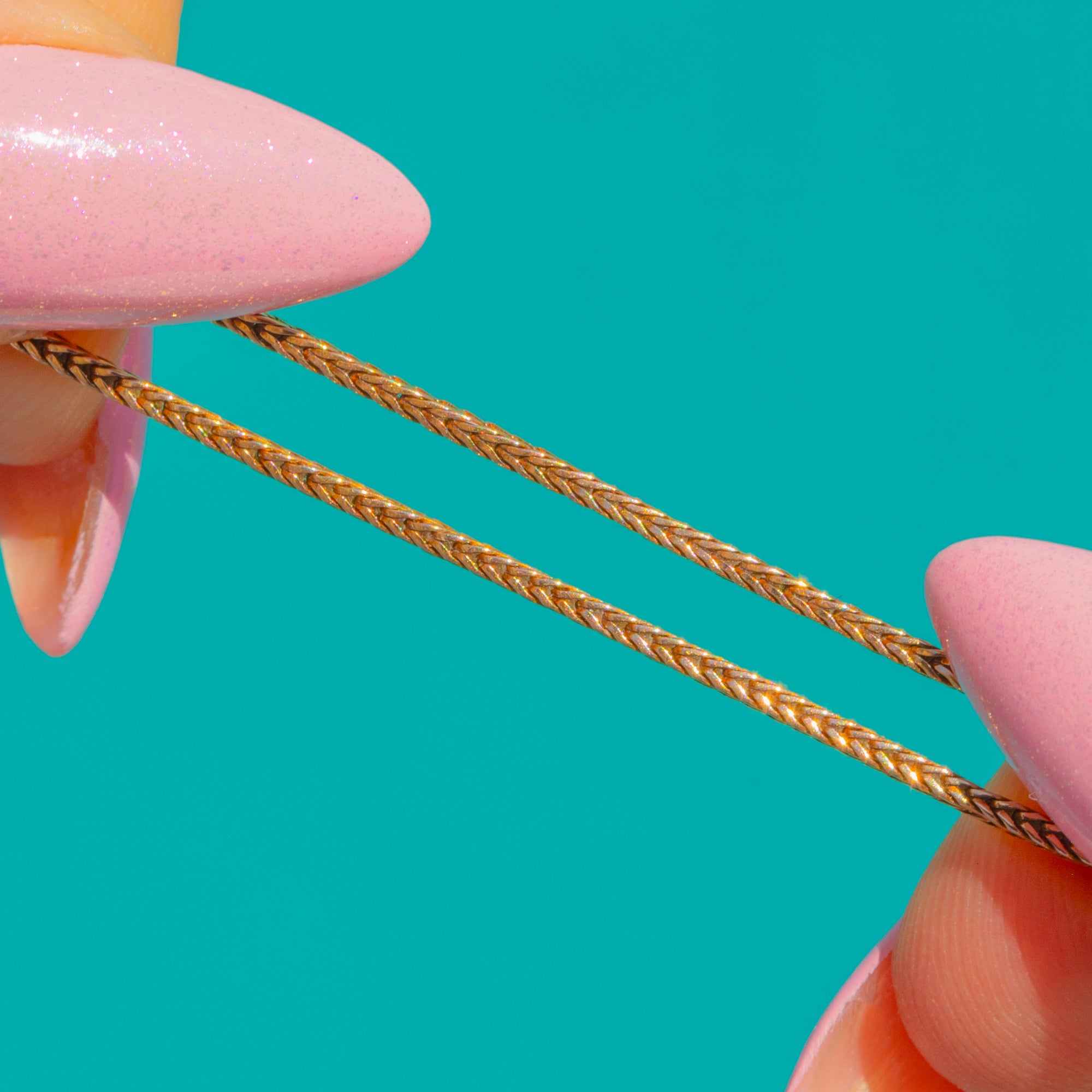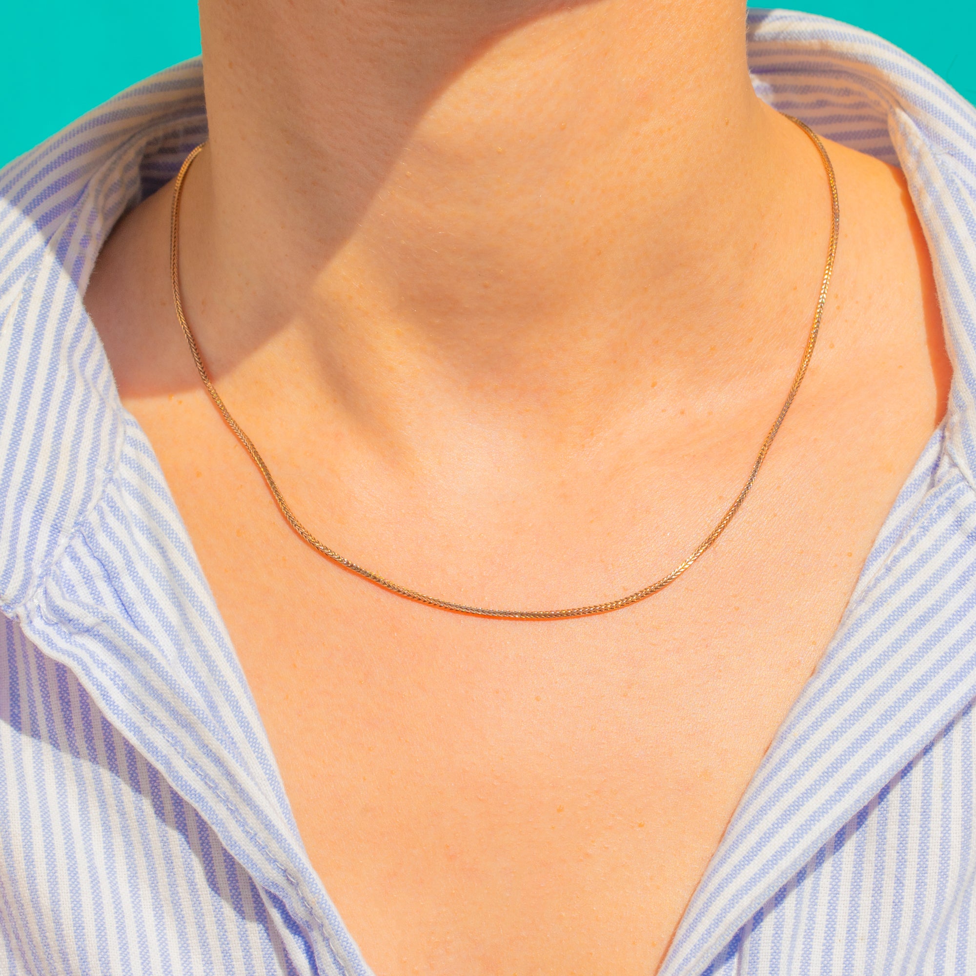 A timeless Mid-Century classic, this 9ct Gold Foxtail chain lies beautifully at the collarbone with a fine, tightly woven profile that catches the light with every movement. Its silky, braided silhouette offers an elegant glimmer and a refined finish, perfect worn solo for subtle sophistication or paired with a petite pendant for everyday luxury.