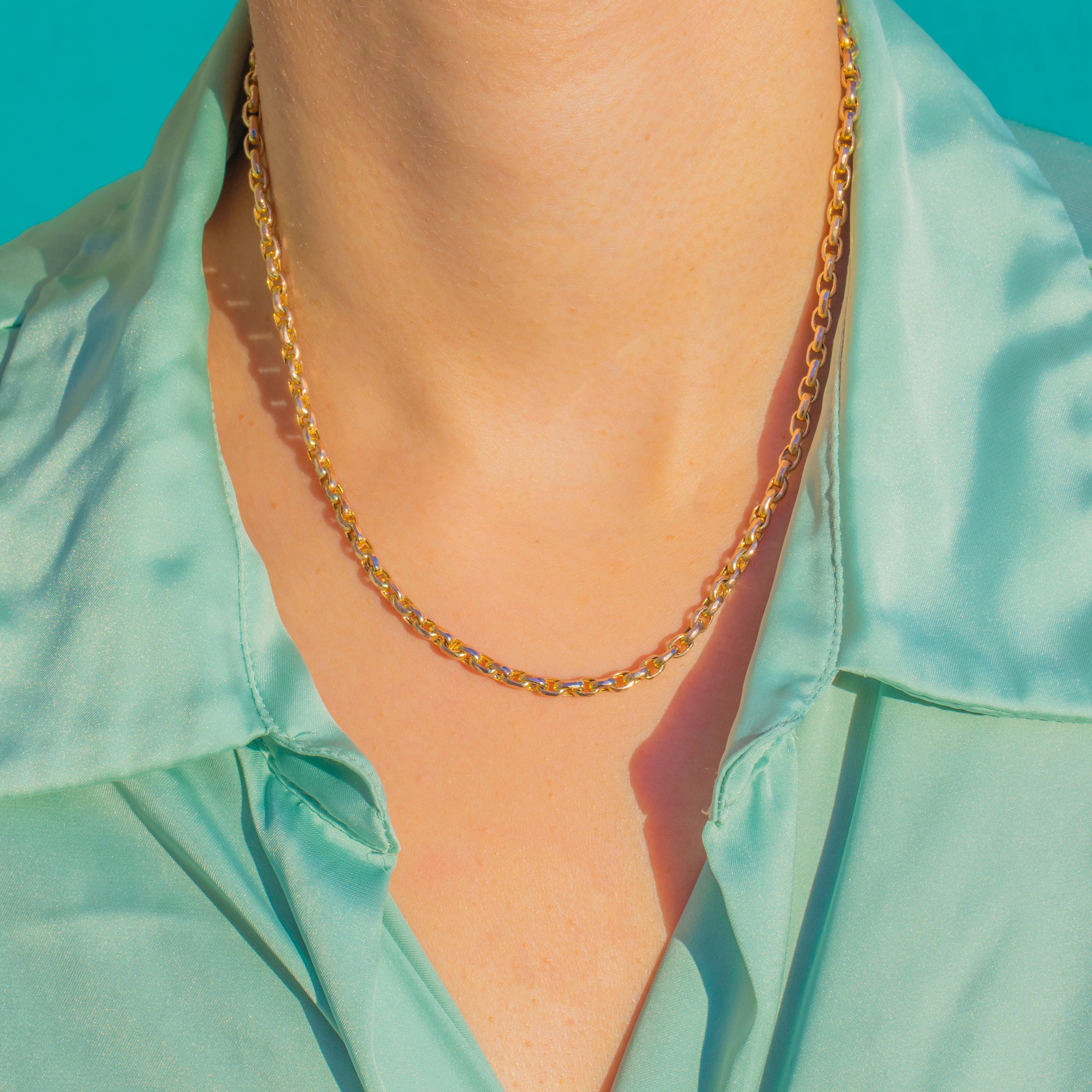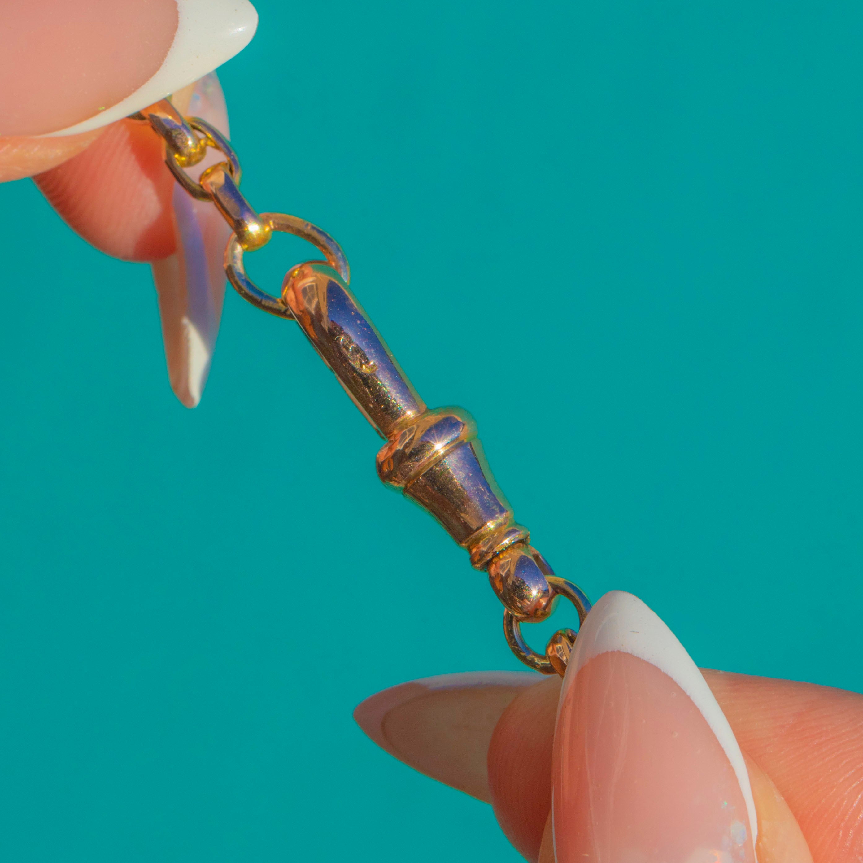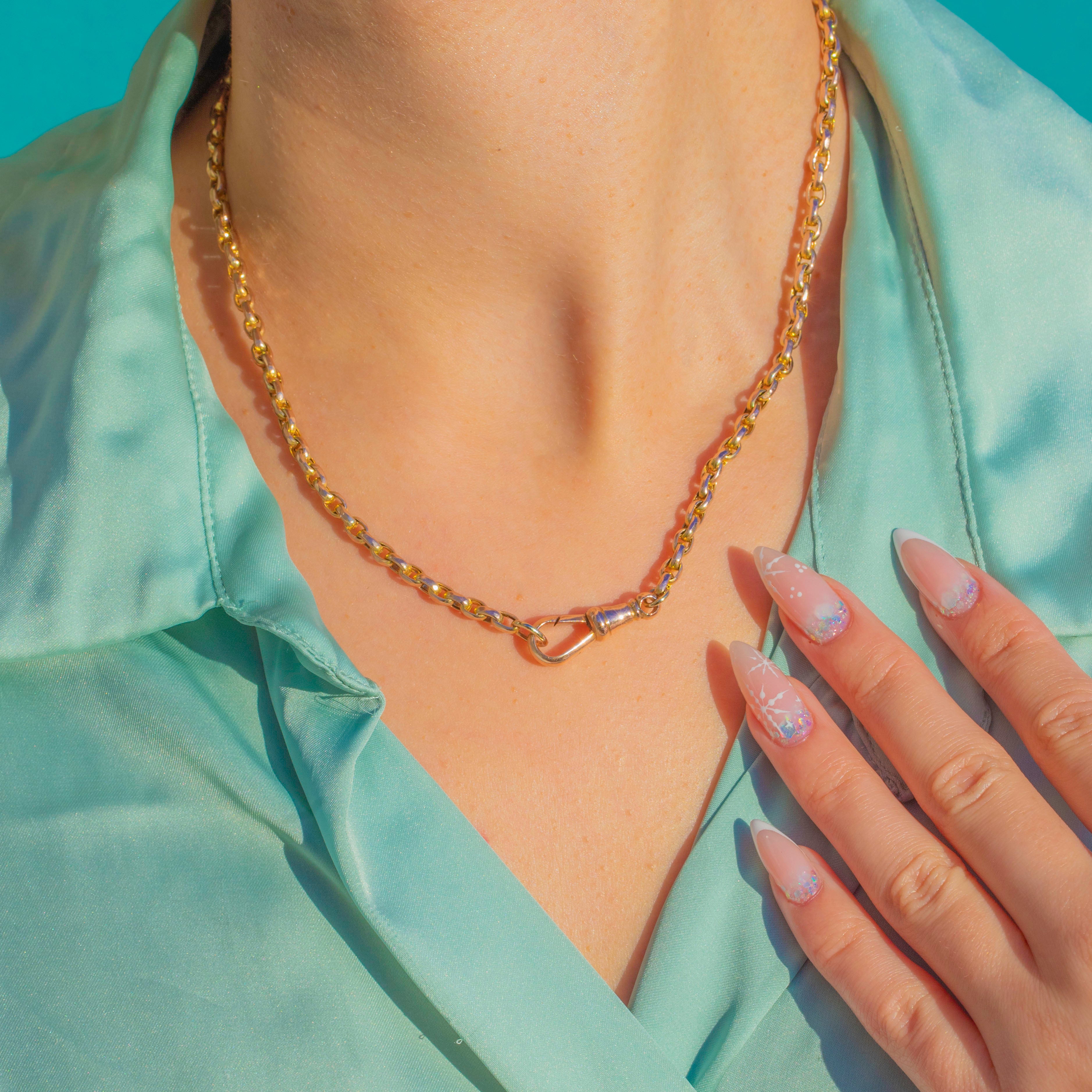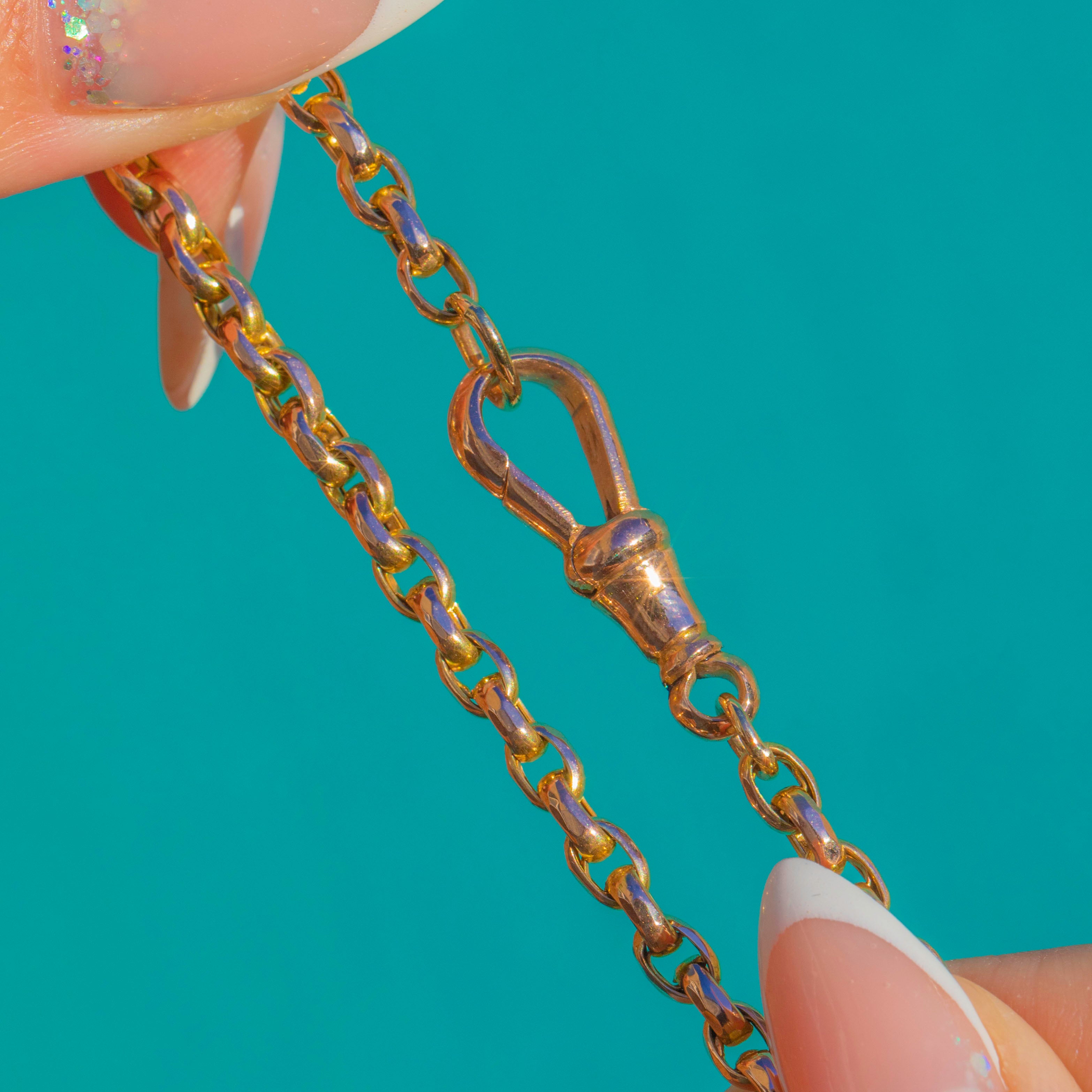 A classic Victorian belcher chain with an antique dog clip, this beauty pairs uniform oval links with a sleek, minimalist silhouette. Its warm Yellow Gold tone makes it an effortless everyday staple, equally elegant worn alone or styled with your favourite pendants and charms with use of the dog clip.