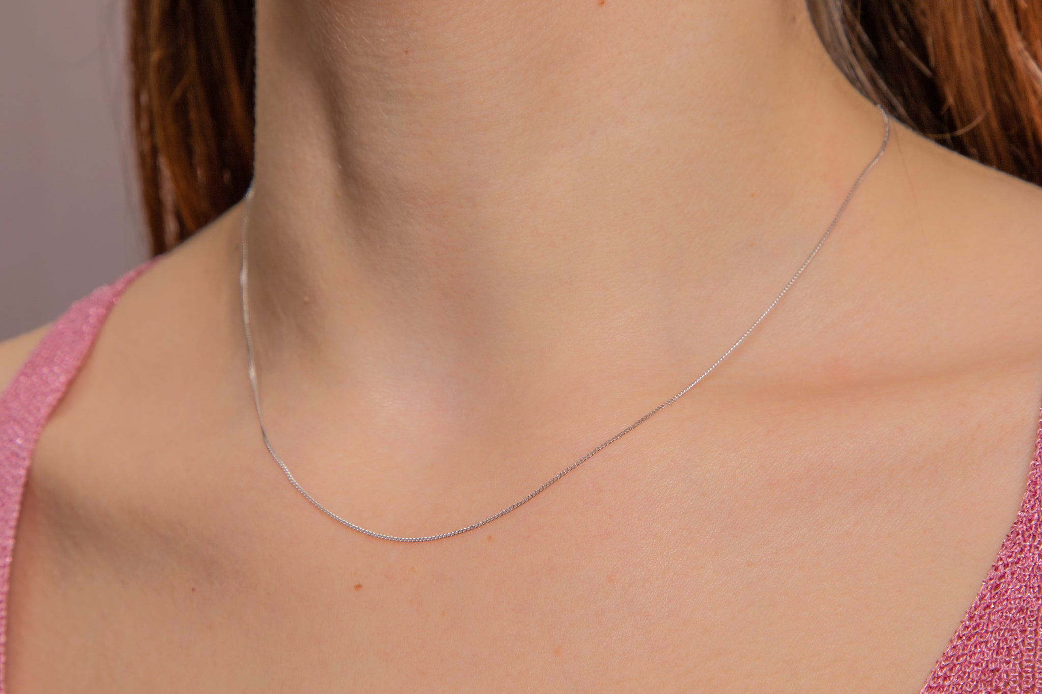 EXCELLENT. This 9ct White Gold skinny curb chain is in excellent condition throughout. The white Gold is bright and beautiful, the links are all secure and there is very little sign of wear. The bolt ring is in perfect working order allowing you to wear this piece confidently!