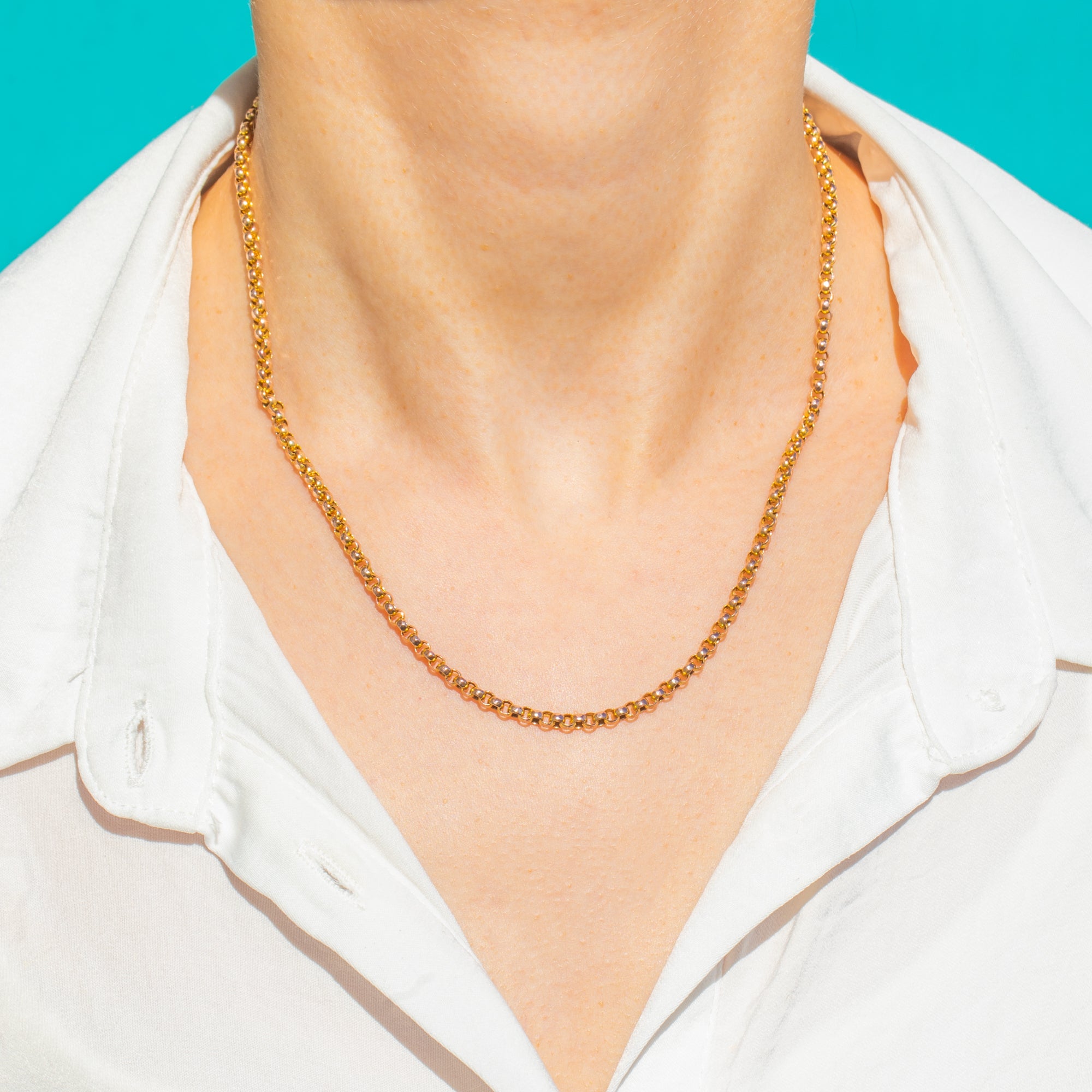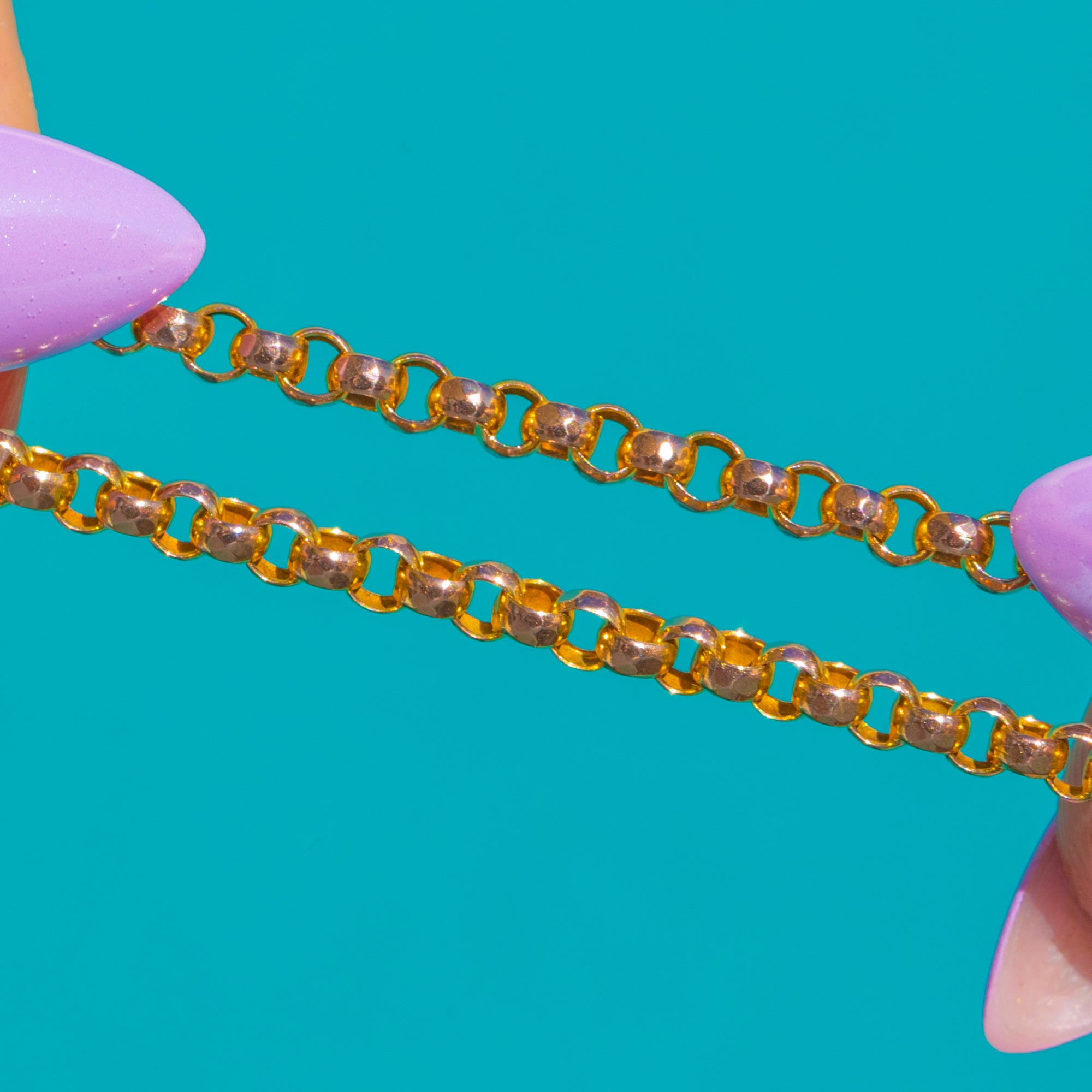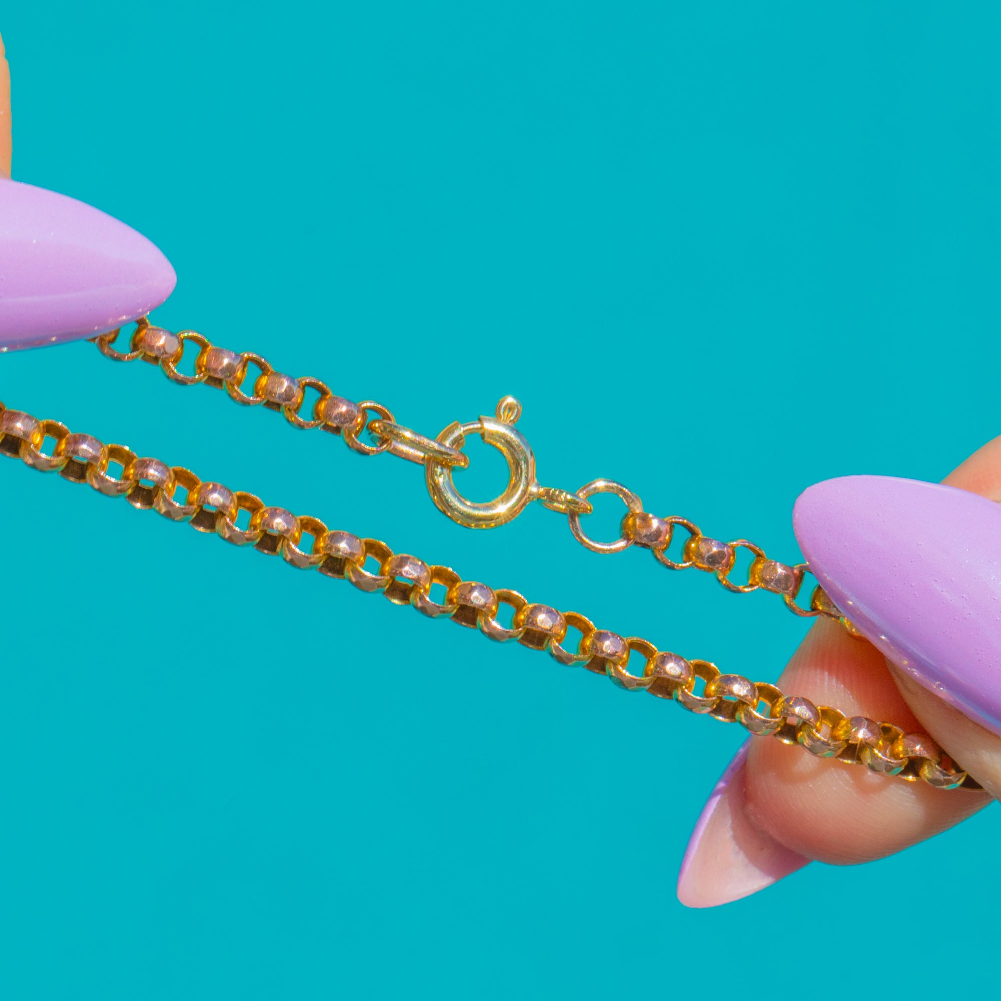 A luminous Victorian 9ct Gold faceted Belcher chain, crafted with uniform round links that glint beautifully as they move. The facets create a refined play of light, giving this classic staple an elevated, elegant finish.