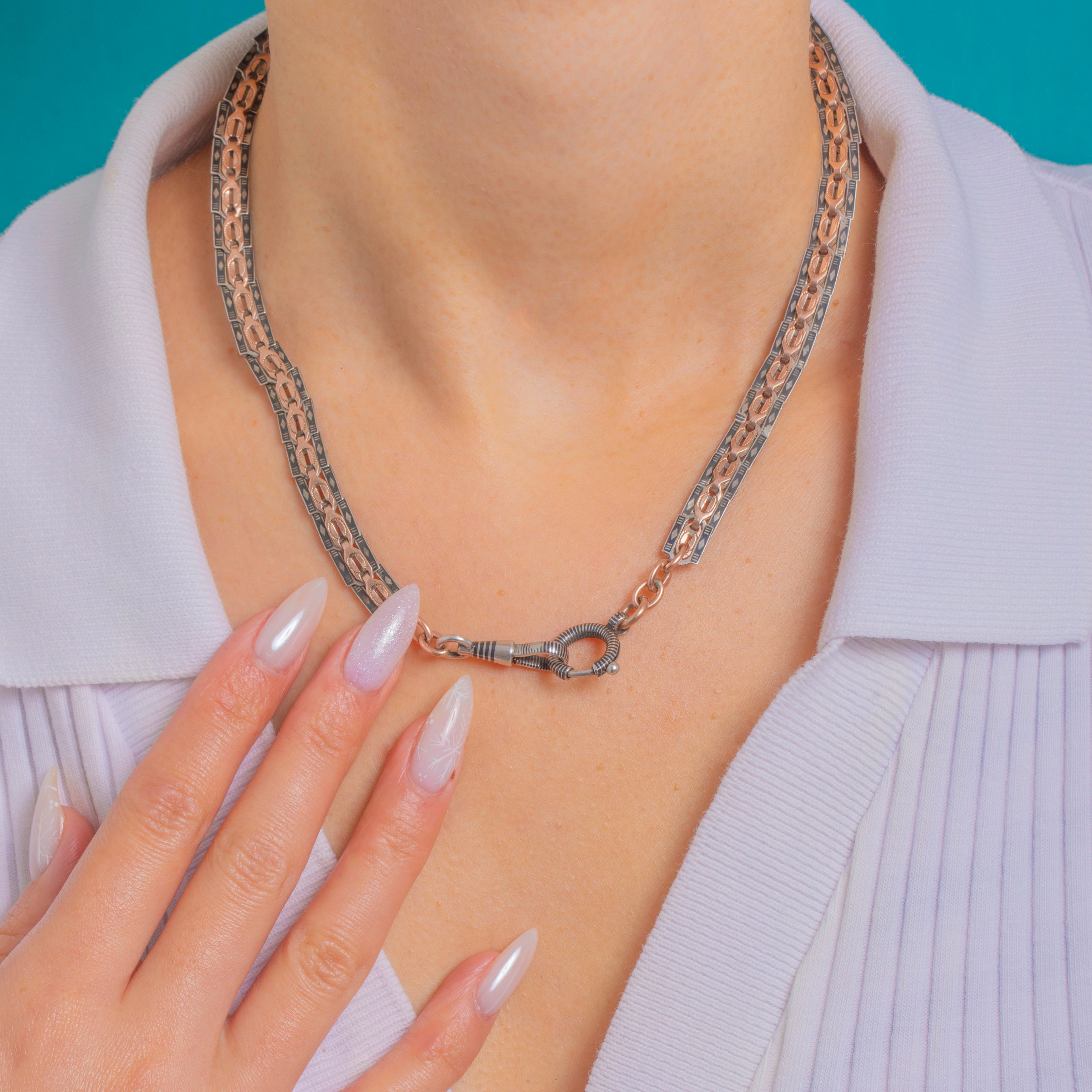 Front-closing with an oversized ribbed bolt ring, it wears as a short statement collar and nods to classic watch-chain design. Sleek, architectural ovals and linear detailing create a striking rhythm across the neckline—equally compelling worn alone or styled as a charm-holder centrepiece.