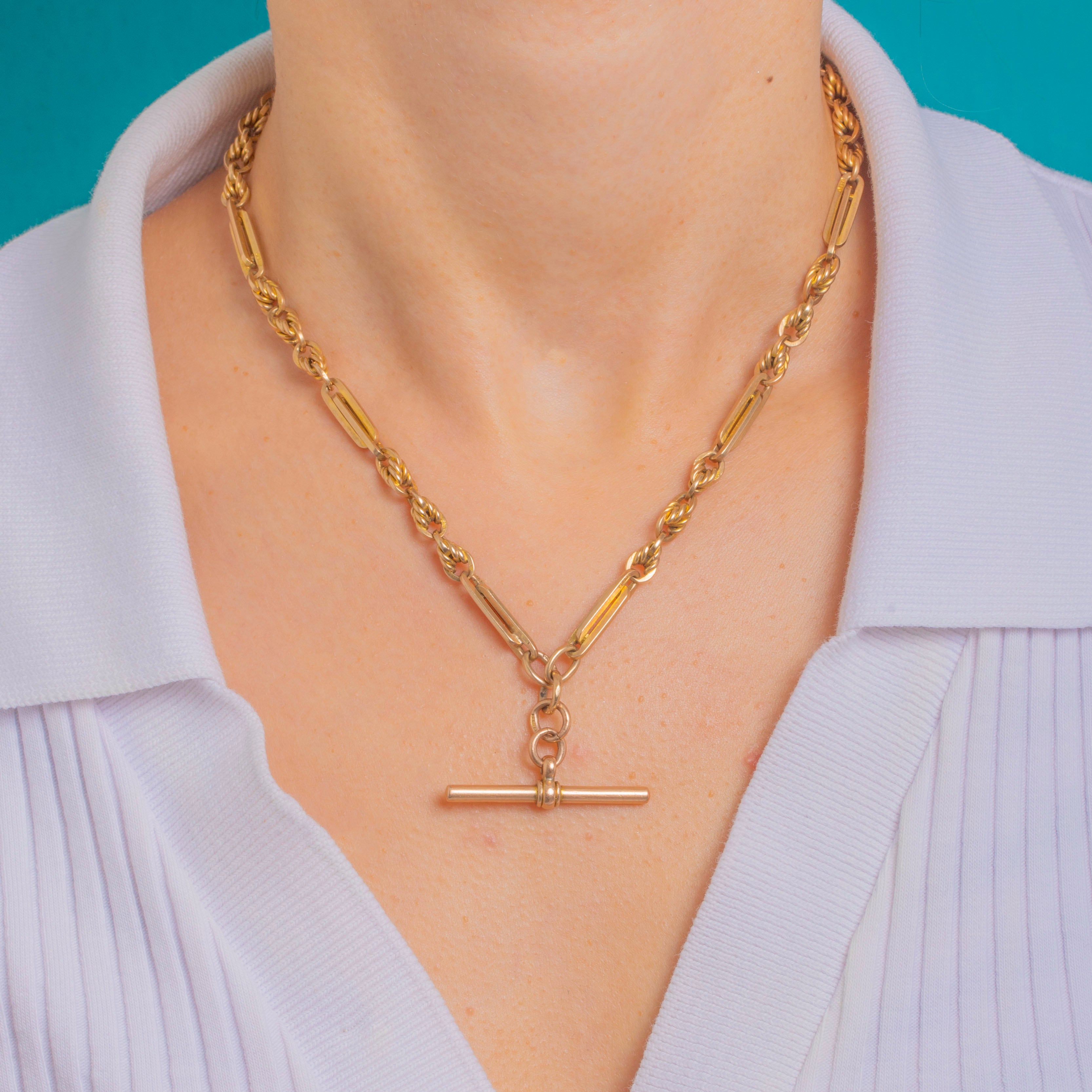 EXCELLENT: Light, even surface wear to the Gold consistent with age, with a rich antique patina and crisp links. The bolt‑ring, dog‑clip and T‑bar are secure and operate smoothly. No visible dents, repairs or distortions; this piece has been very well cared for.