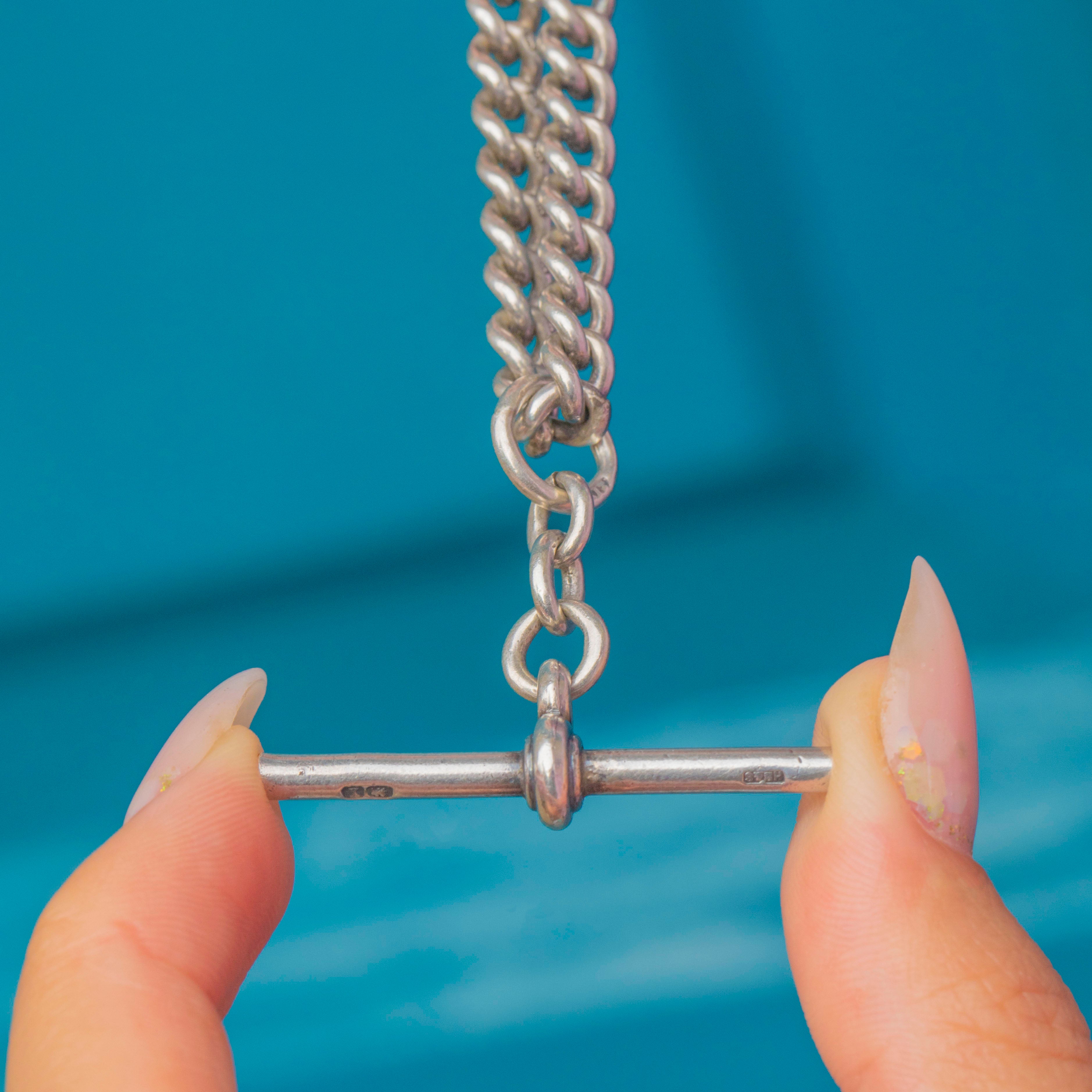 This handsome Edwardian Albert chain is crafted in solid Sterling Silver, dating to c.1900. Measuring 17.5" long, it features classic curb links with a mobile T-bar and a pair of matching dog-clips, making it ideal for wear as a necklace or as a traditional watch chain.