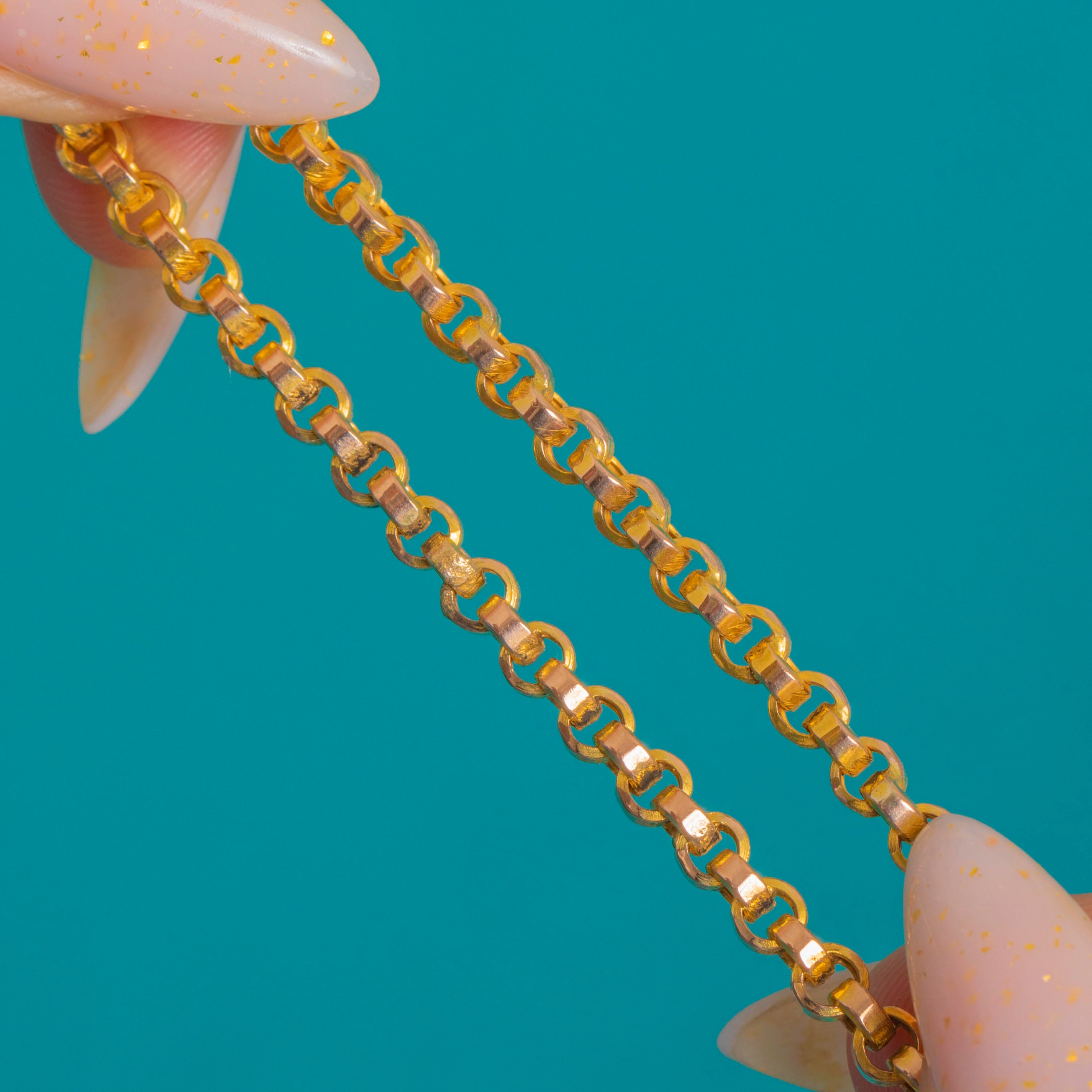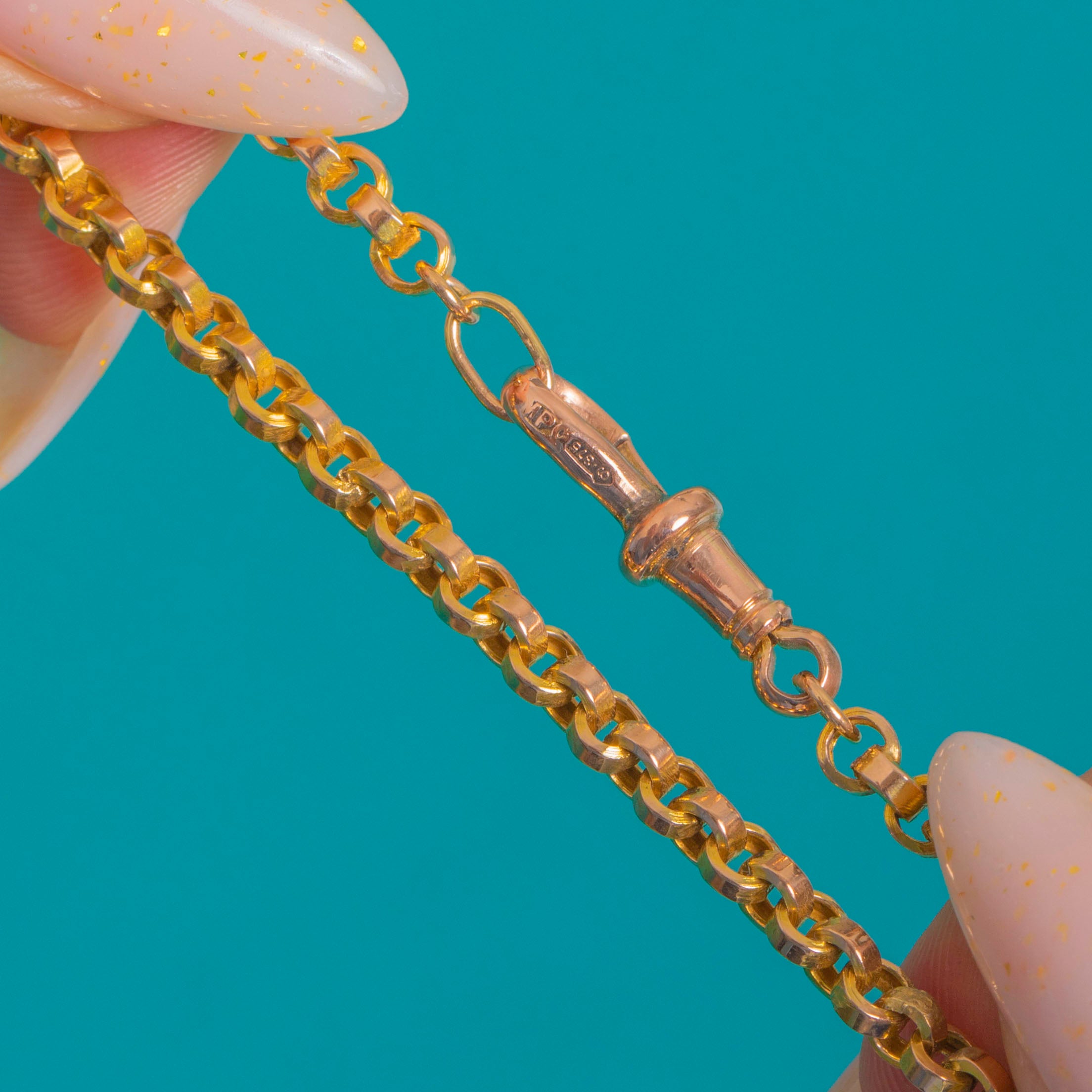 A timeless Victorian belcher chain in glowing 9ct Gold, styled with a classic spring dog-clip for that coveted watch-chain look. The uniform round links have a satisfyingly sturdy feel and a bright polish, offering clean geometry and effortless elegance.