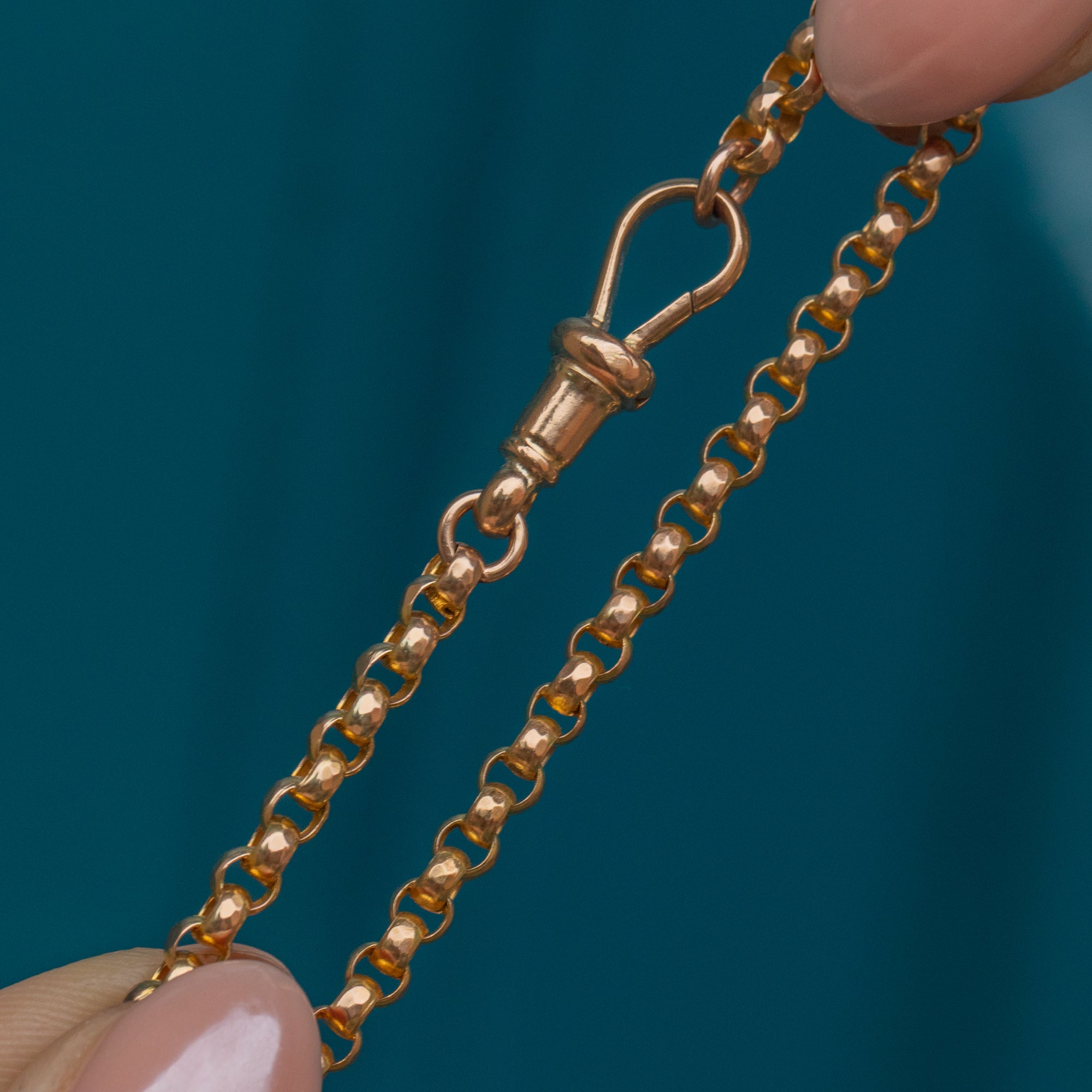At 17" long, this Victorian Gold chain will sit snugly around your neckline, leaving plenty of room for adding to your neck stack across your décolletage. Crafted entirely from buttery 9ct Gold, this antique belcher chain is going to garner all the right kind of attention.
