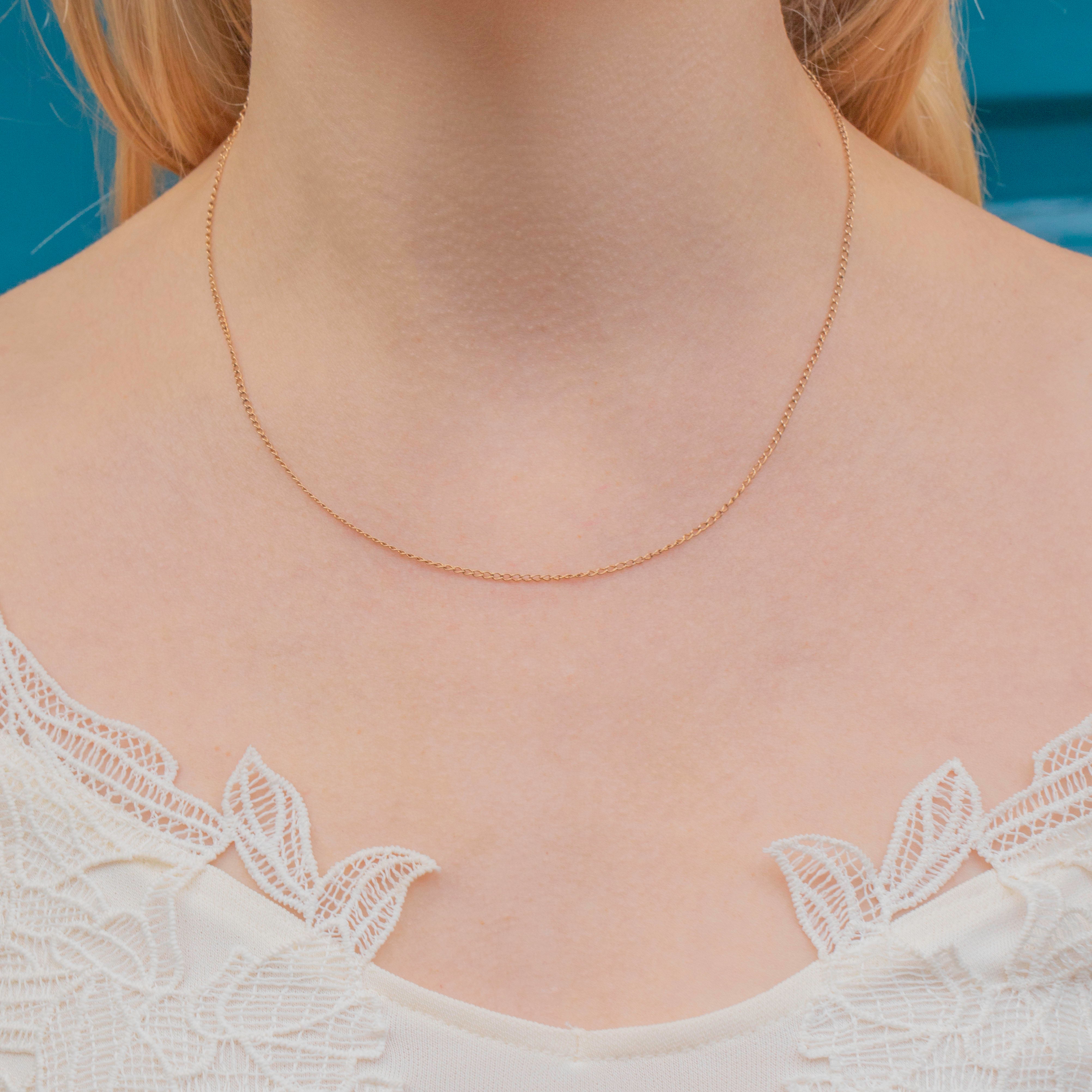 EXCELLENT. This 17" antique 9ct Gold skinny pendant chain is in excellent condition! Her smooth curb links are uniform and secure, without any visible signs of wear. Her later added bolt ring is in great working order, allowing a confident and comfortable wear.