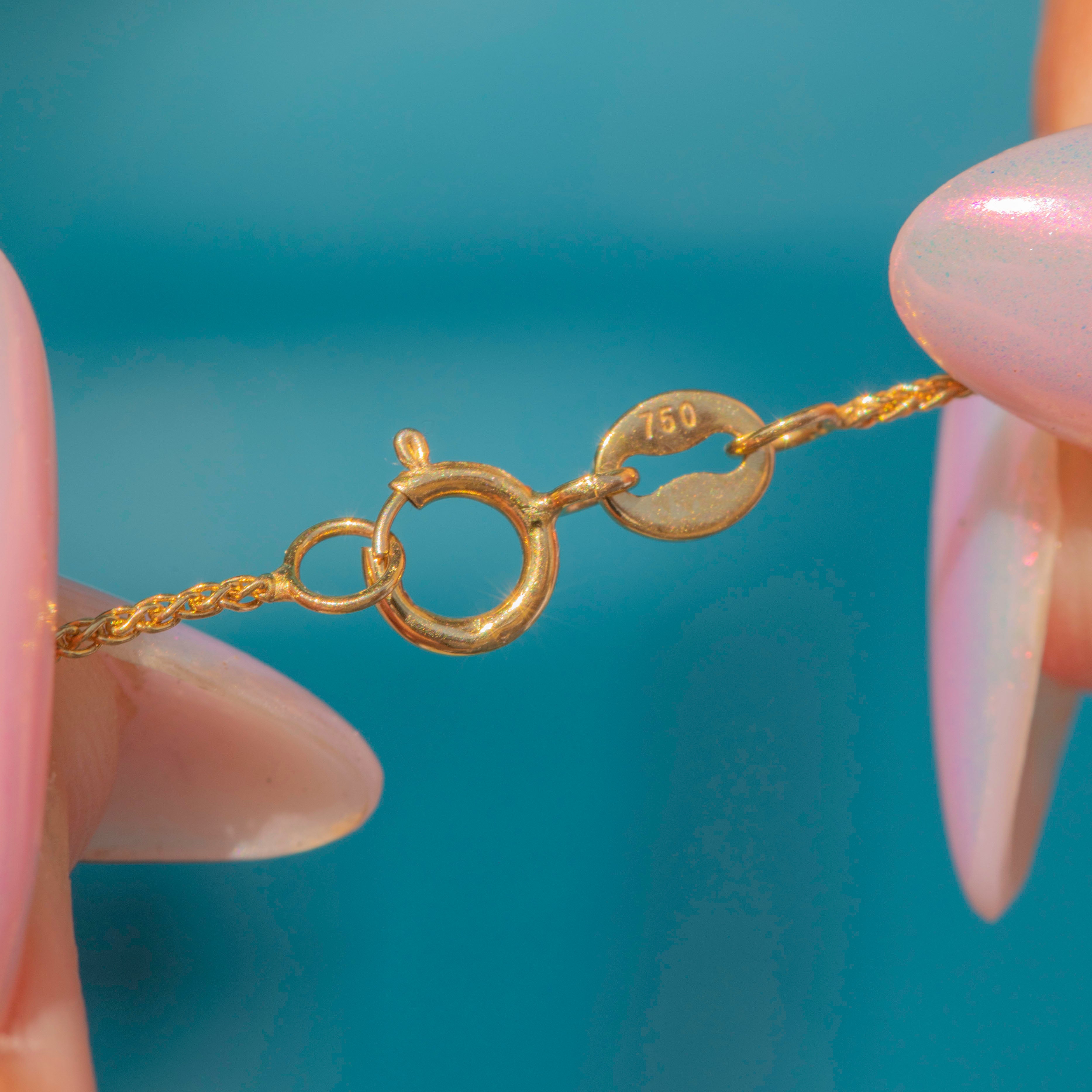 VERY GOOD: This 18" 18ct Gold Spiga link chain is in very good condition. Each link is saturated and securely connected, there is a slight kink to the chain where a previous charm may have hung, but this hardly impacts the piece. The bolt ring is slightly off-centre but still closes with security. To be worn with the utmost confidence and for all to notice and admire!