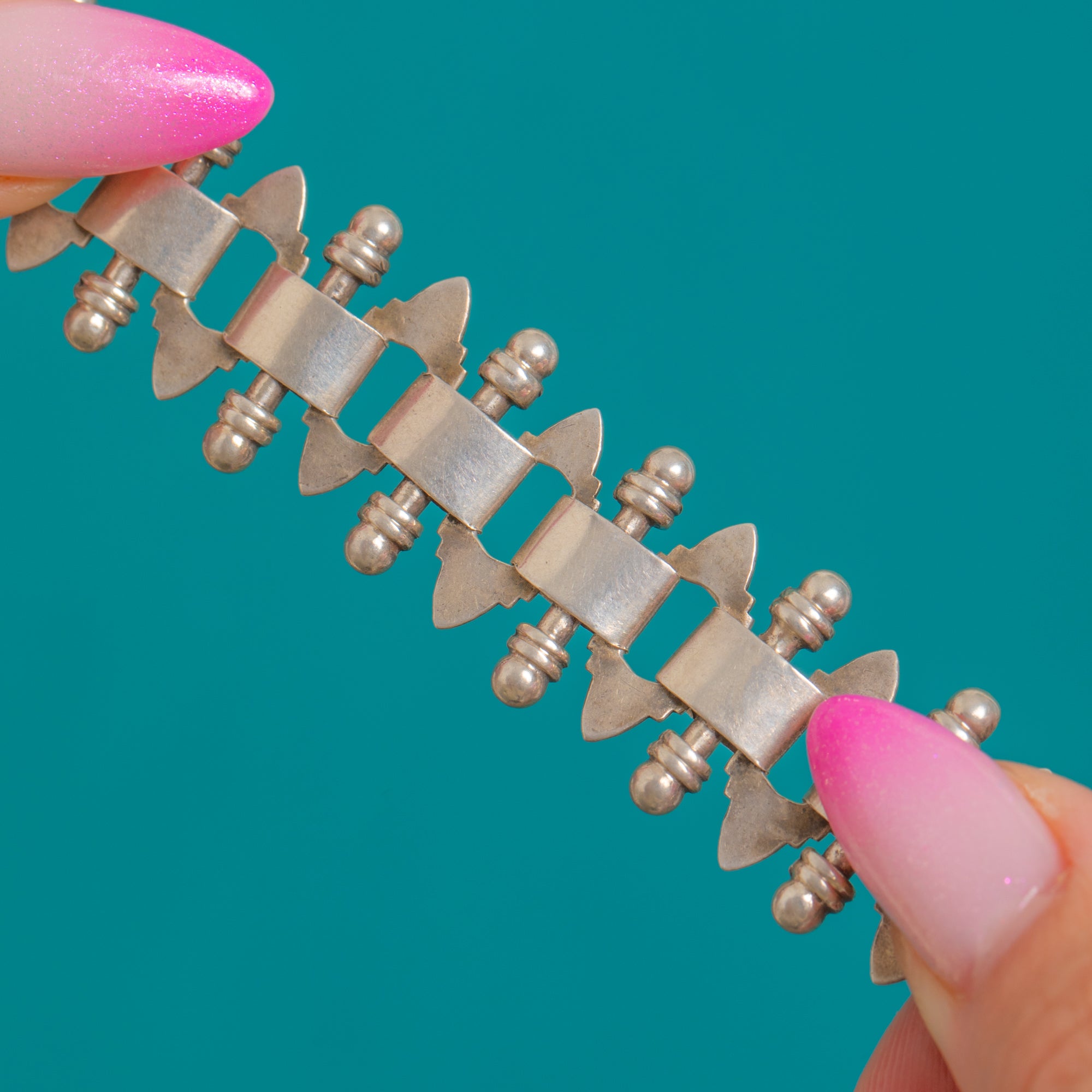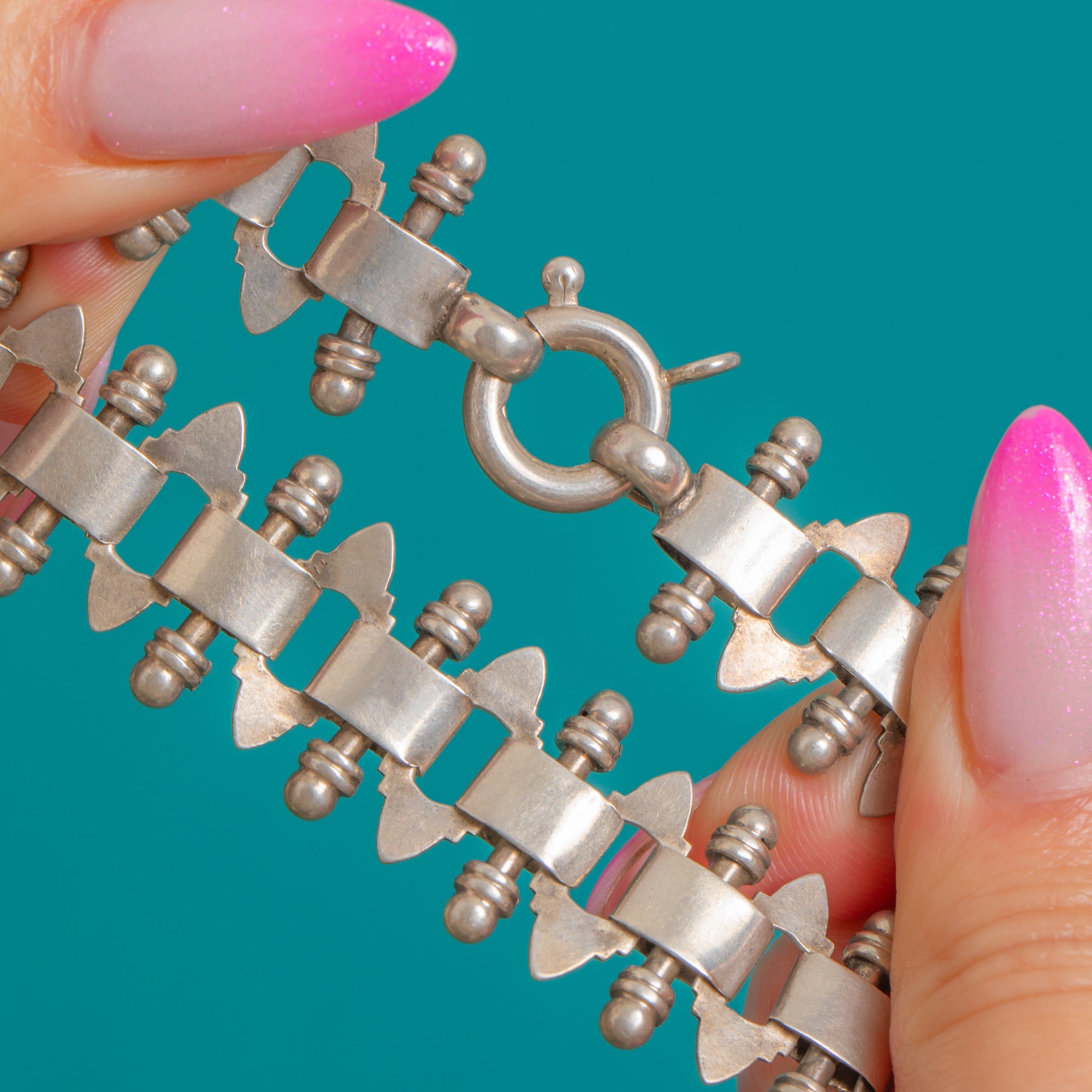 A bold Victorian Silver book chain with a wonderfully sculptural presence. Its broad, articulated plaques form a rhythmic procession around the neckline, creating that iconic Victorian silhouette that sits beautifully at the collarbone. The geometric link pattern gives it a striking, architectural feel that’s endlessly versatile—equally compelling worn solo or styled with a favourite pendant.