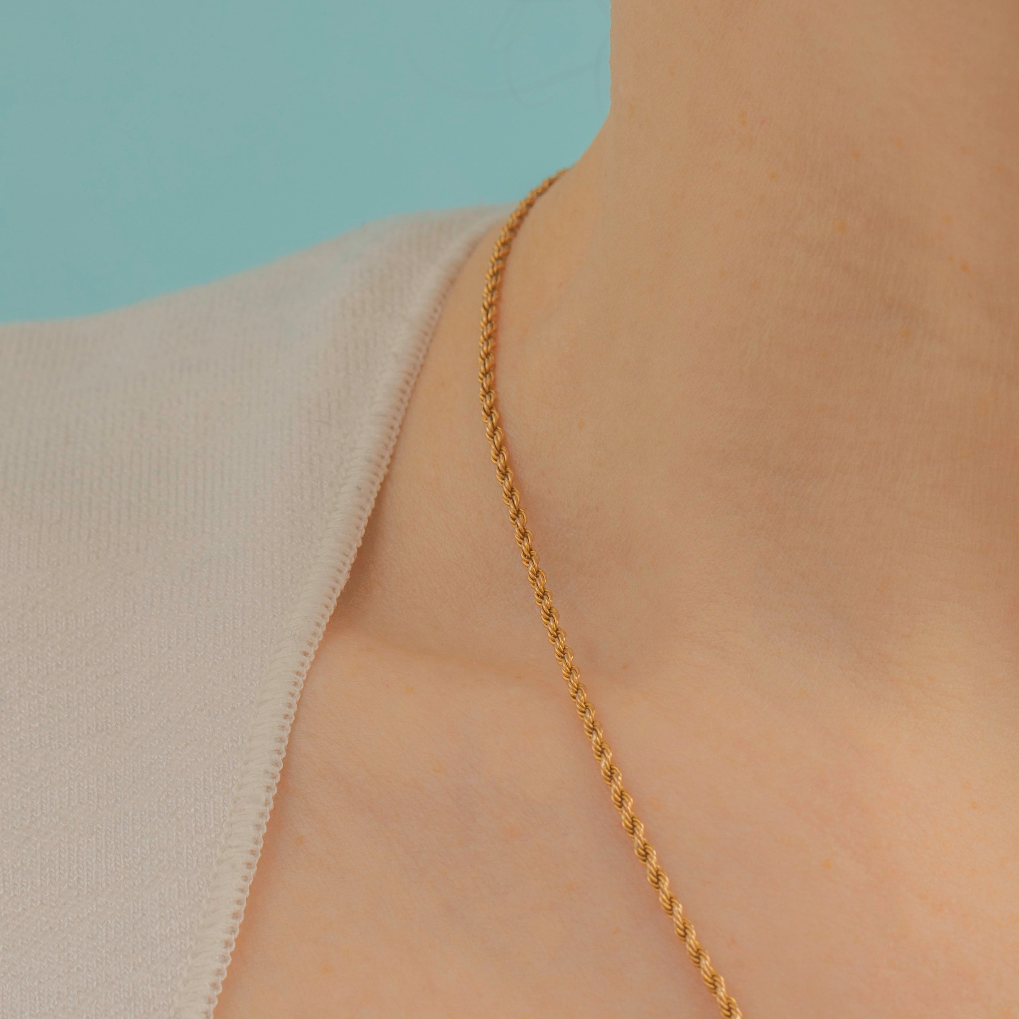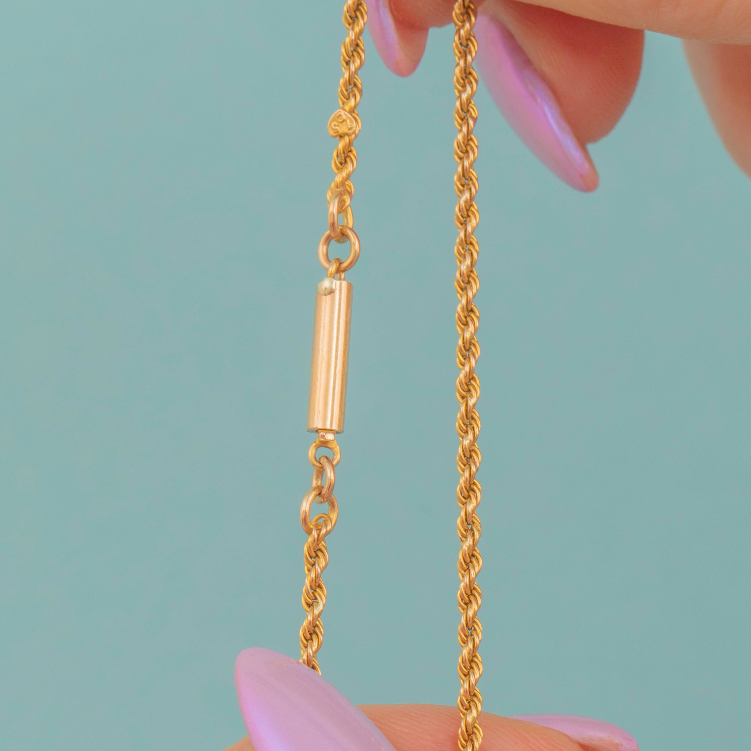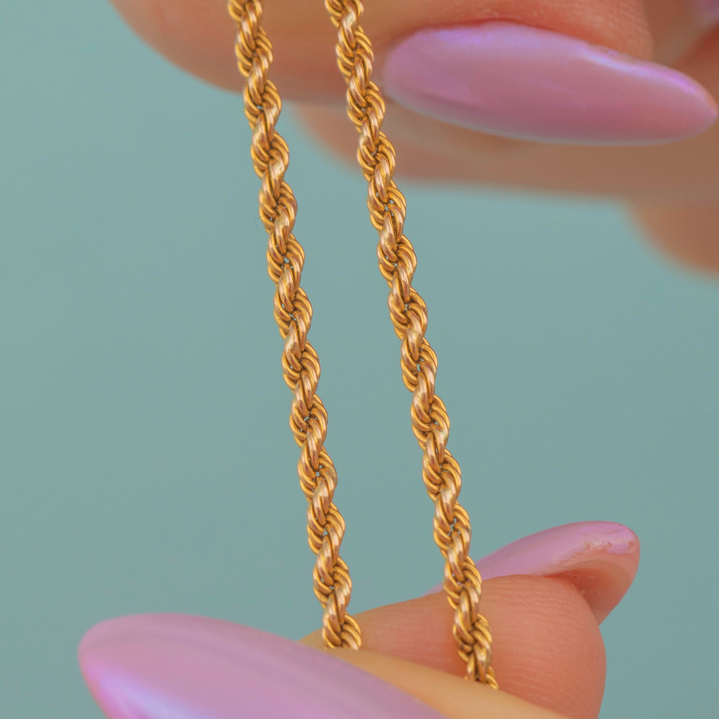 EXCELLENT. This 18" antique 15ct Gold twisted rope chain is in sublime condition throughout. Each twisted rope link is free from any damage and her 15ct Gold has retained that desirable buttery hue! Complete with a trusty barrel clasp, you can take her on and off with ease making this Victorian Gold chain perfect for everyday wear!