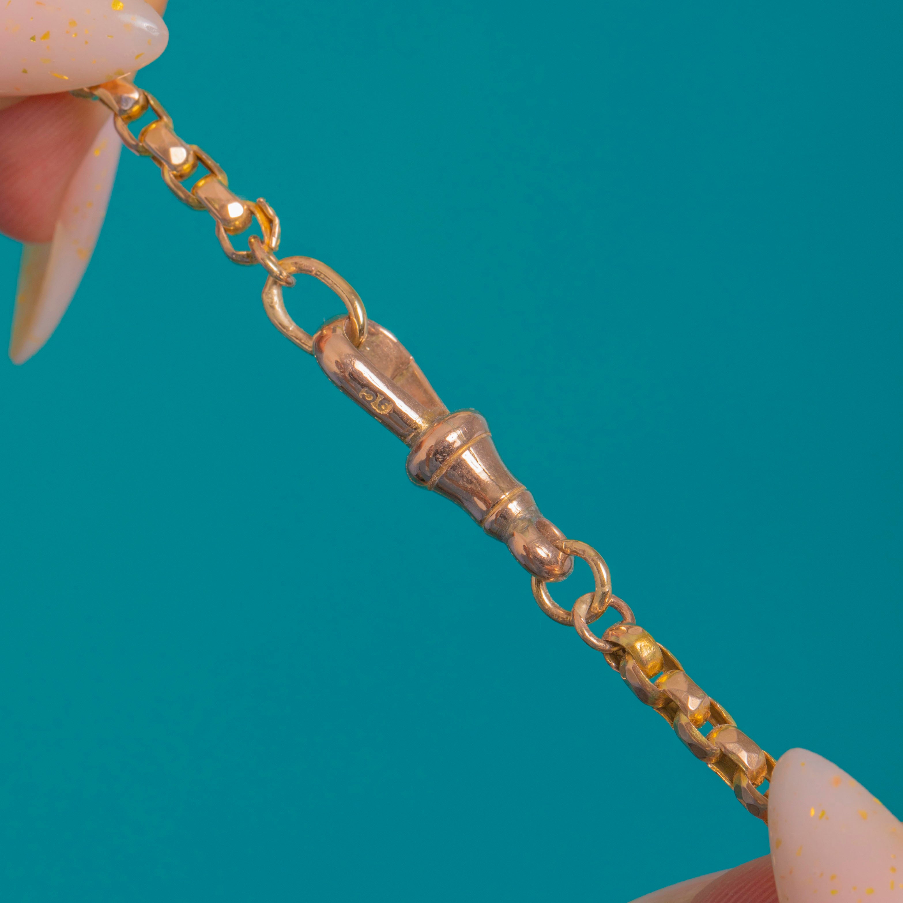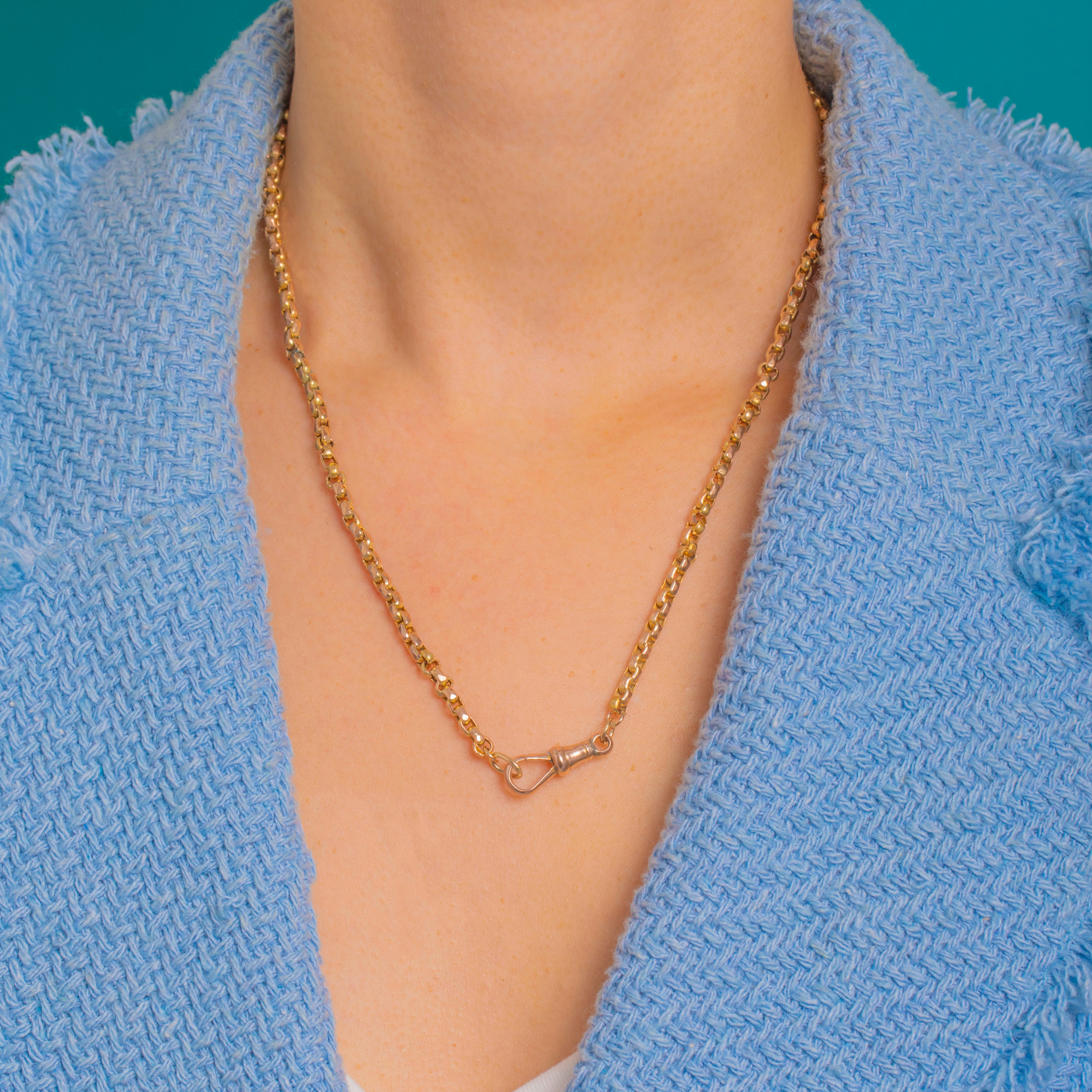 Refined and effortlessly wearable, this Victorian 9ct Gold chain showcases crisp, faceted belcher links that catch the light beautifully. The classic dog clip clasp reads a touch rosier to the chain, lending a subtle two-tone accent and that much-loved antique Albert-chain feel. Sitting at the collarbone, it’s a sleek staple with timeless poise.