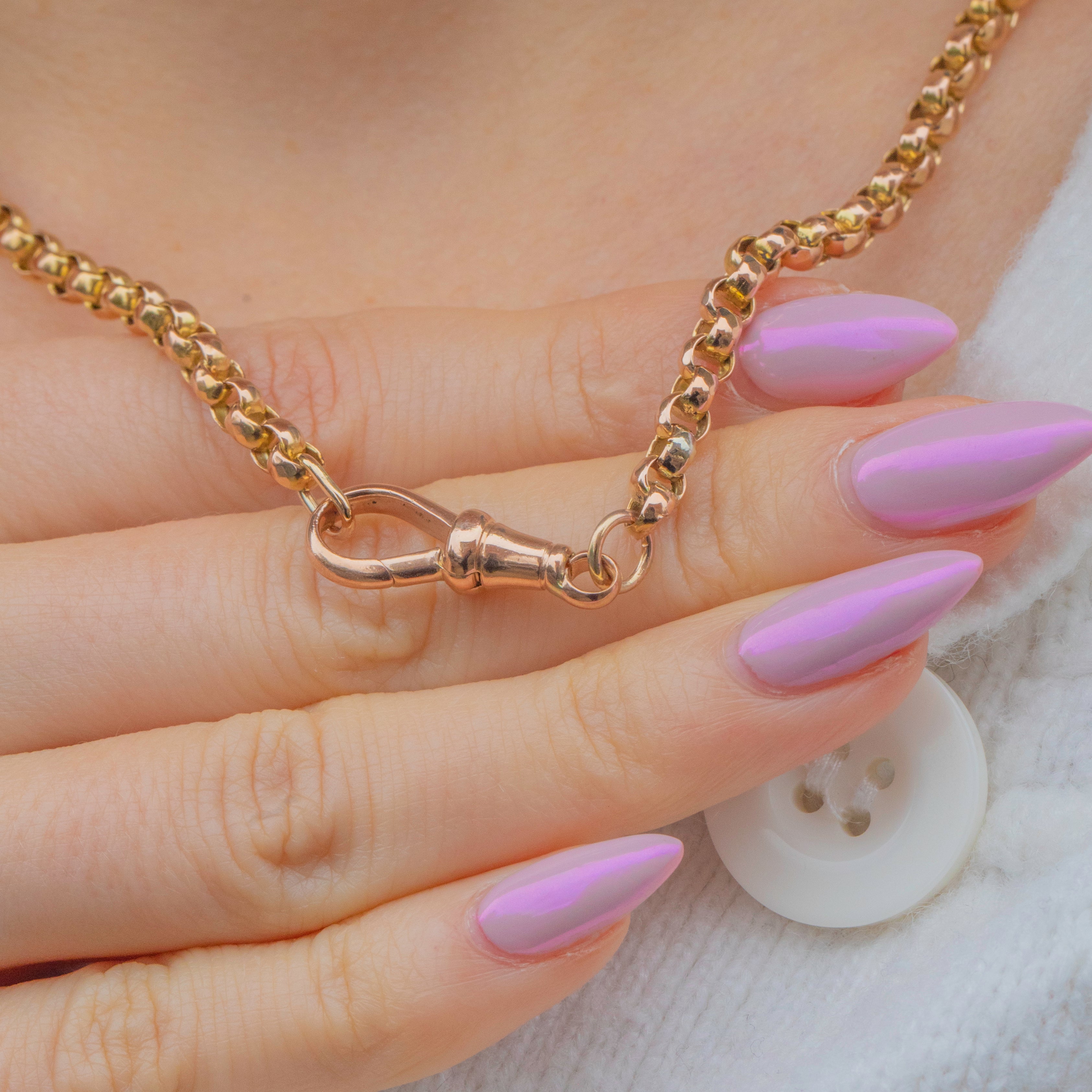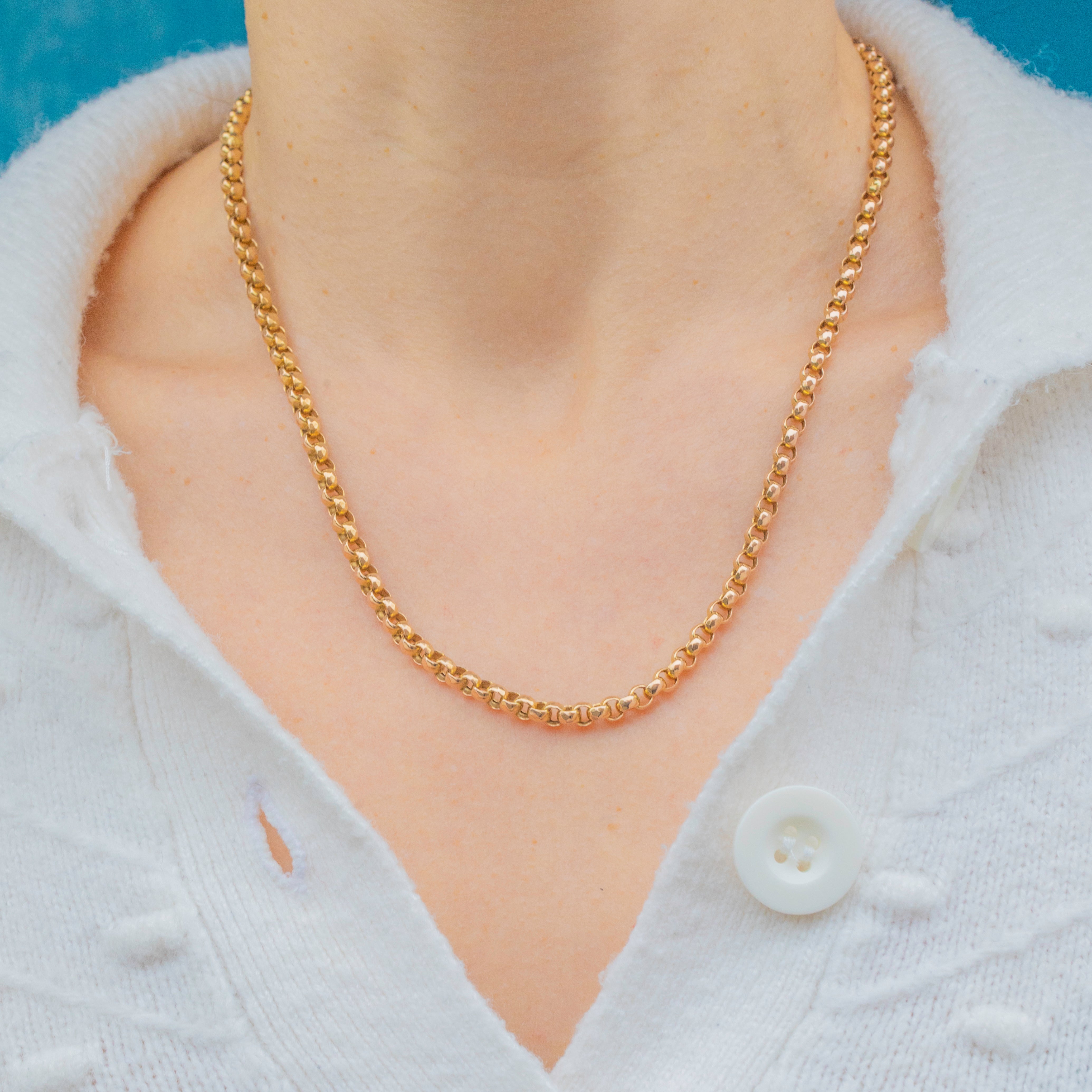 A superb Antique 9ct Gold chain of excellent weight and quality. The links are beautifully crafted with a smooth, bright polish, giving the chain a rich, buttery tone and luxurious feel. Substantial yet elegant, this classic design is perfect for everyday wear or pairing with a statement pendant or charm.
