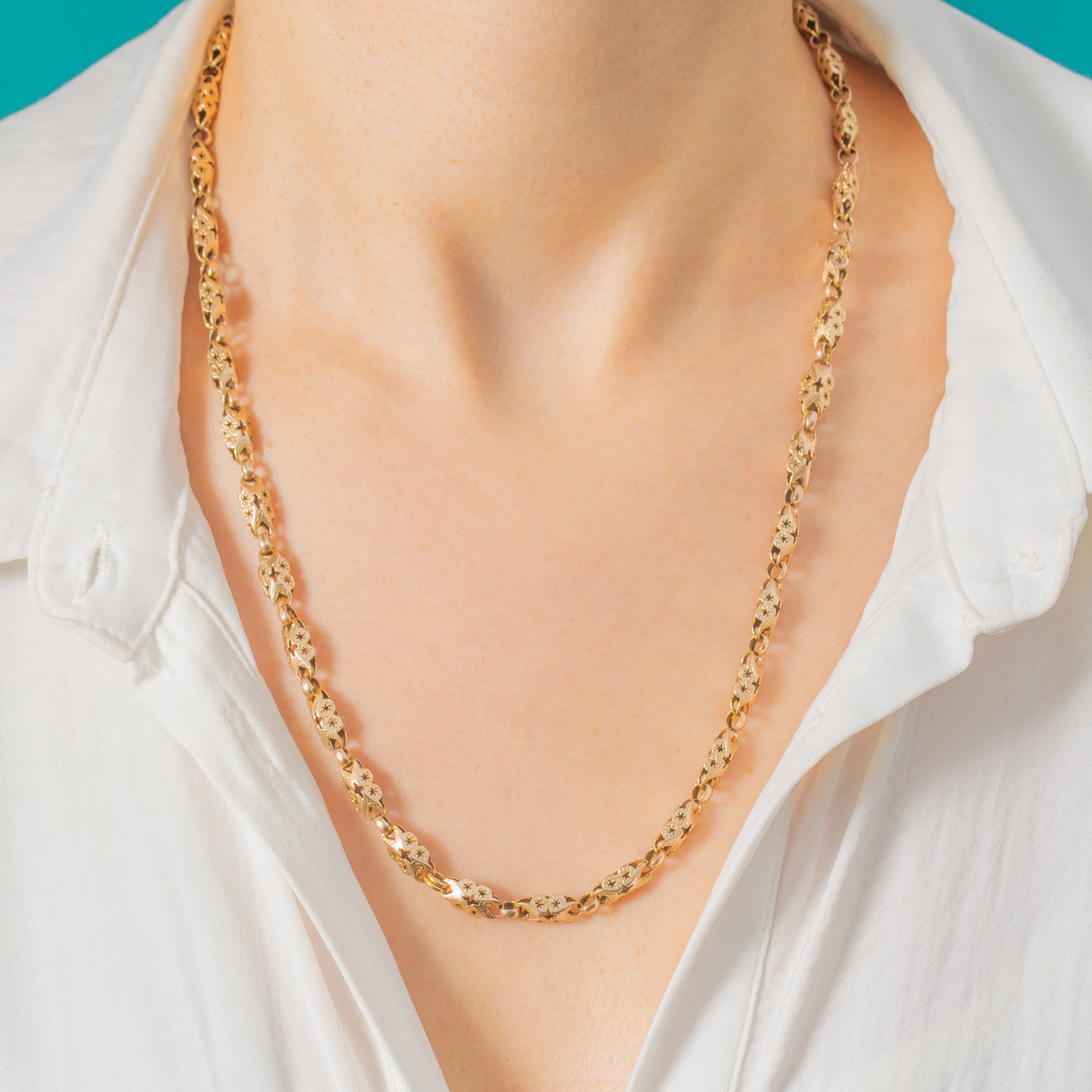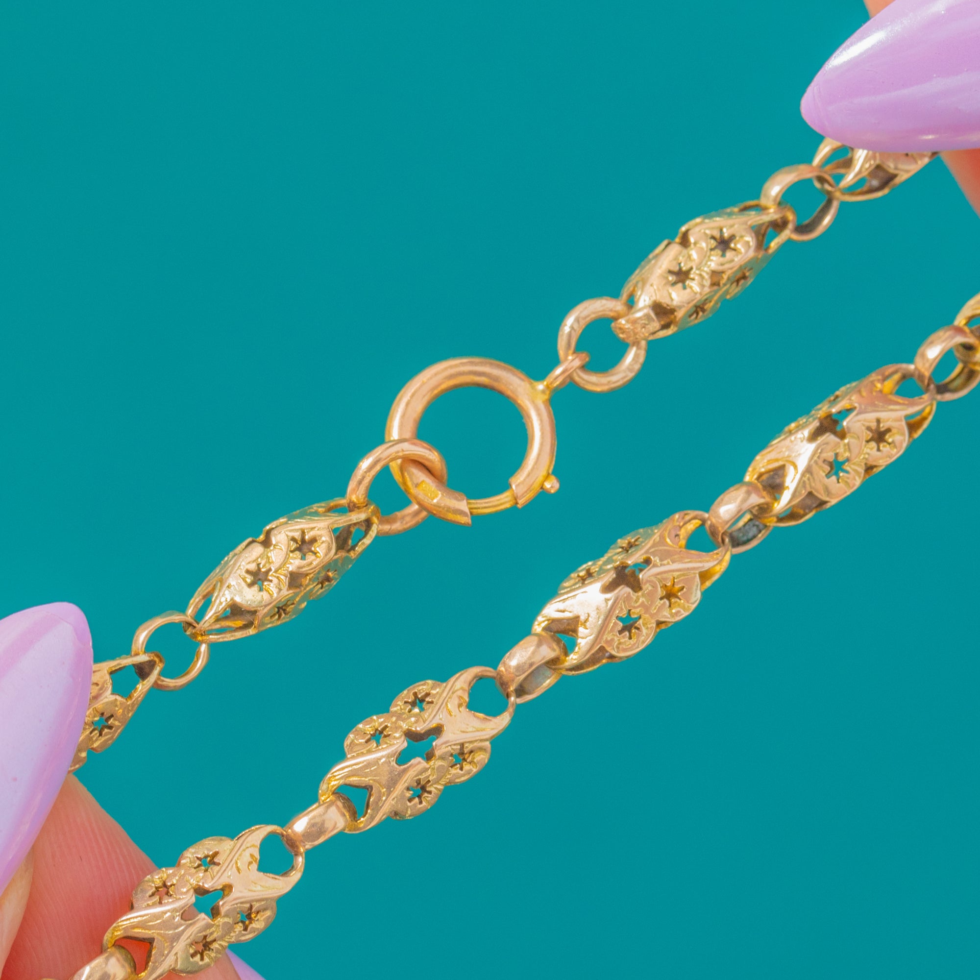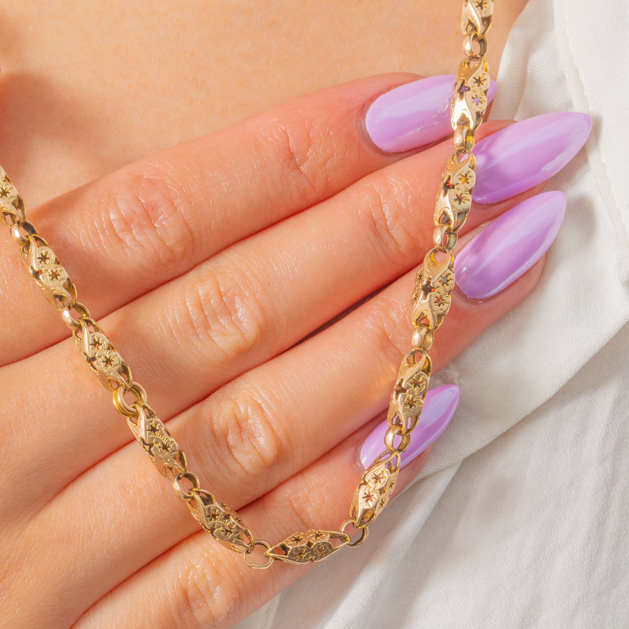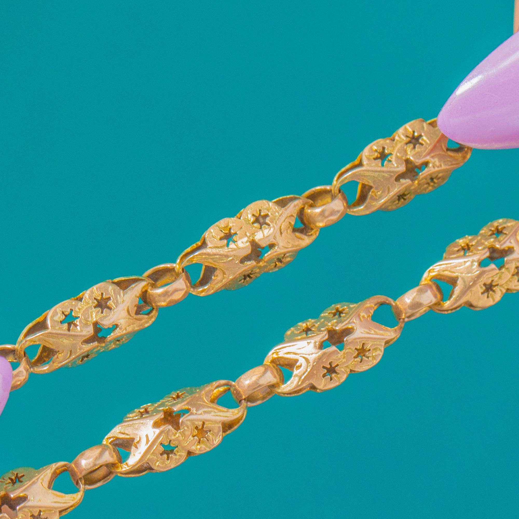Brimming with decorative charm, this Victorian 9ct Gold chain showcases a beautiful procession of pierced star panels, each one finely engraved with scrolling foliate details. The navette-shaped links are articulated for fluid movement, with the openwork starbursts catching the light as you move.