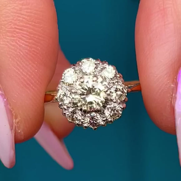 This breathtaking Mid-Century ring is set with a dazzling array of natural Diamonds totalling approximately 1.00ct. The central Diamond measures around 5mm, surrounded by a halo of 2.5mm stones in a radiant cluster formation that amplifies the sparkle and light from every angle.