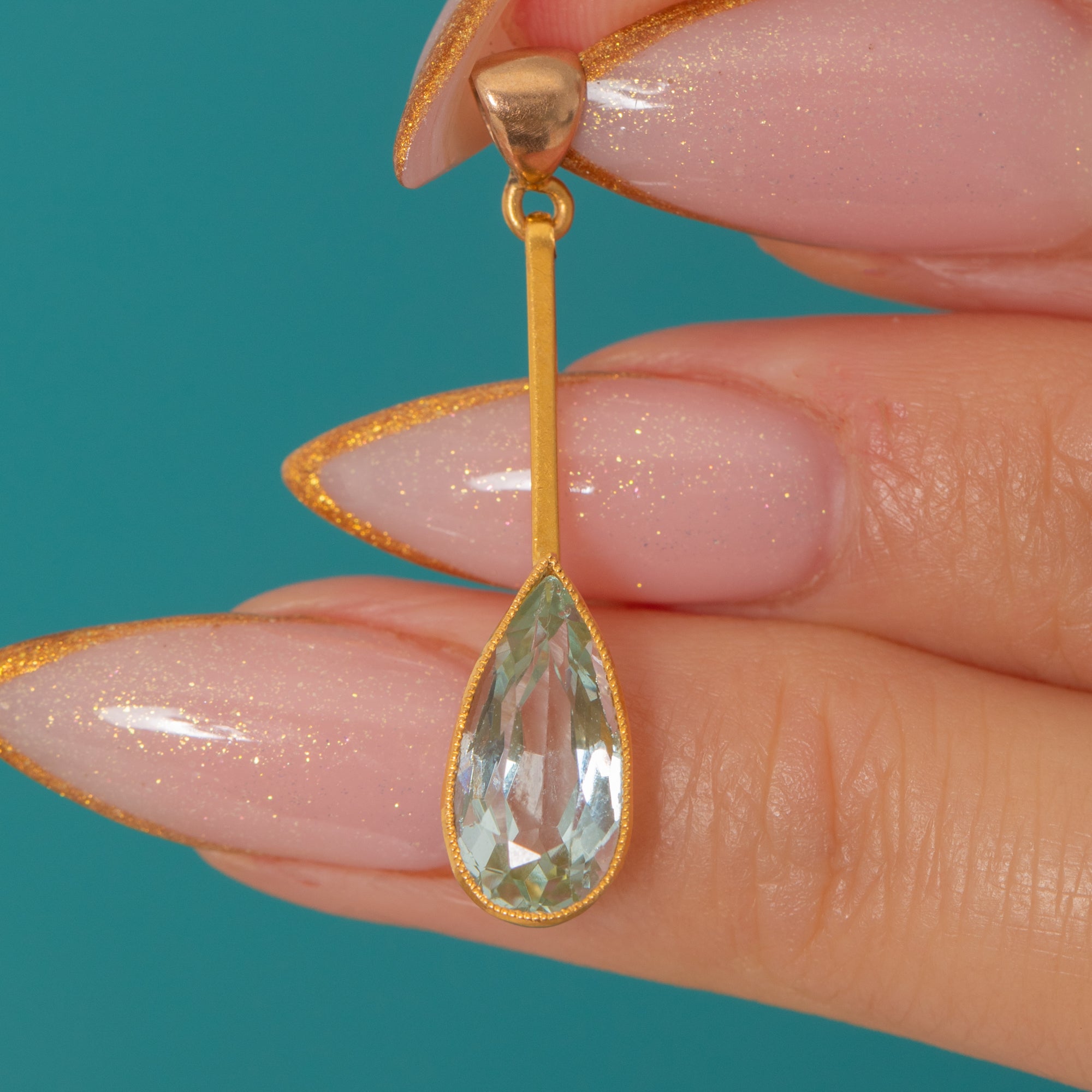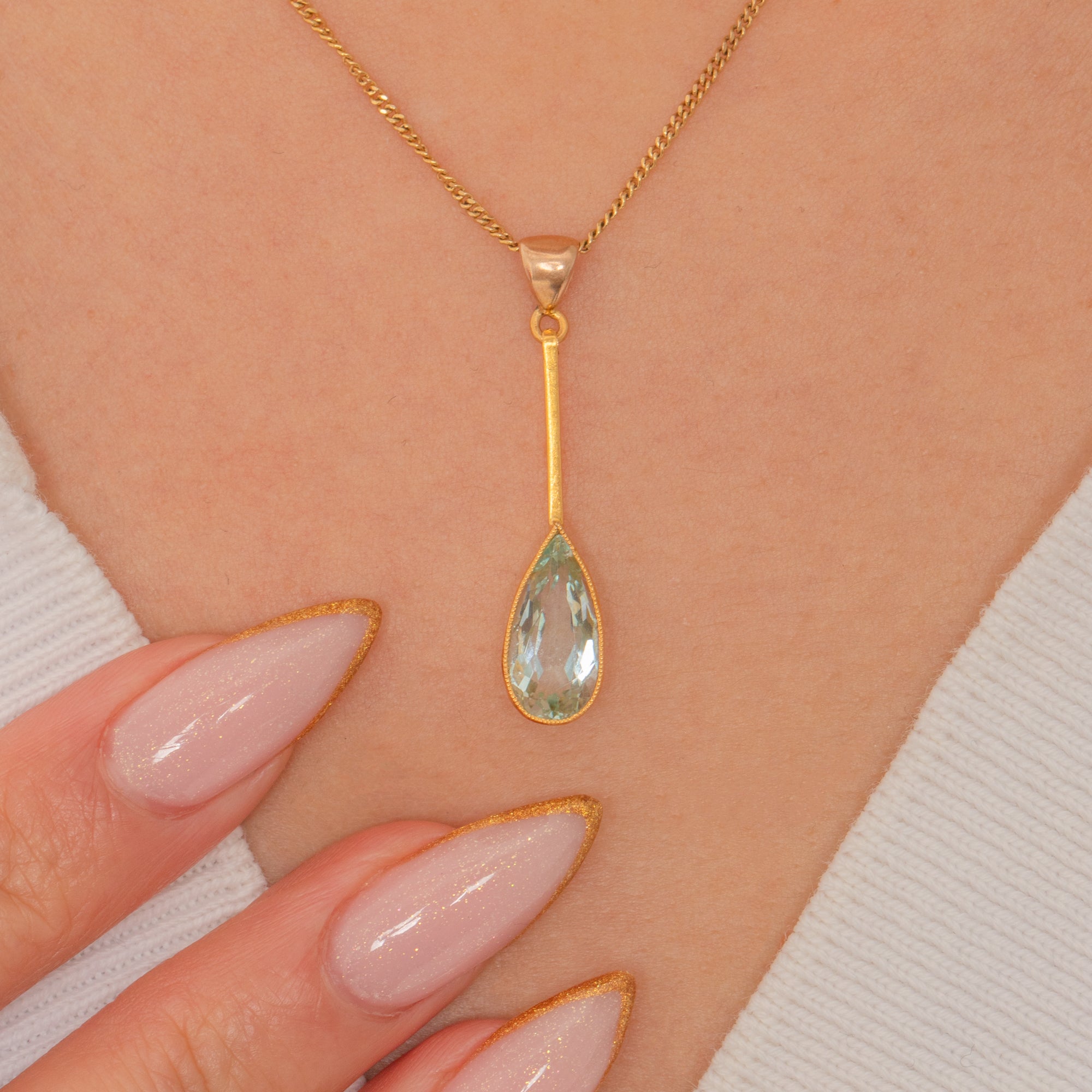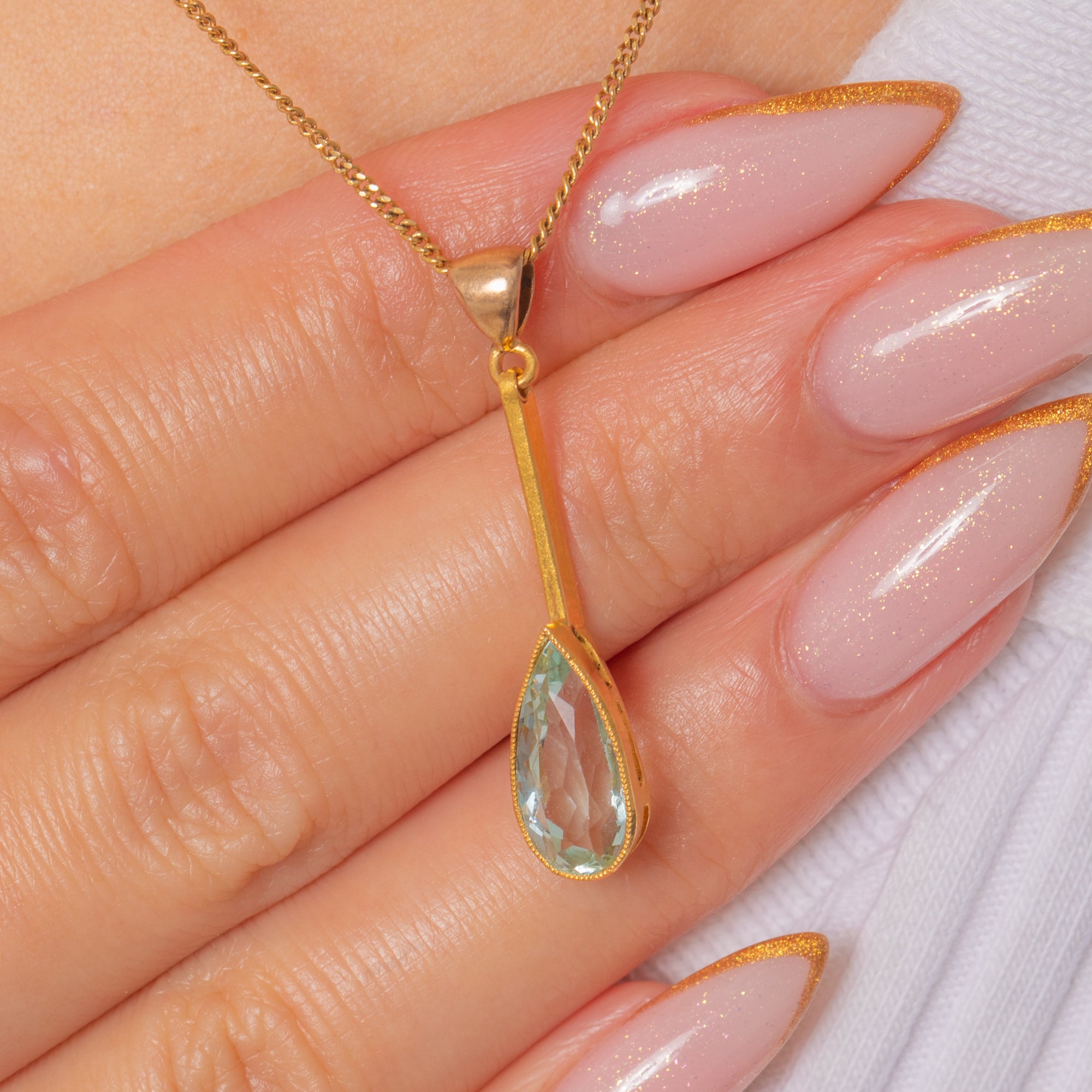 This graceful Edwardian pendant features a luminous natural Aquamarine weighing approximately 1.50ct, cut in a refined teardrop shape.