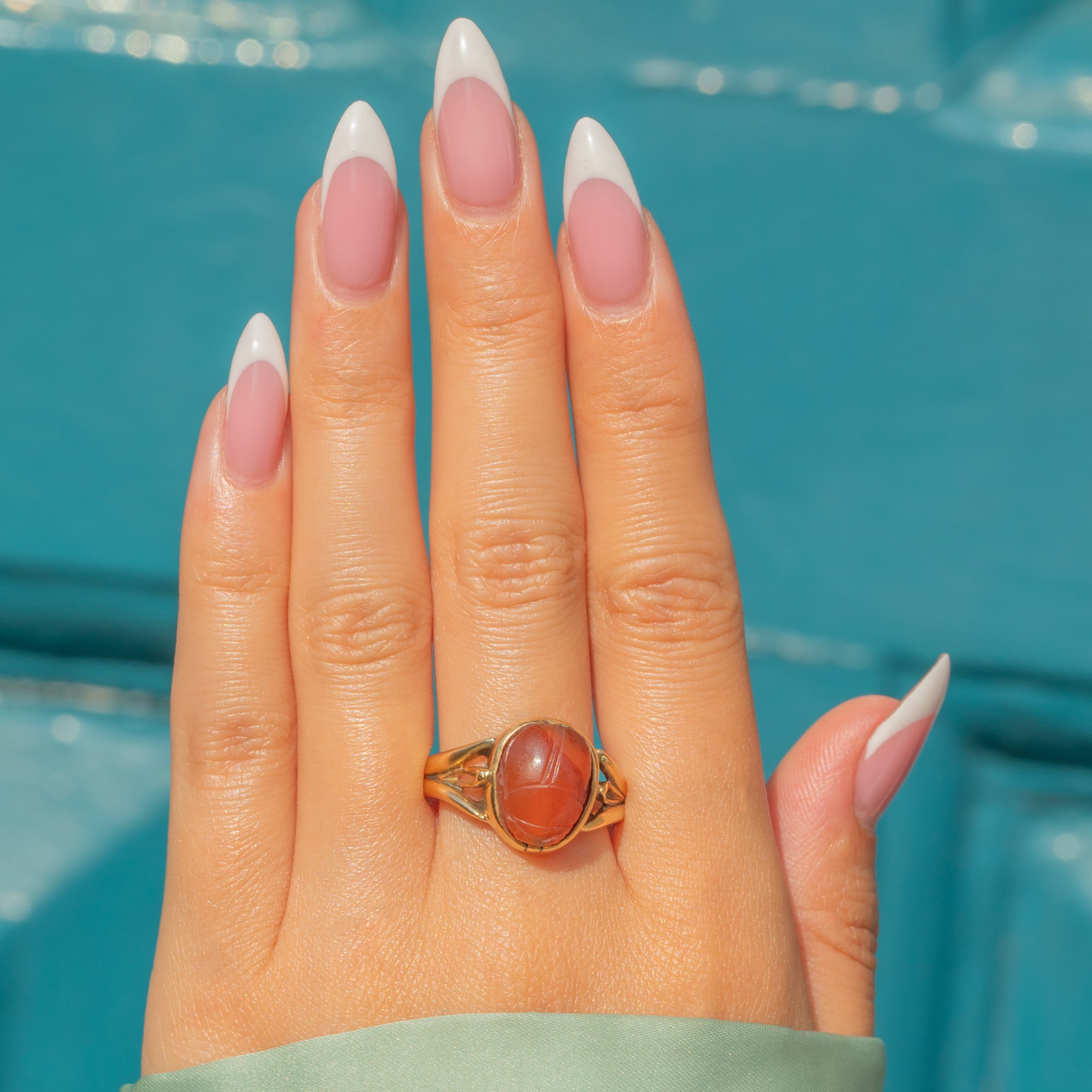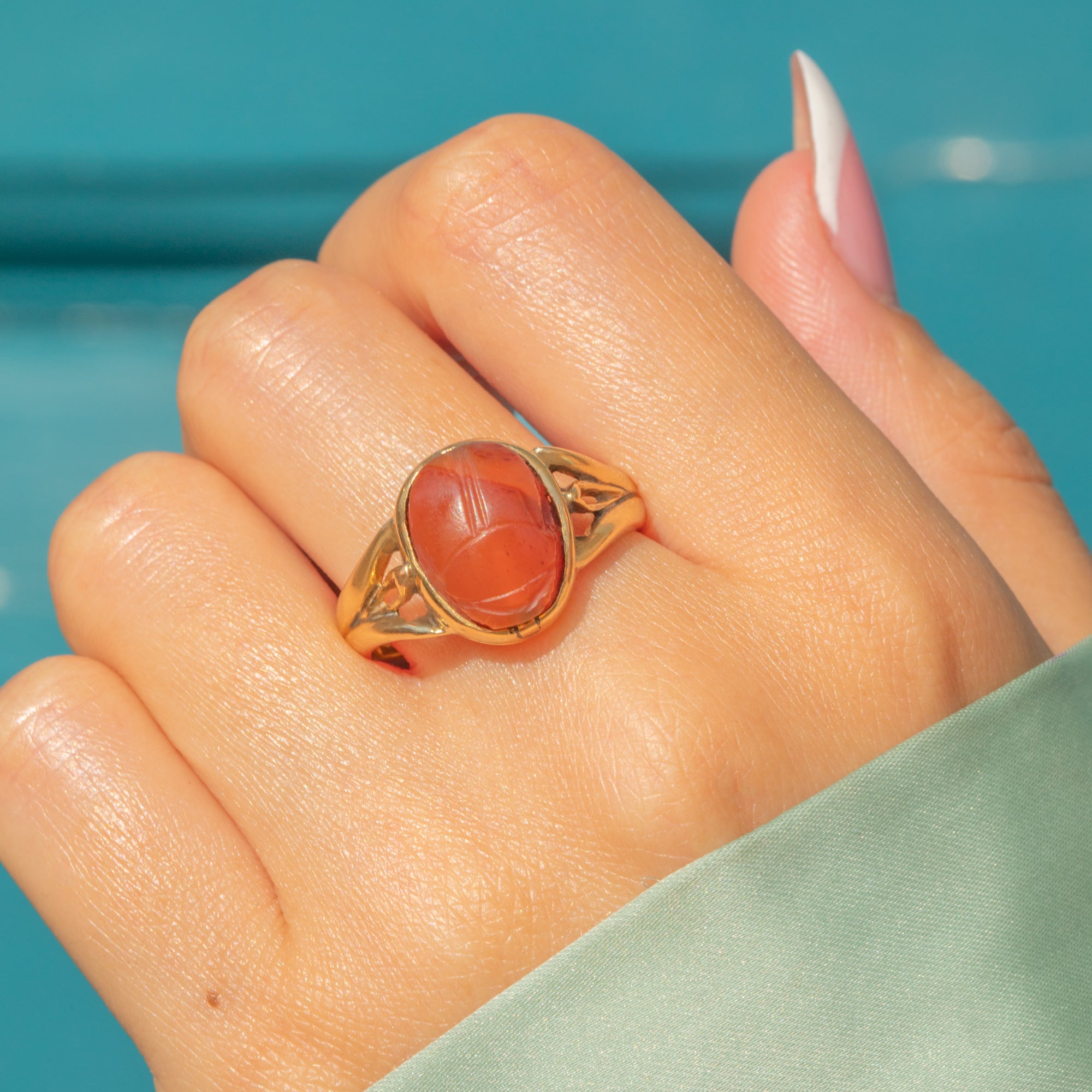This vintage 18ct Gold Archaeological Revival ring features a finely carved Agate scarab, inspired by Ancient Egyptian symbolism of protection and rebirth.