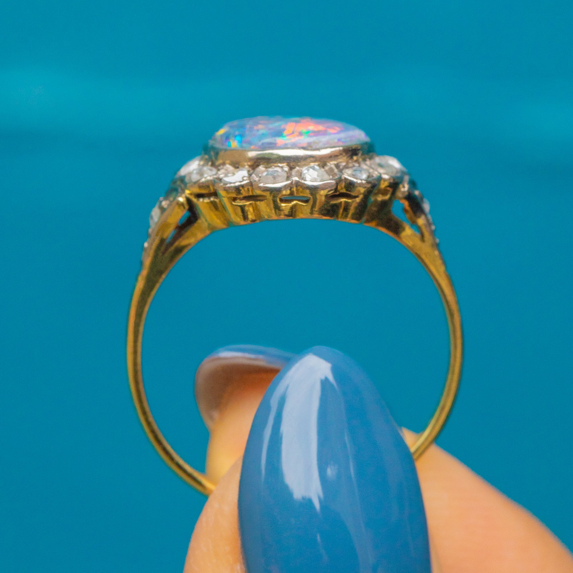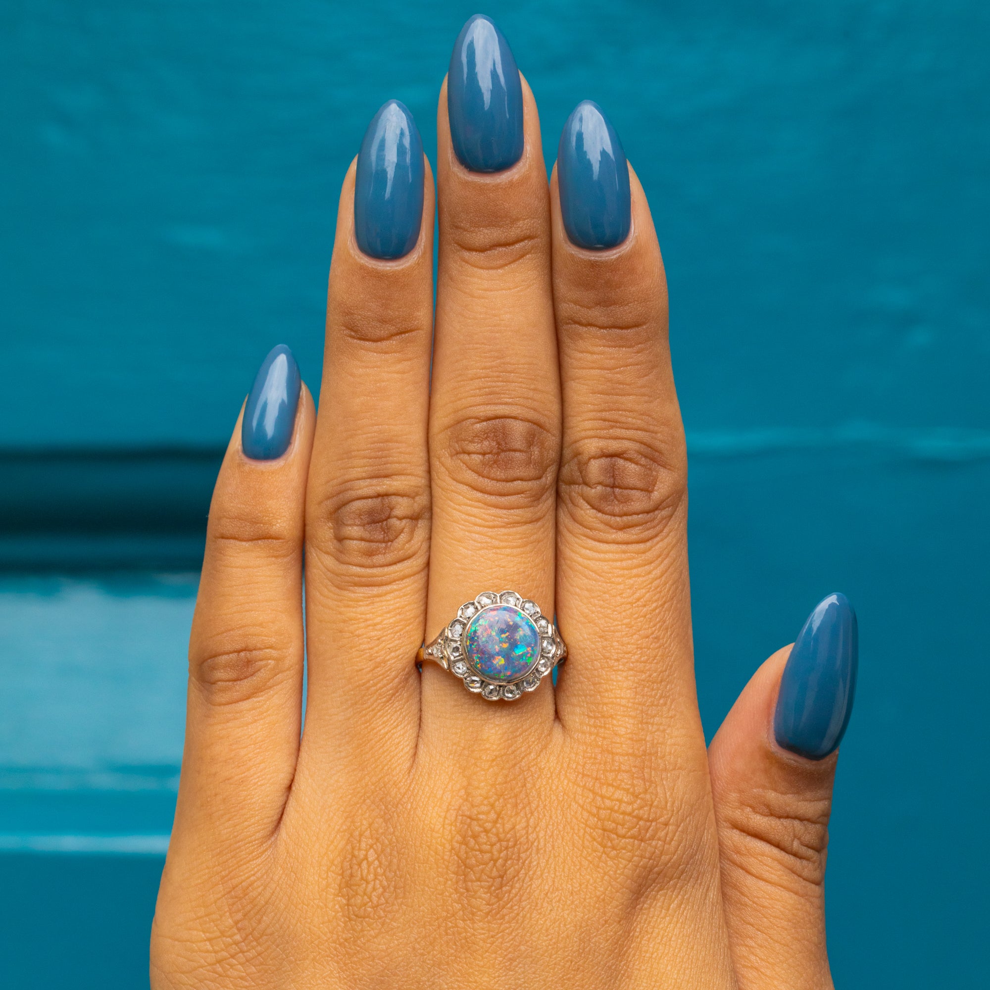 With authentic black Opals almost always sourced from the outback of Lightening Ridge Australia, this black Opal Diamond ring is a rare beauty that will take pride of place within your antique jewellery collection!