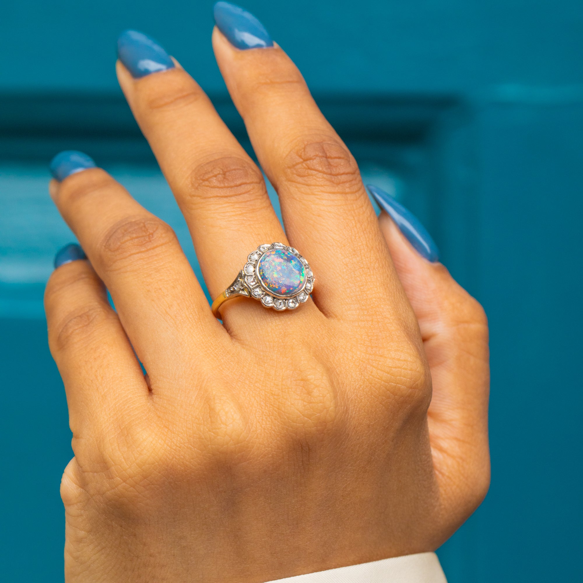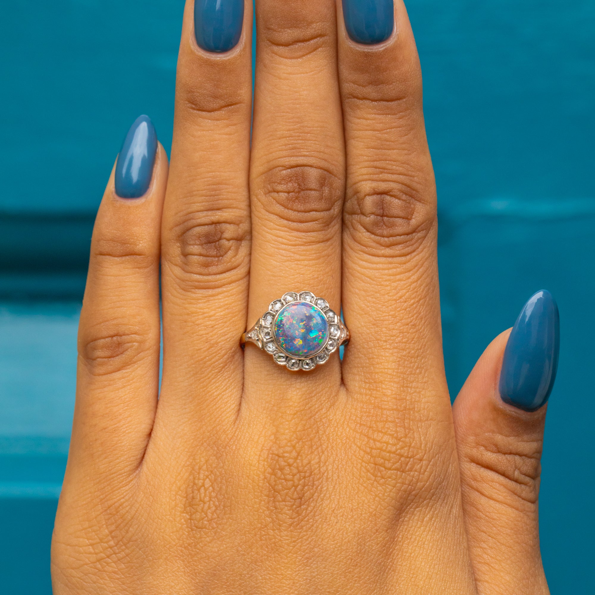 The feminine floral form of this antique Opal ring is complete with rose-cut Diamond petals, each one flaunting a unique and charismatic sparkle, matched by her Diamond-encrusted shoulders. Bound together by 18ct White Gold, the mesmerising cluster is met with a buttery 18ct yellow Gold shank, gliding onto your hand a dream.
