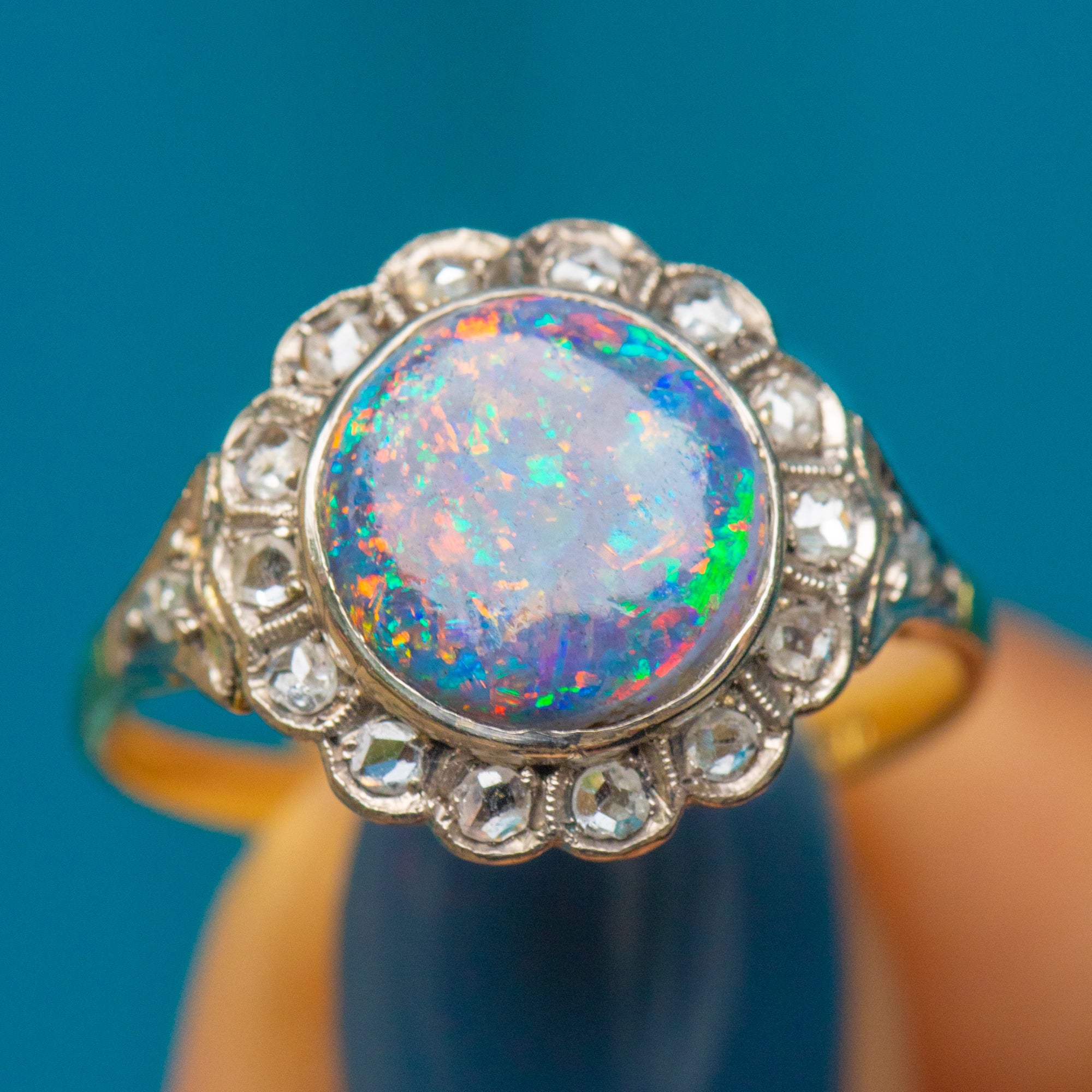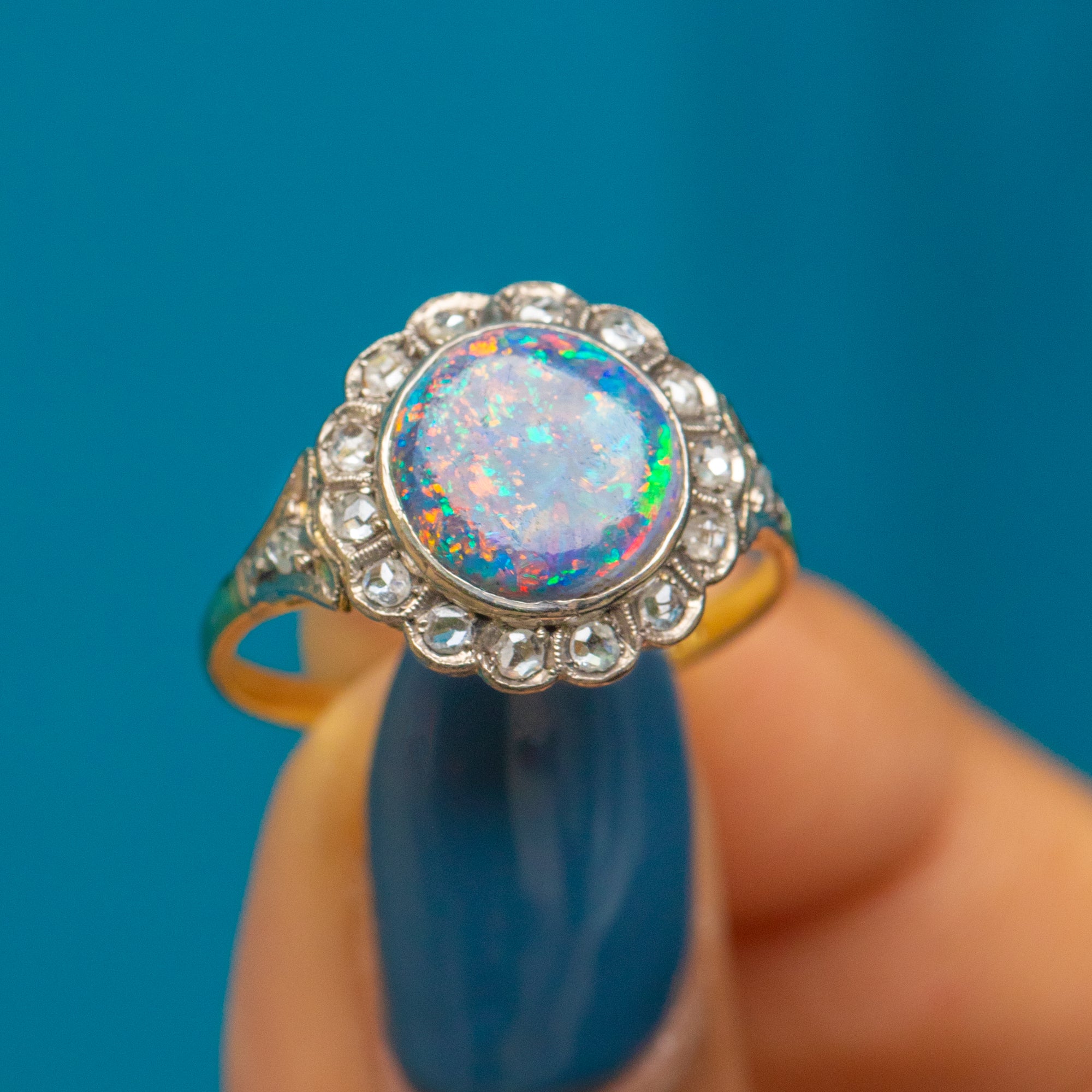 EXCELLENT. We are pleased to present this 18ct Gold black Opal and Diamond cluster ring in excellent condition! The Opal is secure within its bezel setting and has an enticing play of colour. The back of the Opal has some of its natural potch present, from where it was naturally created, but this is just a nod to Mother Nature's capabilities! Each rose-cut Diamond is present and secure, with a subtle but valuable sparkle. The ring band has retained good form, with both the yellow and white 18ct Gold retaining a great saturation. With a modest profile, she is easy to wear and deserves to be worn as a stand-alone piece!