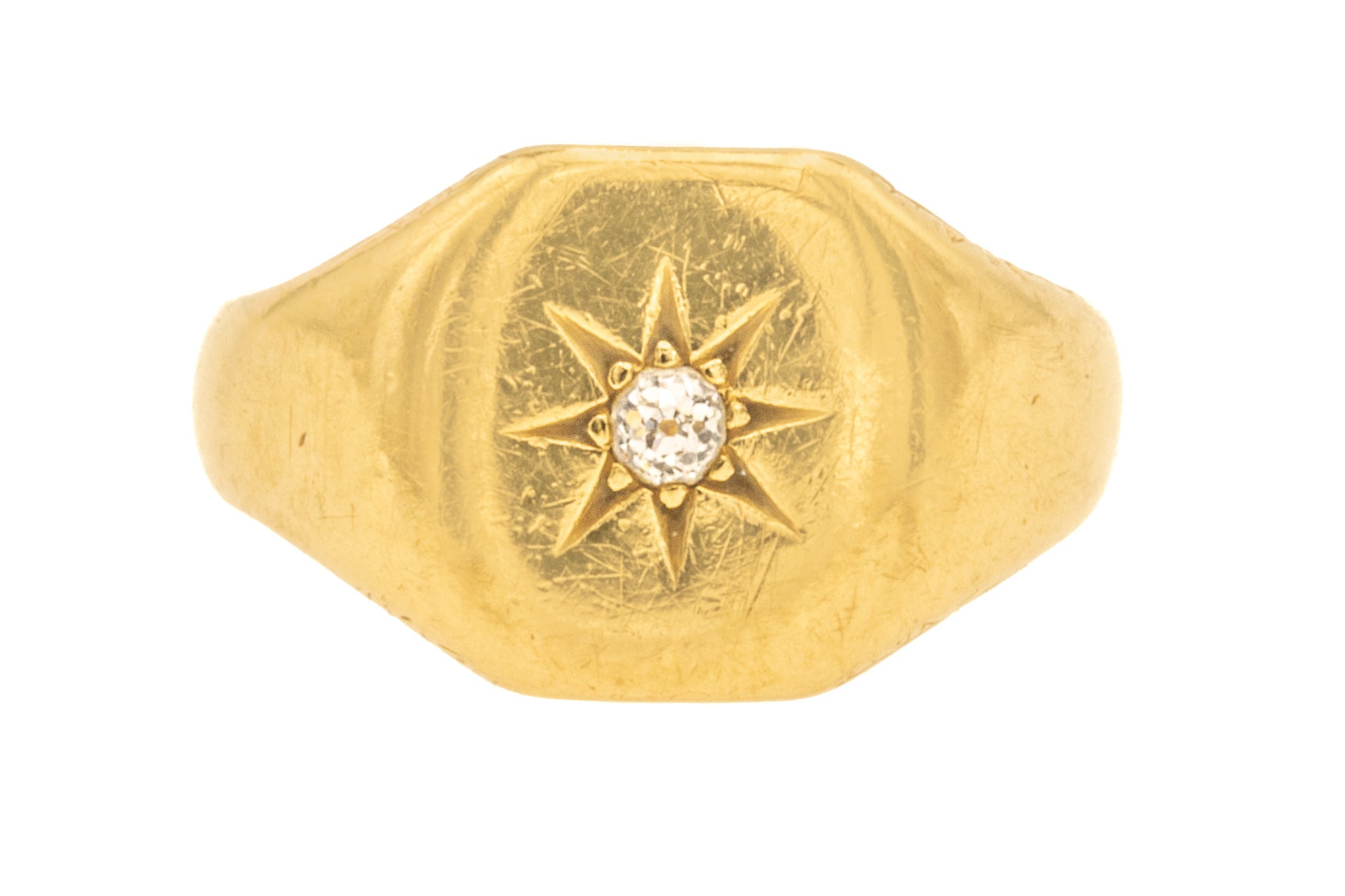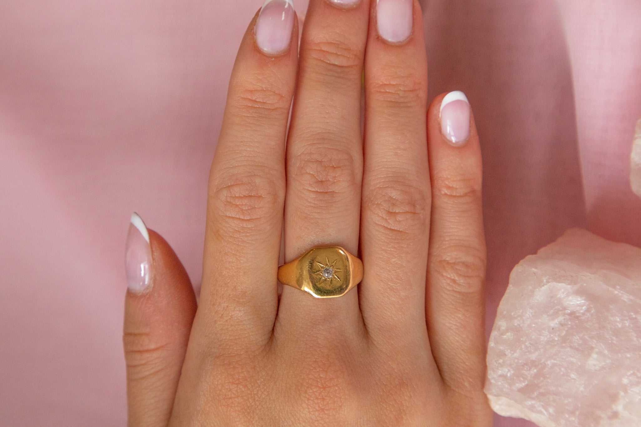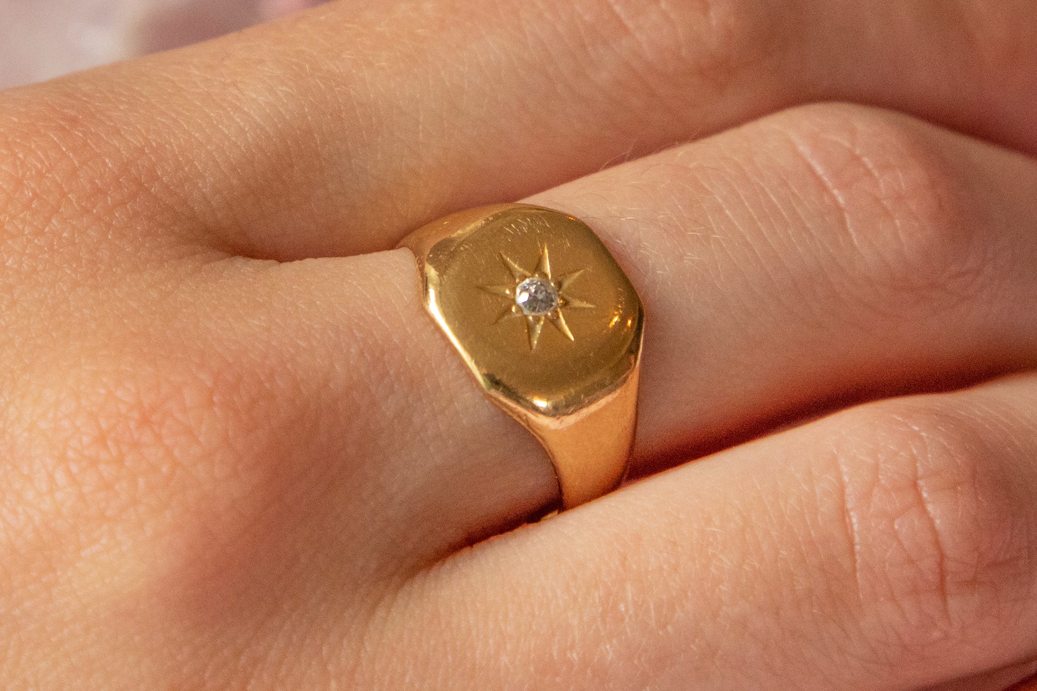 VERY GOOD: This 18ct Gold Diamond 'star set' signet ring is in very good condition throughout. Her highly saturated 18ct Gold possesses that desired buttery hue. A dream to wear, she effortlessly glides onto the hand ensuring comfortable wear. Engraved detailing has worn from the edges of the ring face, however it is only evident they used to be present under close inspection. Her Diamond is bright, super secure in her star set settings, so you can wear with the upmost confidence! Signet rings are timeless, and we think this celestial beauty is just exquisite!
