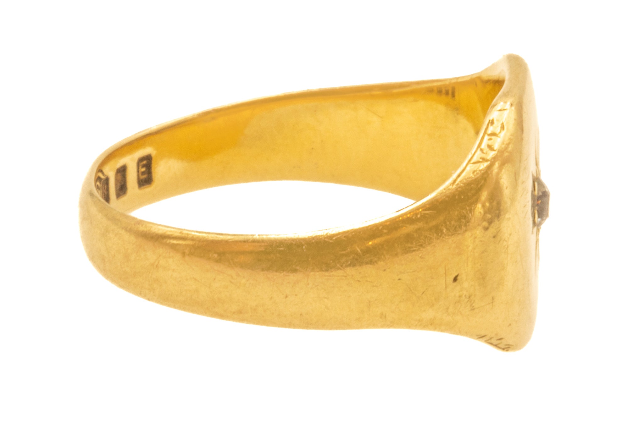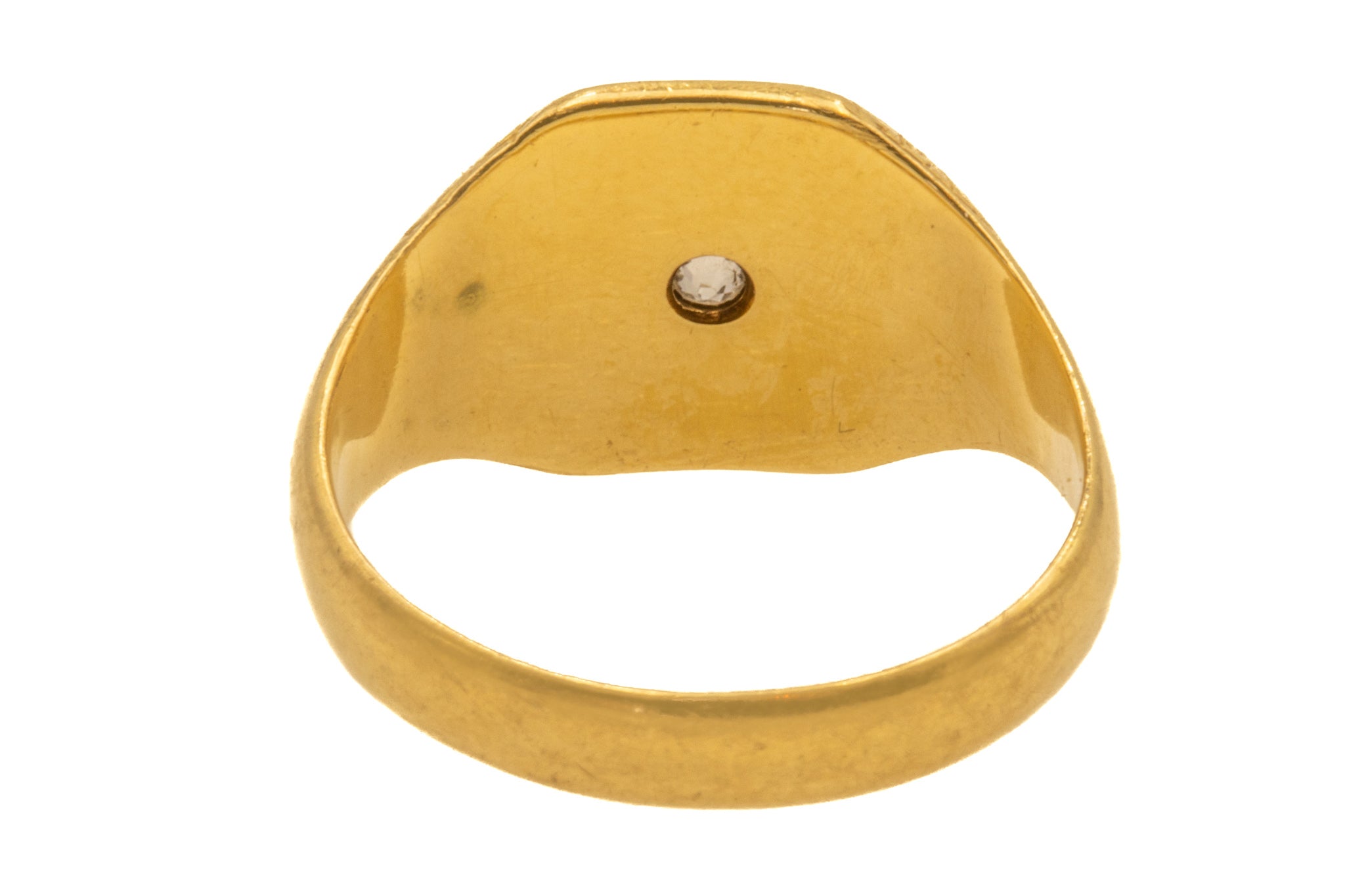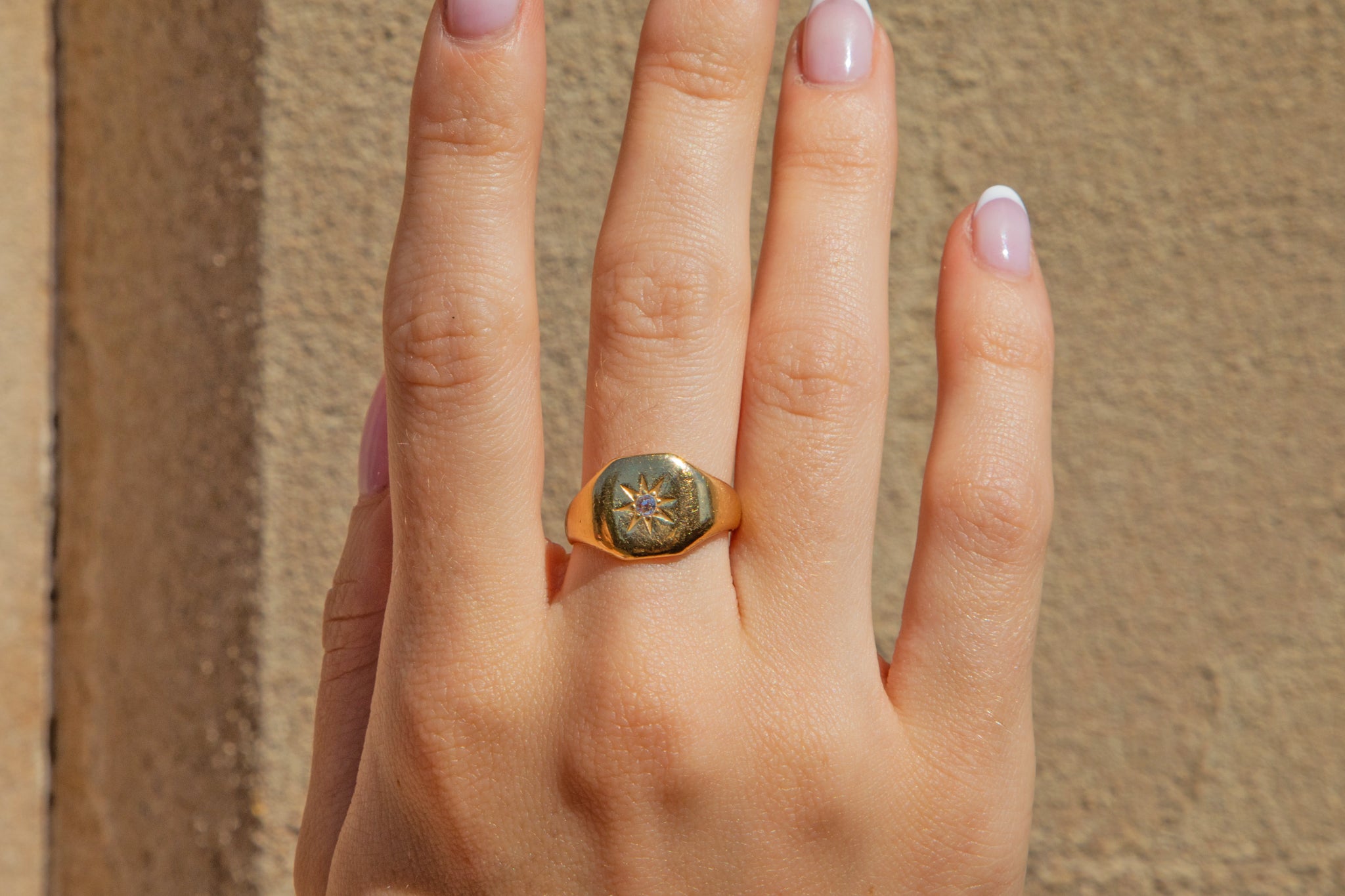 VERY GOOD: This 18ct Gold Diamond 'star set' signet ring is in very good condition throughout. Her highly saturated 18ct Gold possesses that desired buttery hue. A dream to wear, she effortlessly glides onto the hand ensuring comfortable wear. Engraved detailing has worn from the edges of the ring face, however it is only evident they used to be present under close inspection. Her Diamond is bright, super secure in her star set settings, so you can wear with the upmost confidence! Signet rings are timeless, and we think this celestial beauty is just exquisite!