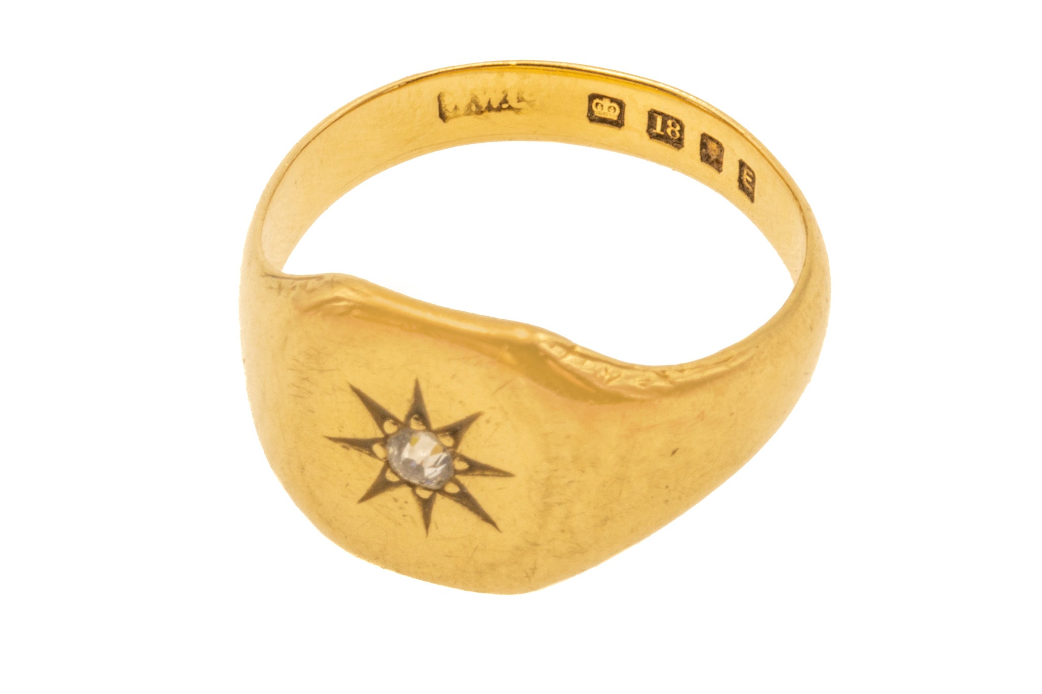 This 18ct Gold Diamond 'star set' signet ring is simply irresistible! Her sumptuous 18ct Gold ring face is inlaid with a twinkling Diamond, well-set within a "star" flush setting. Fully hallmarked, we can date this beauty back to the mid 20th century.